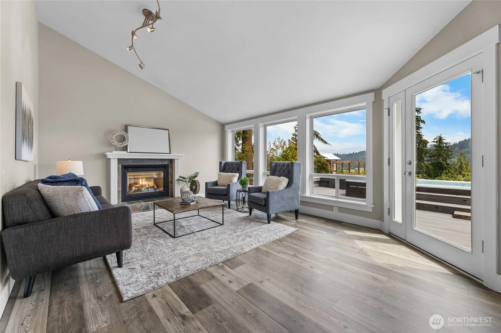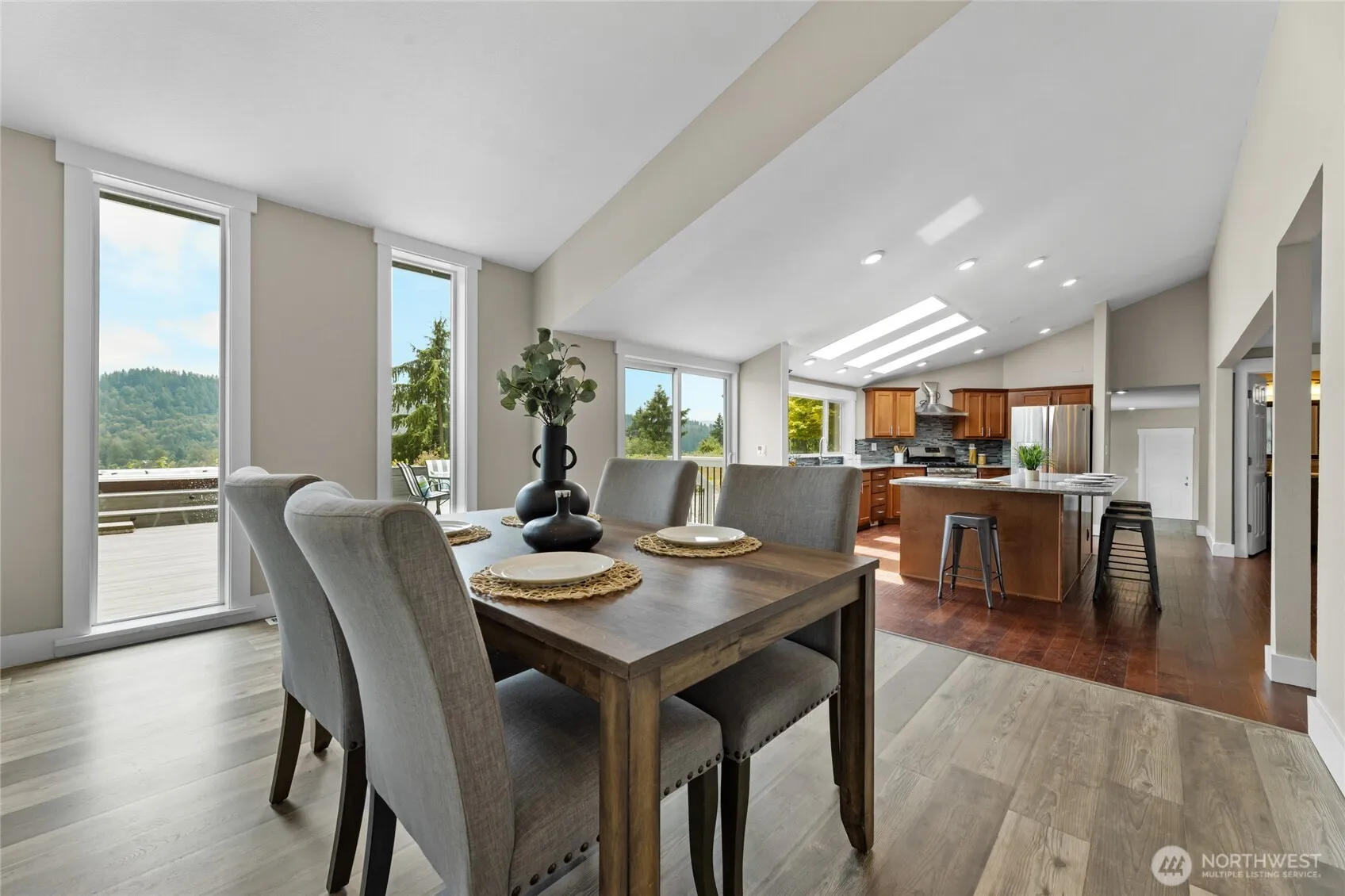 Enjoy incredible views of the foothills and Mt. Rainier from this private home nestled in a sought-after, peaceful neighborhood above South Prairie Creek. Surrounded by evergreens and abundant wildlife—including deer, elk, hawks, and eagles—this setting offers a rare connection to nature. The flexible layout features a gourmet kitchen, large rec room, and potential for multi-generational living. Updates include new carpet, paint, and flooring. Outside, relax on the spacious deck and large patio with a swim spa and hot tub. Additional highlights include an oversized garage, circular driveway, RV parking, chicken coop, and a sunlit yard perfect for a garden.