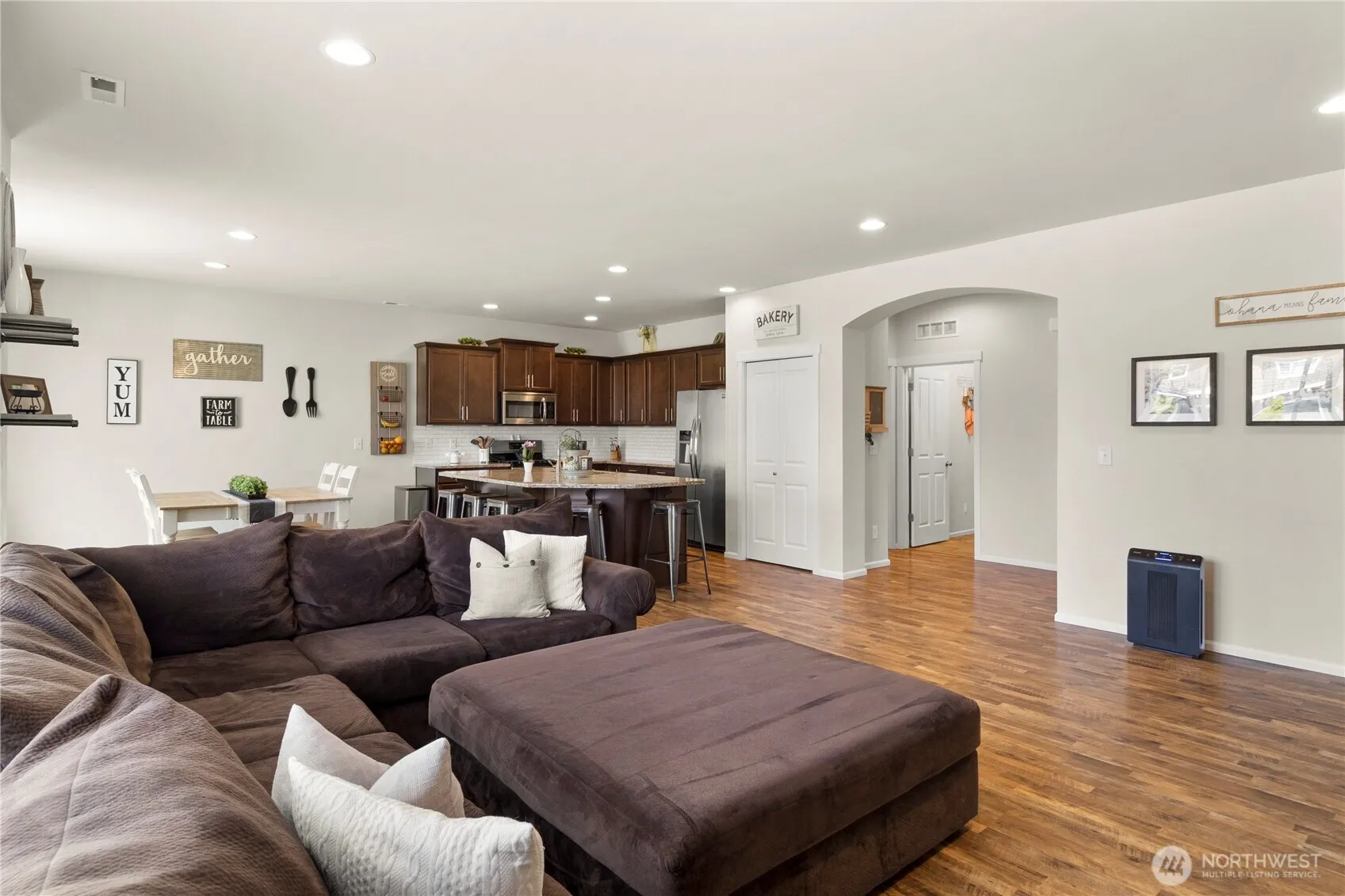 Welcome to this beautifully cared-for home on a peaceful corner lot, W/ greenbelt privacy, extra parking, & a walking path to the river, plus a fully fenced backyard—perfect for gatherings. Inside offers 2,668 sqft of thoughtful space. The open main level features a cozy gas fireplace, dining area, & kitchen W/ SS appliances, granite countertops, & pantry. A main floor office W/ closet & nearby 3/4 bath is ideal for working from home, guests, or multigen living. Upstairs has 4 more bdrms, including a spacious primary suite W/ 5-piece bath & walk-in closet, + a full hall bath & large bonus room. Brand new carpet & central A/C make it move-in ready for summer. Minutes from shopping, parks, & stunning Mt. Rainier views—this home has it all!