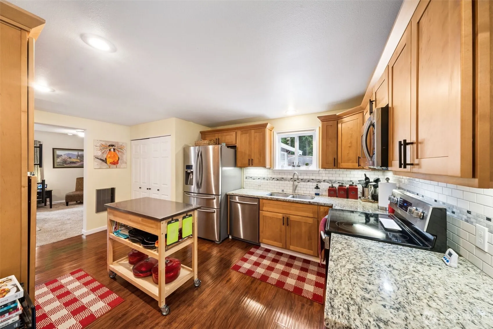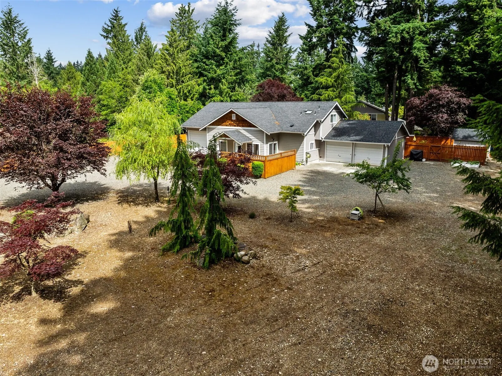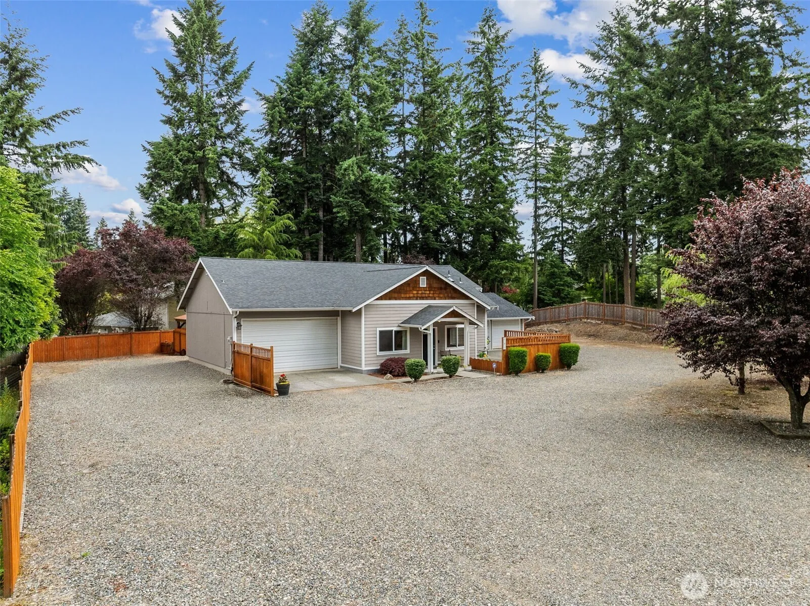 Nestled on nearly three-quarters of acre, this private three-bedroom, two-bath home offers peace and tranquility. The beautifully landscaped grounds feature a covered patio, gazebo with hot tub, sprinkler system, and RV parking. This home complemented by two double car garages, providing over 1,132 square feet of space with 50-amp service. Inside, discover two main-level bedrooms, a living room w/door to the covered patio, kitchen & dining area. Upper level boasts primary bedroom w/ tiled bathroom, don’t miss door to attic storage. Hard wired generator. Heat pump keeping you cool those warm summer days. Cement board siding, composition roofing, private septic. Home has been meticulously maintained, ready for you to just move in and enjoy!