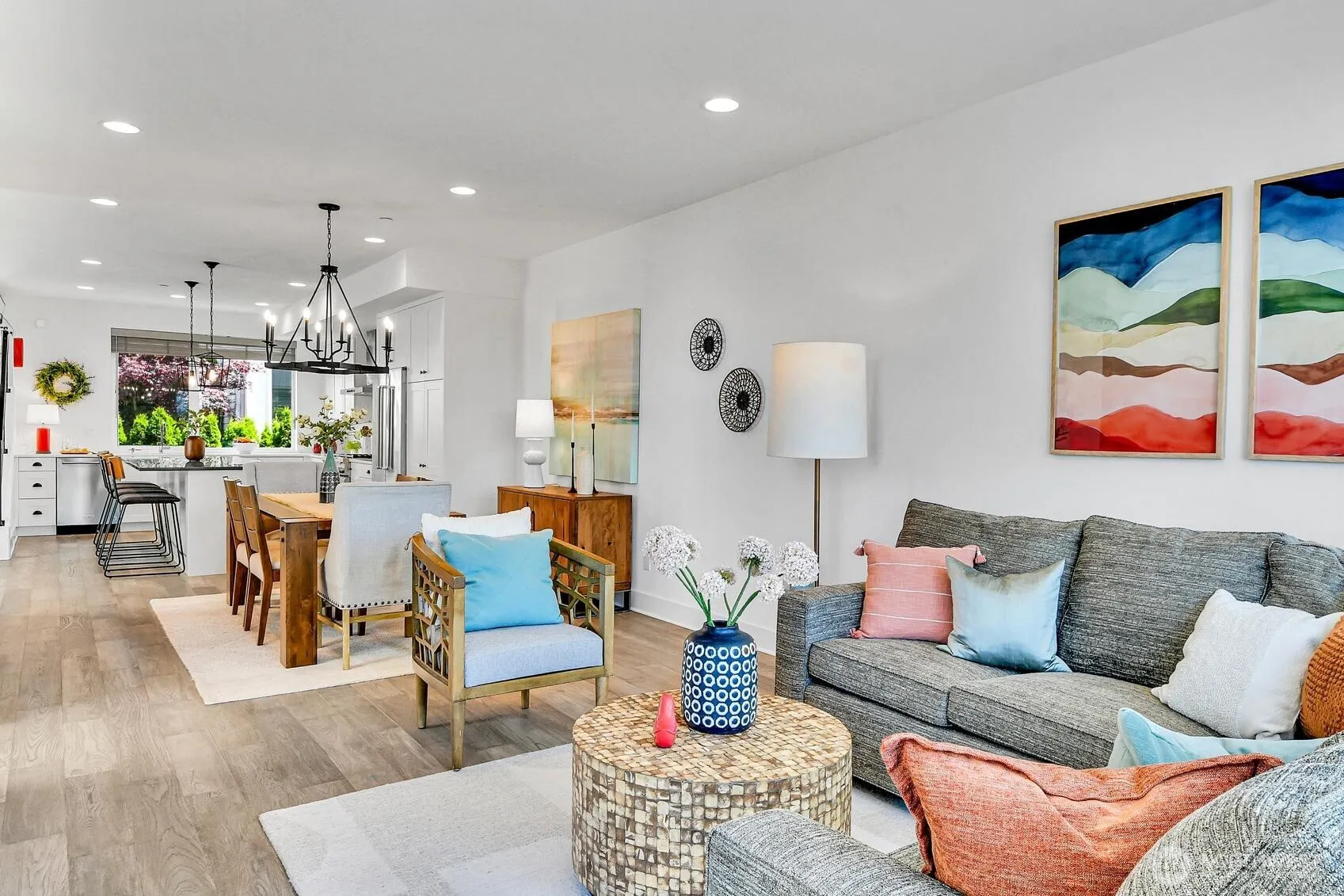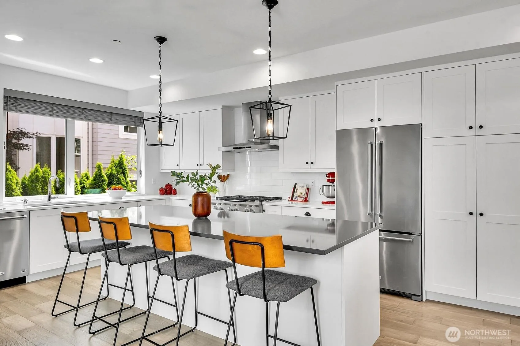 Serene Townhome w/ Beautiful Sound and Mountain Views on a quiet street. 3 bed 3.25 bath inc guest room with full bath on entry level.Main level features a seamless open floor plan w/ living and dining area office or reading nook & Kitchen. Kitchen showcases an enormous island perfect for entertaining. SS appliances, inc gas range/ microwave drawer & abundant cabinetry. 3rd level includes bedroom, full bath, laundry rm and lg primary w/ gorgeous views of the Sound; luxurious bath and huge walk in closet. Lg private rooftop deck w/ gas hookup and water highlight the sweeping sound and mountain views and garden potential. This special home is surrounded by nature yet minutes from the ferry 1/5 and freeways.Top rated Mukilteo school district.