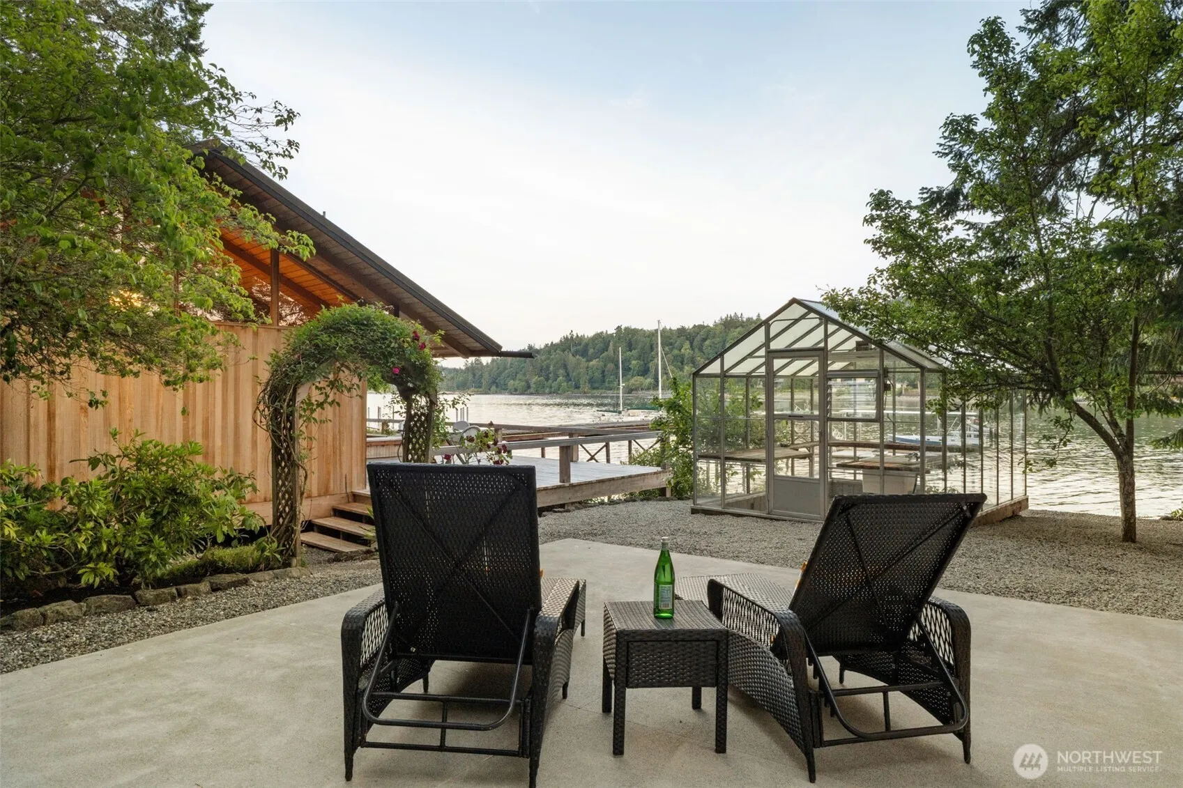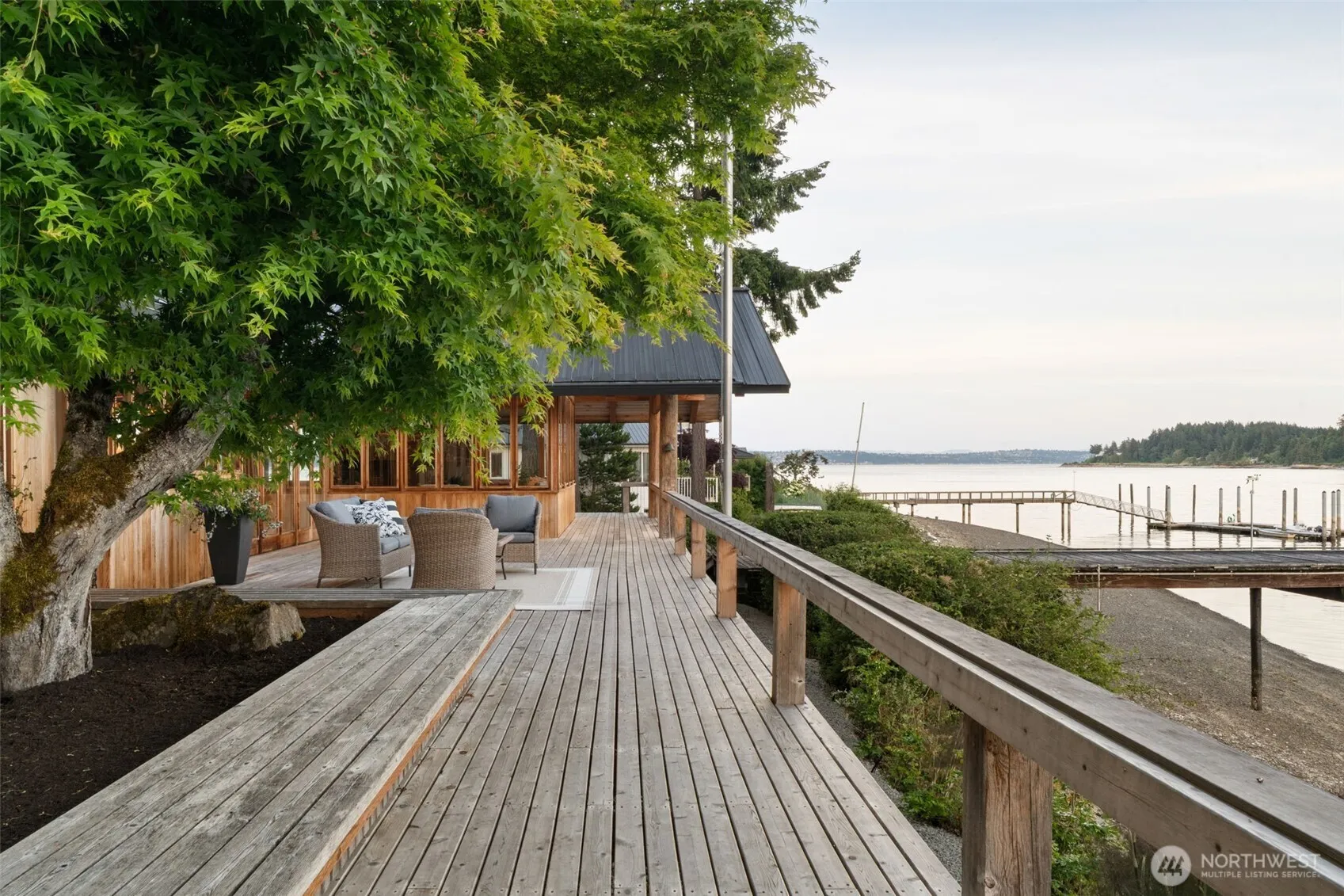 Experience serene waterfront living nestled in Blakely Harbor, providing the perfect setting for boating, kayaking, paddleboarding, and enjoying the natural beauty of the Pacific Northwest. This stunning one story, mid-century-modern home is surrounded by lush greenery, mature landscaping and ample decks to make the most of the dramatic landscape. Large windows, soaring ceilings and striking natural materials provide incredible light and seamless indoor-outdoor flow. The deep water dock provides 234’ feet of moorage. Guest accommodations and bonus space provide additional options for use. Located in a friendly, established neighborhood, this home is ideal for those seeking a blend of quiet retreat and active waterfront lifestyle.