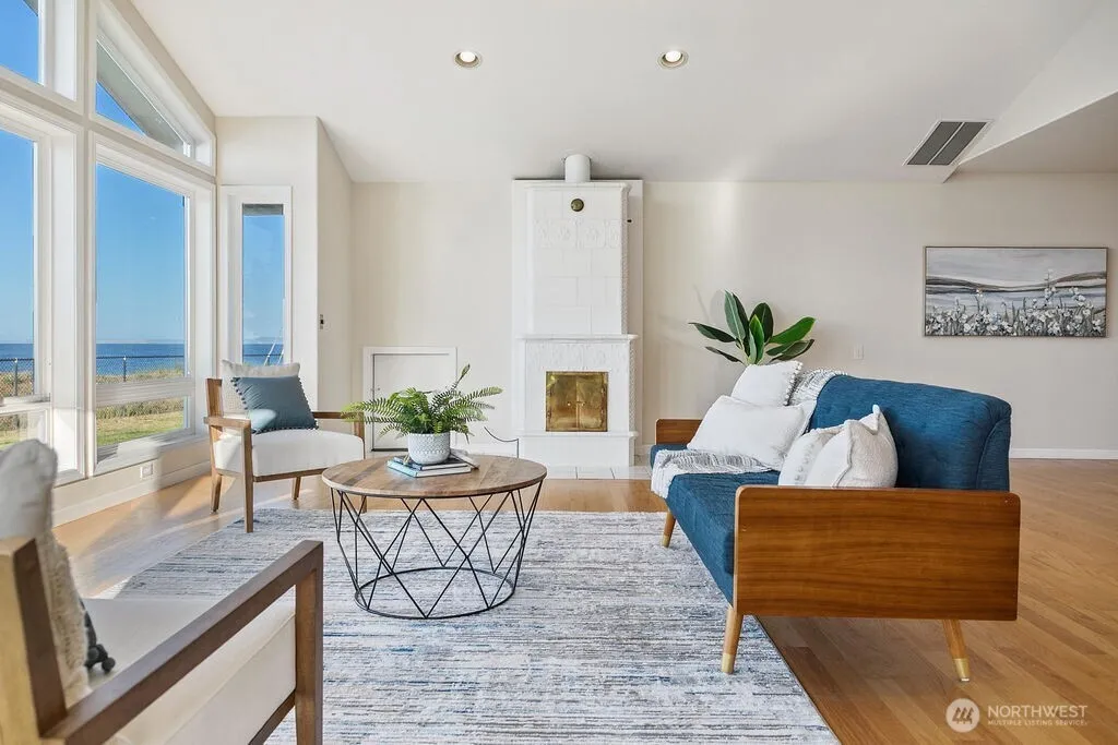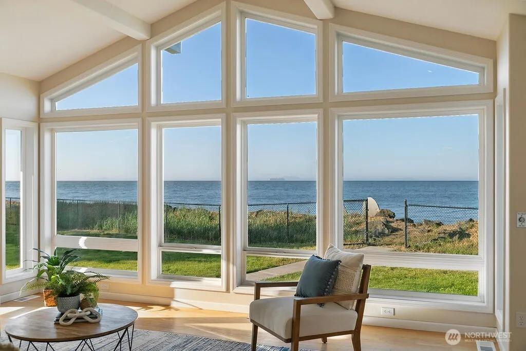 Breathtaking panoramic views of Mt. Baker, the Olympic Mountains, and the Cascades from this stunning waterfront home on 1.9 acres in the sought-after Jamestown Beach area. Newly updated throughout you will love the floor-to-ceiling cathedral windows that frame the beauty of the sound. Enjoy both formal living and family rooms. A large open kitchen features generous dining space and an attached sunroom. The primary suite includes an ensuite bath, while two additional bedrooms and a full bath are conveniently located on the main level. Outside, enjoy a fruit orchard, garden space, and mature landscaping. Property includes a 2-car attached garage plus a detached 3-bay oversized garage for RVs, boats, or hobbies. Your coastal paradise awaits!