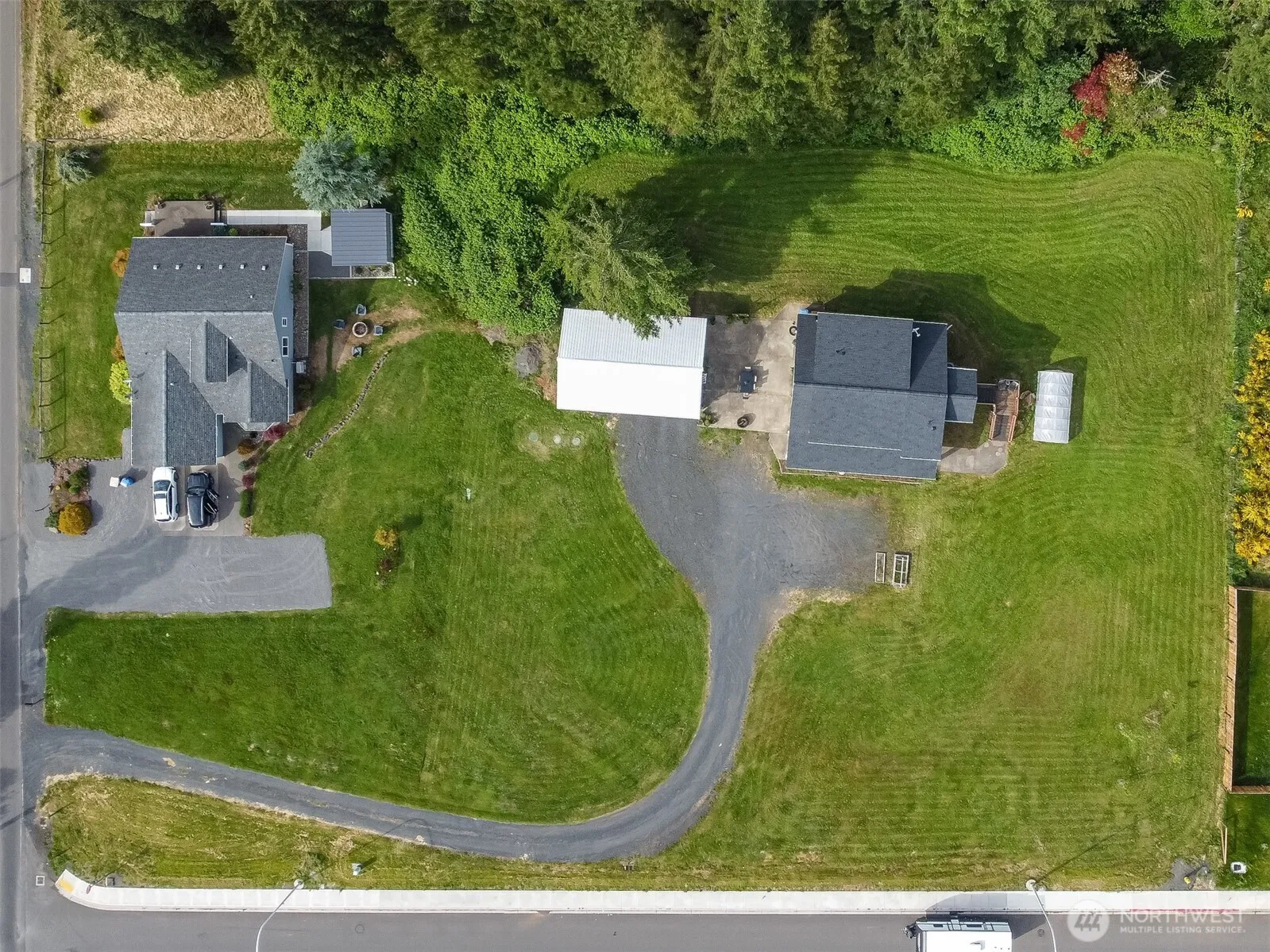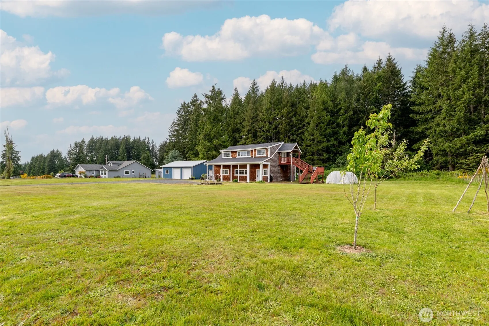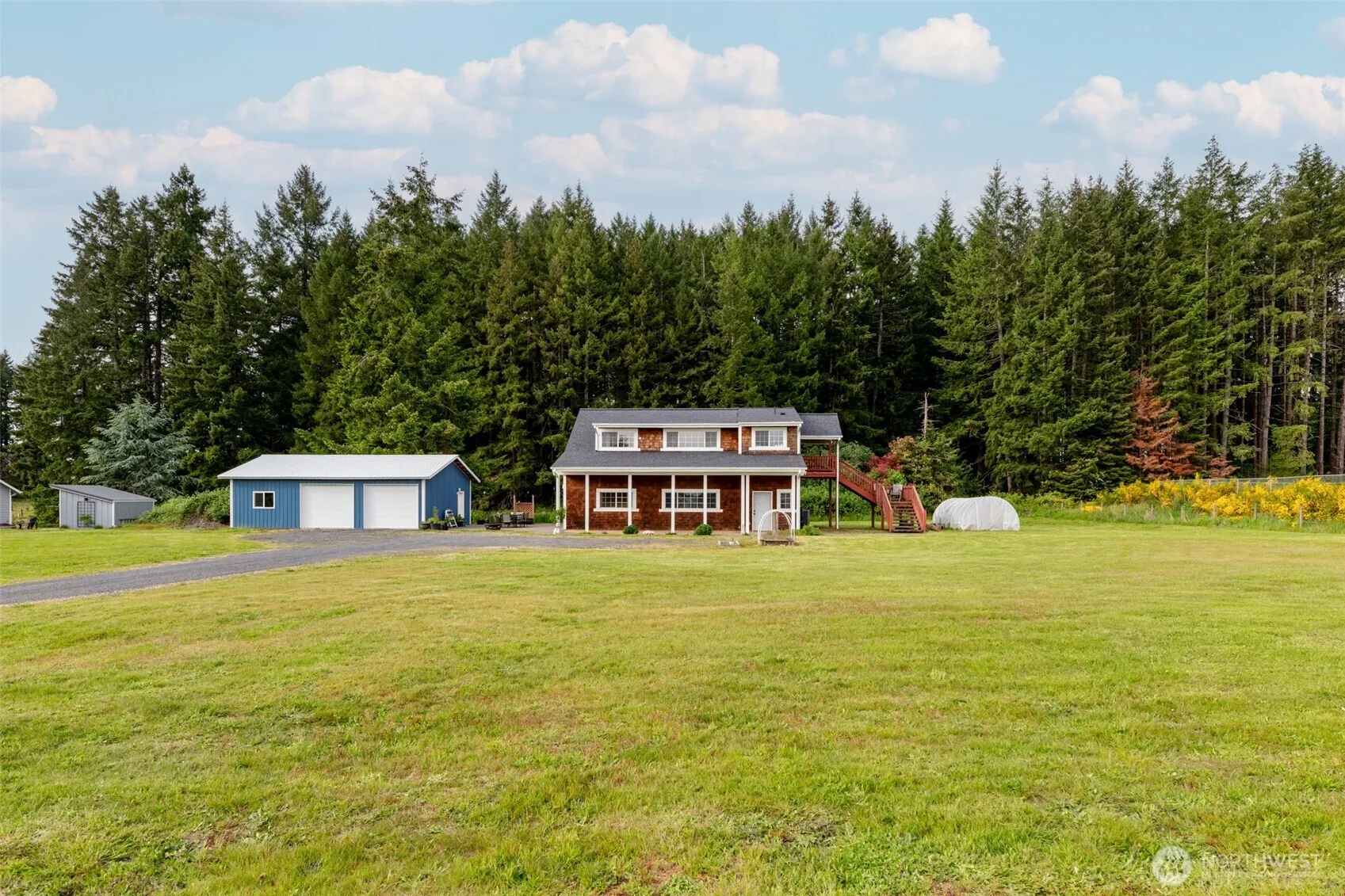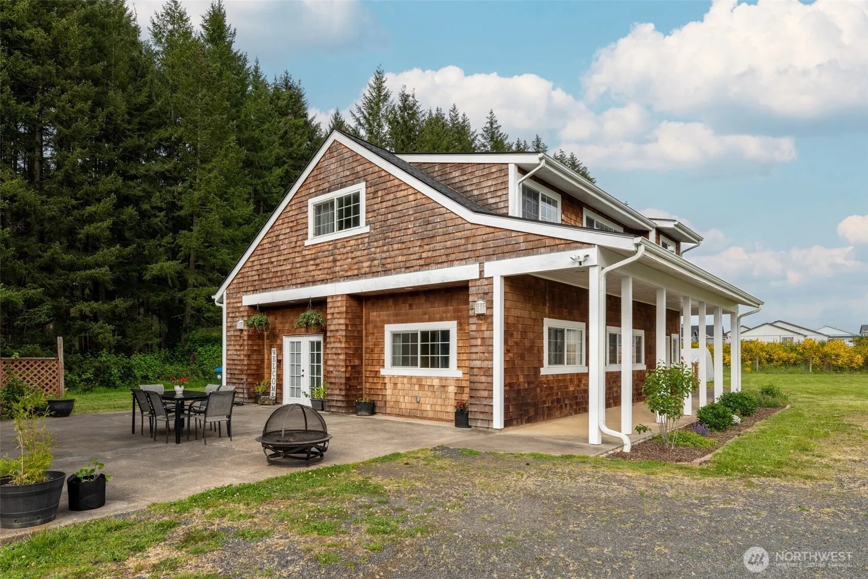 Custom-built Northwest Contemporary home designed to capture light and nature views. The upper-level kitchen, living room, and primary bedroom are perfectly positioned to enjoy the scenery, with French doors leading to a covered deck—your ideal morning coffee spot. The spacious main floor has a generous open-concept layout w/ updated flooring, two guest rooms share the guest bath with a custom tile shower. A large laundry/mud room with ample storage keeps everything tidy and in its place. Outside features a newer 36×24 garage with loft storage and EV charging, a large patio, and over an acre to relax, garden, or play. A new roof in 2023 provides peace of mind. Minutes to I-5 for an easy commute. Come see what makes this home truly special.