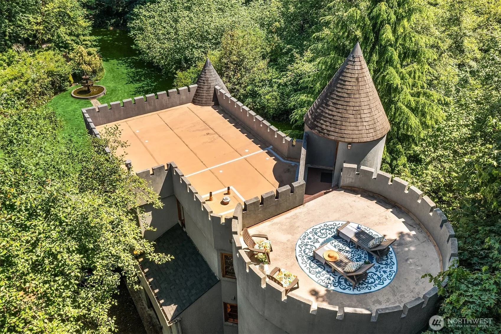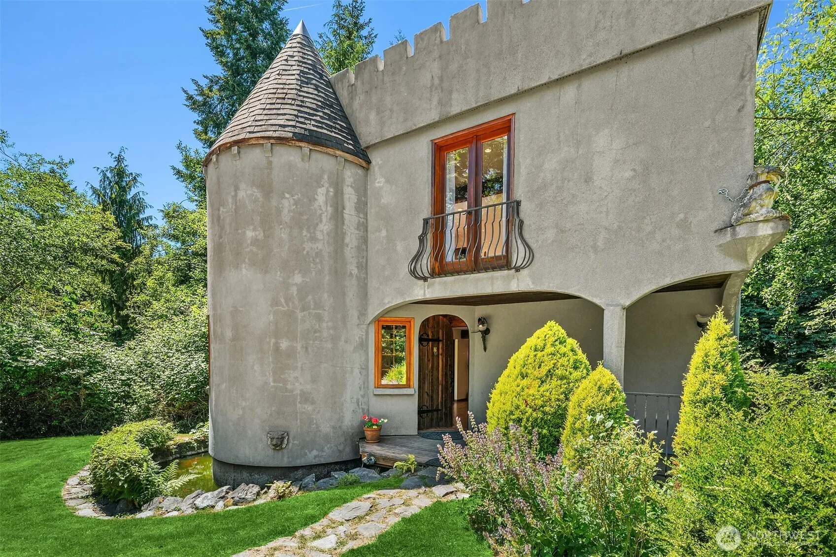 Tucked into the trees behind a gated drive, this extraordinary Vashon Island castle invites you to step into a storybook. With 2,710 square feet of handcrafted space, this 3-bedroom, 2.5-bath retreat offers a rare mix of fairytale charm and modern livability. Settled on nearly 5 private acres, enchanted by turreted towers, Australian cypress floors and a rooftop deck fit for stargazing. Cozy up by the fireplace, descend into the hidden wine cellar, or stroll past the fish-filled moat. Saltillo tile, a private well, and forested seclusion make this a true sanctuary. Whether you’re seeking a whimsical escape, creative sanctuary, or romantic full-time home, this unique property is a once-in-a-lifetime opportunity to live like royalty.