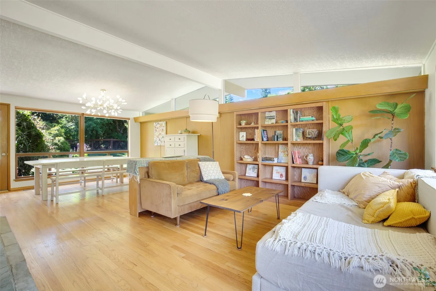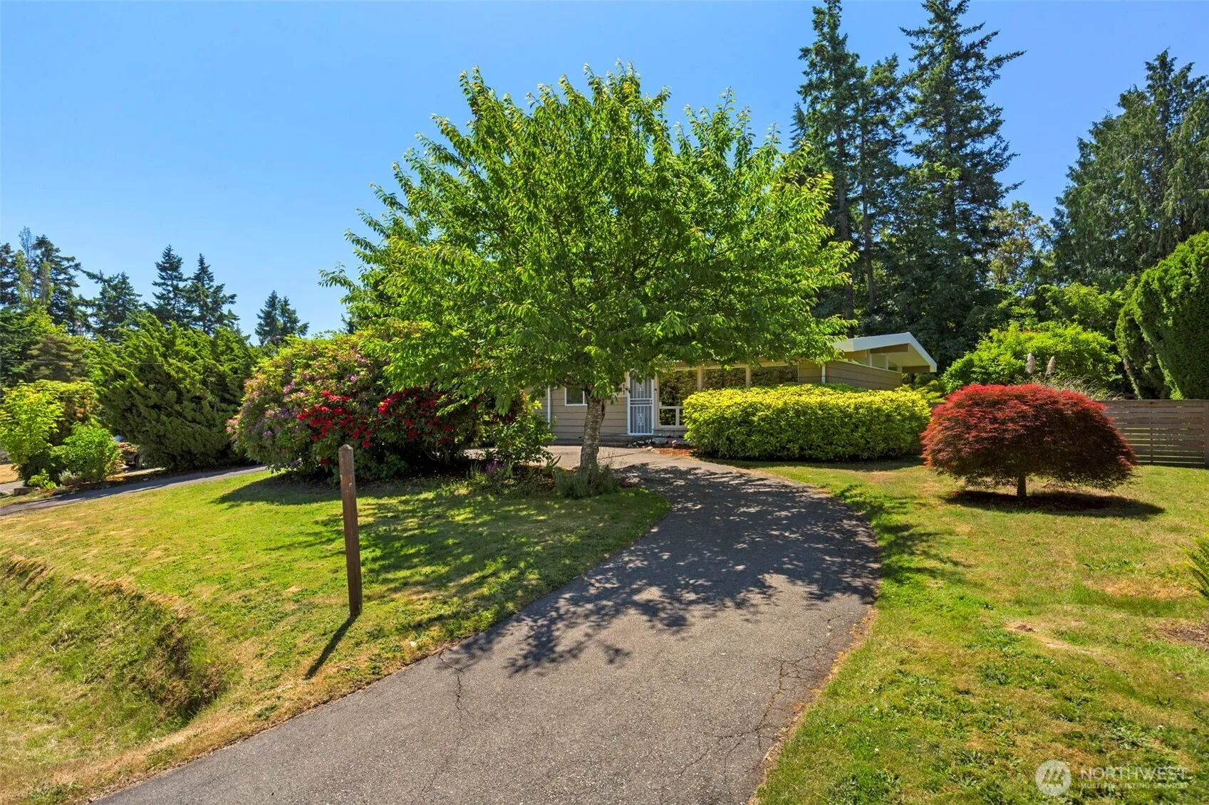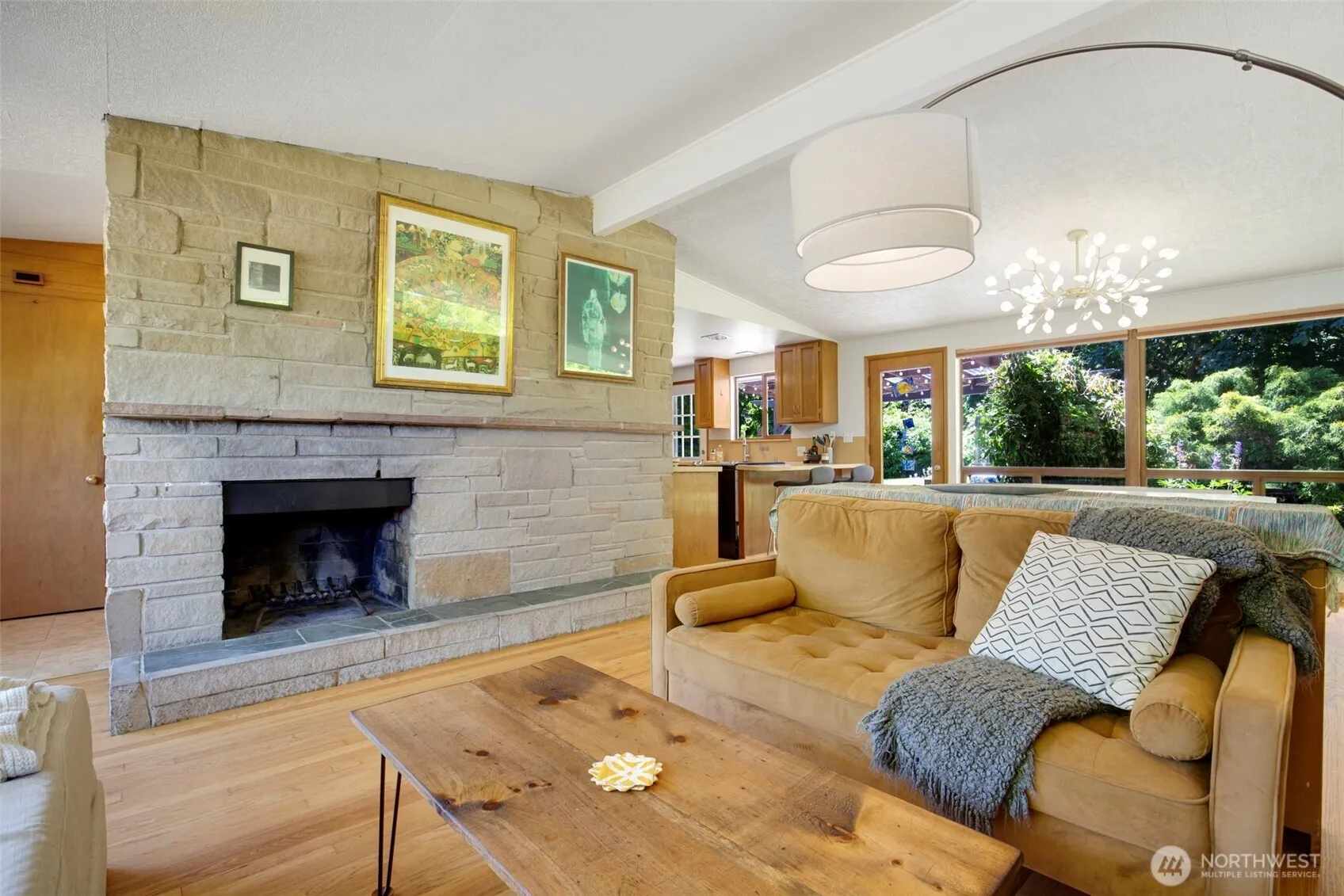 Mid-century gem in desirable Shorewood-on-the-Sound! This rare find offers privacy & possibility, with an open plan, vaulted ceilings, & tall windows for abundant natural light. Hardwood floors & a sandstone fireplace add warmth, while angled ceiling windows enhance its charm. Beyond the foyer, a teak hallway leads to 3BR/1BA. The kitchen & dining area flow to a deck overlooking an idyllic garden with vegetable garden beds, berries, fruit trees & rolling lawn. This fully fenced haven abuts forested Seahurst Park with gorgeous trails to the beach. The circular drive & garage add convenience. A new sustainable heat pump/AC in 2023. Friendly community has private beach & activities—all this a mere 20 minutes to downtown & 12 to the airport.