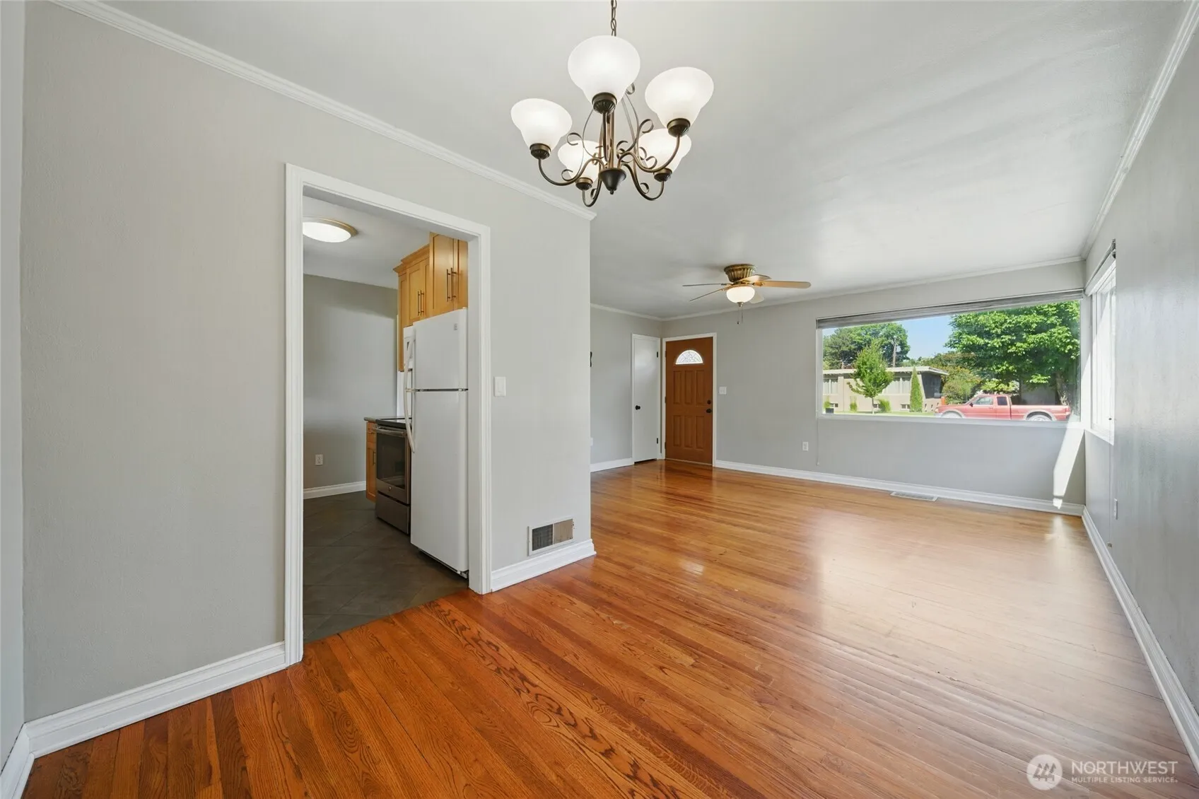 Well-maintained 2-bedroom, 1-bath home with a mix of classic charm and modern updates. Original hardwood floors run through the main level, and large picture windows bring in natural light. The updated galley kitchen is efficient and functional. The basement offers extra space for storage, a home gym, or future expansion. Outside, enjoy the covered patio and fully fenced backyard with underground sprinklers for easy upkeep. With alley access and a detached 2-car garage, there’s plenty of room for parking and storage. Move-in ready with room to grow!