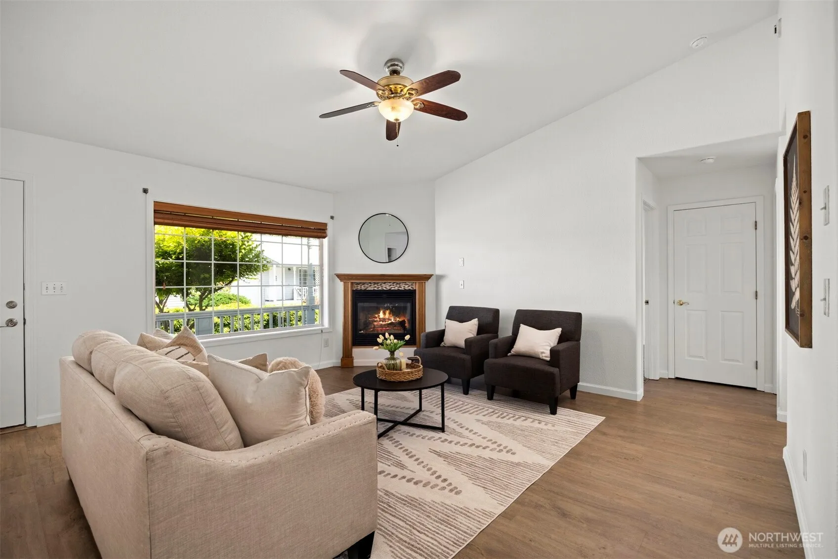 Easy living at an affordable price! This spacious 2-bed, 1.75-bath condo offers 1,346 SF all on one level in a charming, well-kept community. Vaulted ceilings and a bright, open layout create a welcoming feel, featuring a cozy gas fireplace and a south-facing back deck perfect for relaxing or entertaining. The primary suite includes a recessed ceiling and private bath. An attached 1-car garage offers extra storage for added convenience. The low-maintenance landscaping lets you spend more time doing what you love. A rare opportunity for comfort, simplicity, and value—don’t miss it!