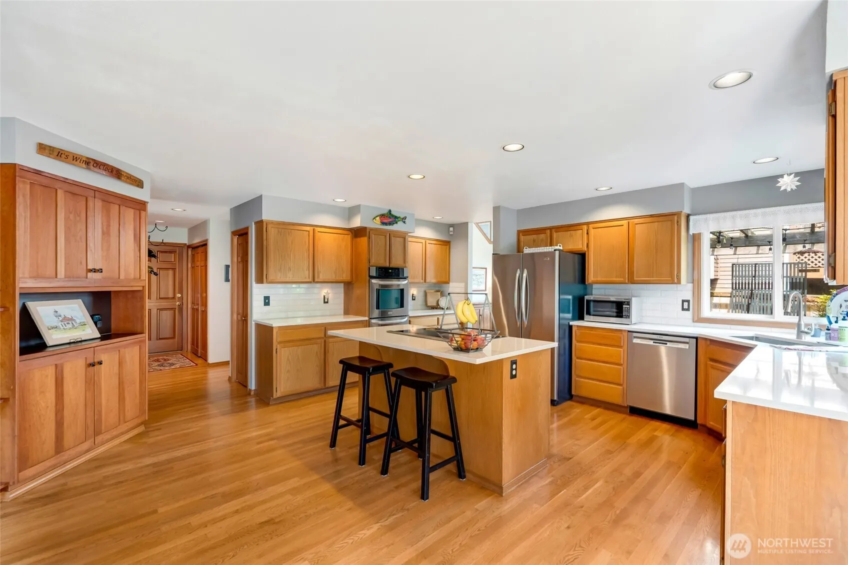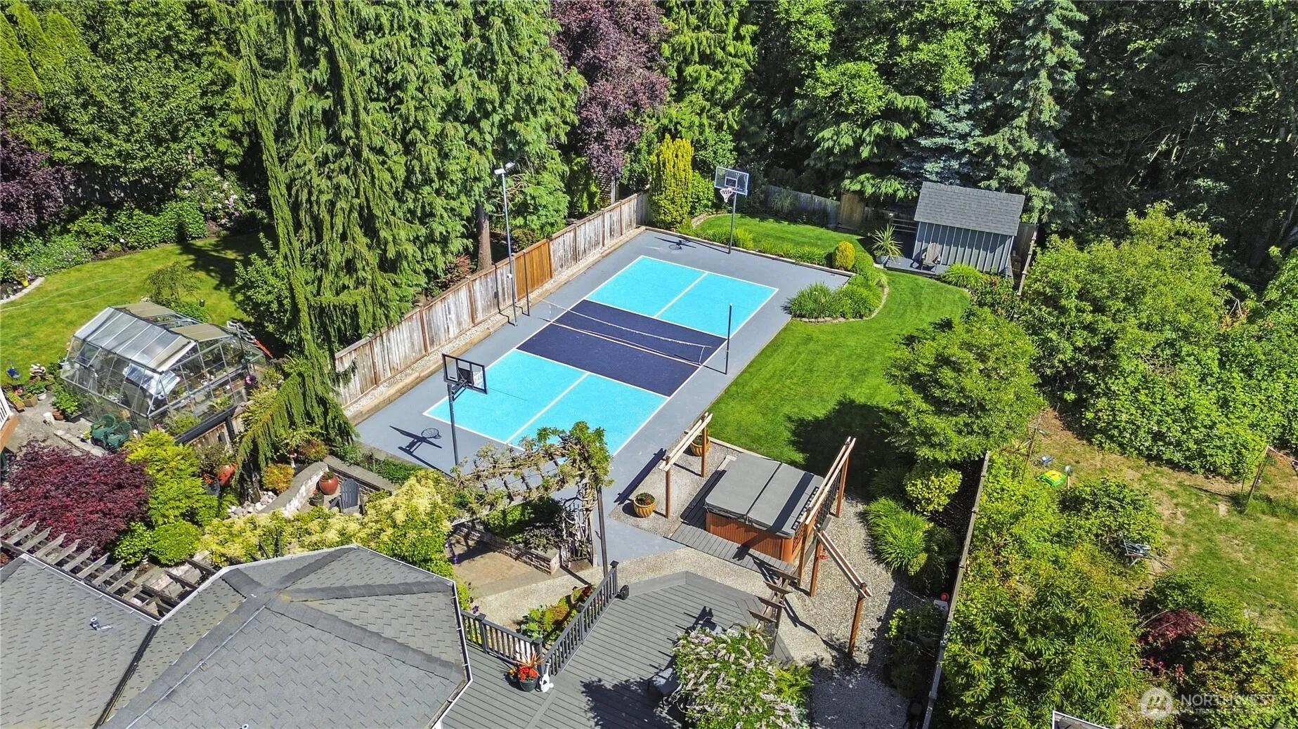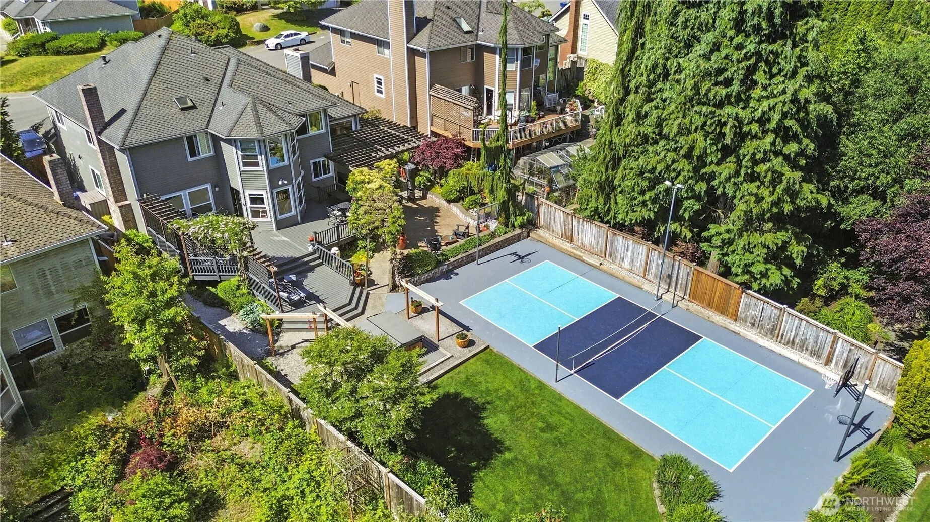 Gorgeous setting in the backyard! This 3100 square foot, four-bedroom home rests on a large level lot and features a full size pickleball court. The huge “Trex” deck makes entertaining easy while the trees, landscape, and water feature offer serenity and privacy. The main floor has beautiful hardwoods, new stainless appliances and countertops in the kitchen, formal living and dining rooms, a family room with pellet stove and built-in bookshelves, and a bedroom. The upper level is home to three more bedrooms (including a fantastic primary), bonus room, and utility room. The bathrooms have been updated. The new windows were installed approximately 6 years ago. And, the presidential grade roof was installed in 2012. Mukilteo schools.