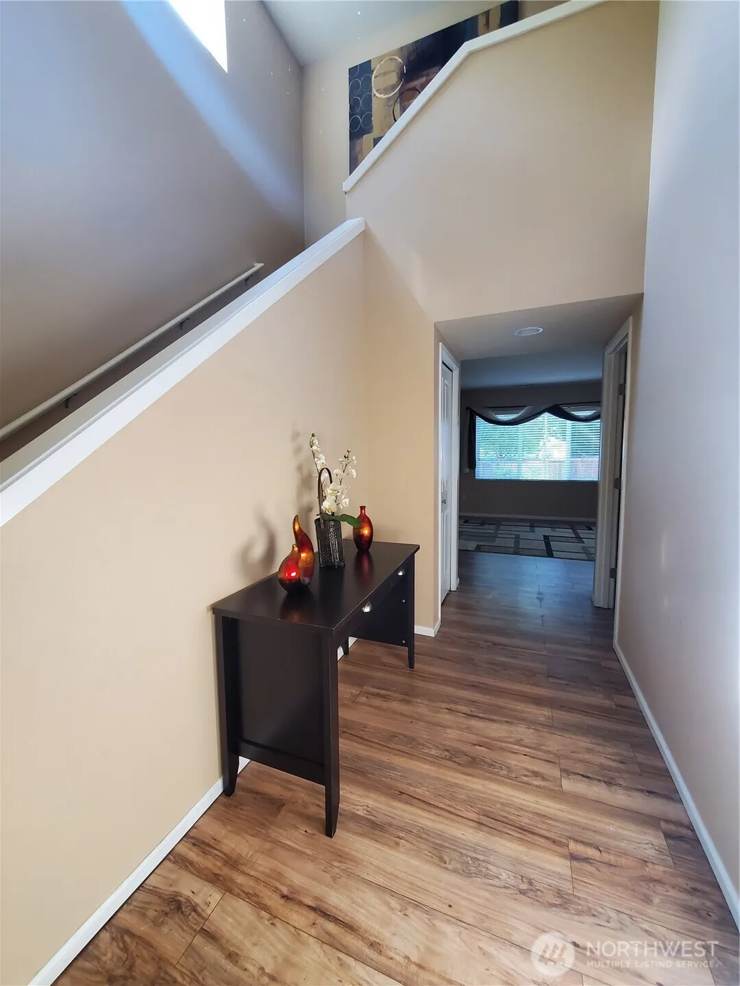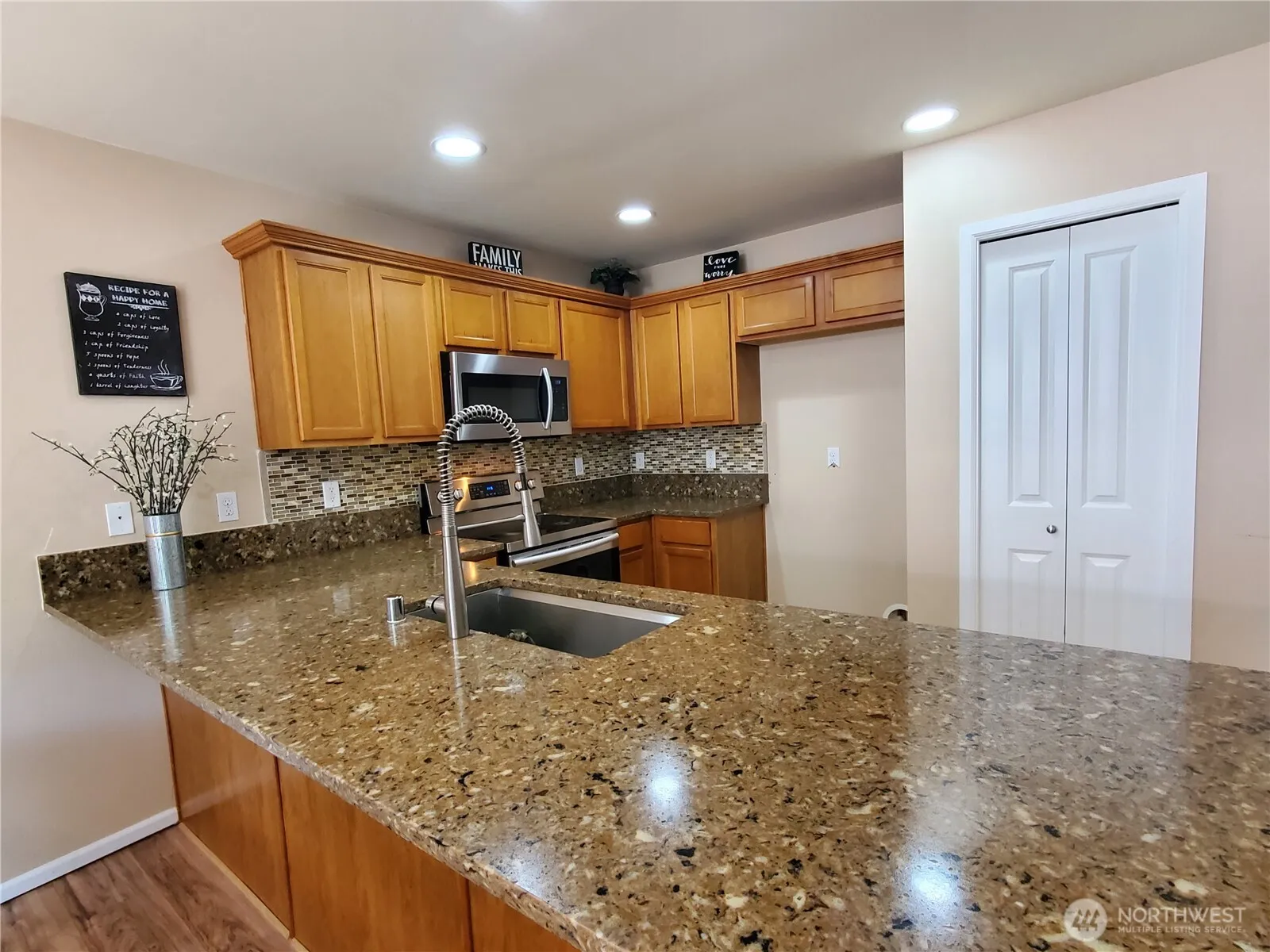 Located on a sunny corner lot in Valley Haven, this 2-story DR Horton Craftsman offers 1,764 sq. ft. of stylish living with peek-a-boo Mt. Rainier views. Enjoy brand-new carpet (2025), fresh paint (2019), and laminate hardwood floors throughout the main level. The open-concept layout features a modern kitchen with stainless appliances, sparkling countertops, pantry, and eating bar. A dining area with slider opens to a new deck (2020), expansive patio, and fully fenced yard with cherry tree and dog run. With 4 bedrooms plus a main-level office (possible 5th bedroom), 2.25 baths, and a spacious primary suite with private bath and walk-in closet, this home blends comfort, convenience, and charm. Brand new A/C has been installed!