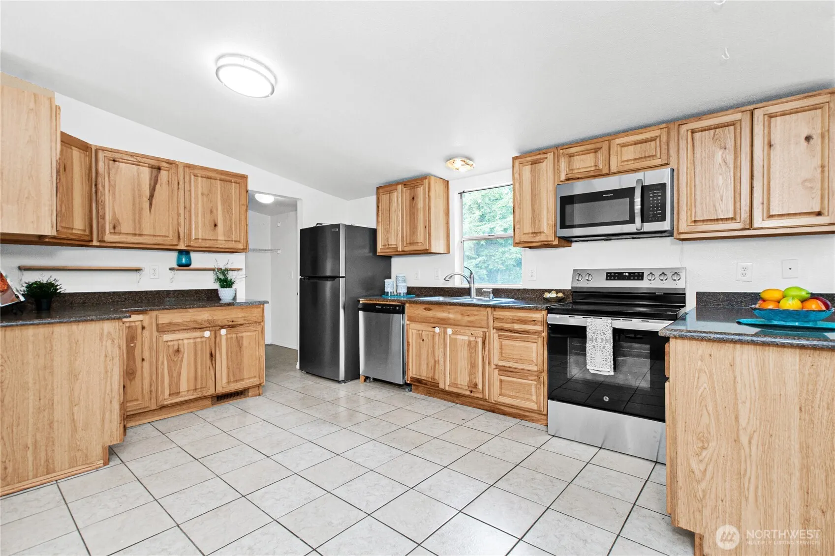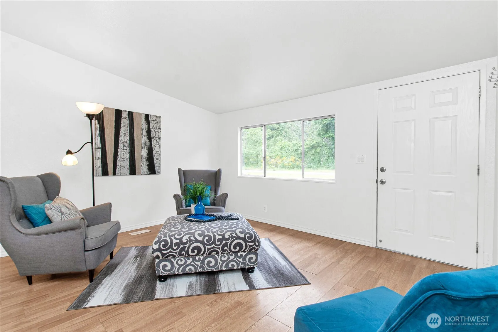 Remodeled, updated and economical 4 bedroom, 2 bath manufactured home on a shy acre! Enjoy the cost savings of this all-electric home with heat pump for year-round heating/cooling. Upgraded kitchen cabinets; new stainless steel stove, fridge, dishwasher and microwave; new carpet in bedrooms, new garden tub and shower in primary bathroom; separate utility room; split bedroom floor plan. New deck in front, refurbished deck in back. NEW ROOF! Fruit trees. No active homeowner association. Close proximity to JBLM.