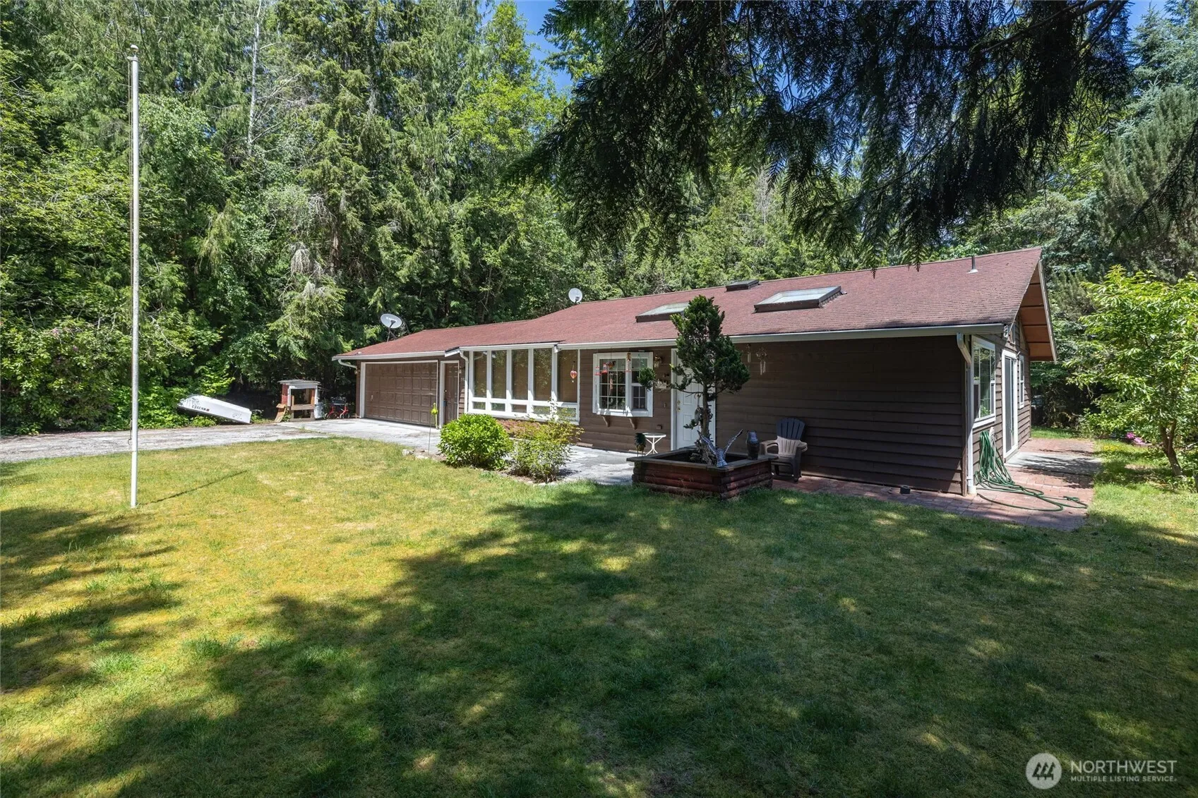 Nestled in a private enclave at the foothills of the Cascades is this well-maintained single level stick built home with attached 2 car garage! With a greenbelt to the North & no neighbors in sight this home has ultimate privacy, plenty of parking, and a large lot w/ 2 cherry and 1 apple tree. Several outbuildings including a chicken coop & run. Entering the home you have a dining room & large kitchen with vaulted ceiling & skylights. Spacious living room has wood stove, sliding glass doors and lots of natural light. Hallway closet features a wet bar! Guest bathroom and 2 large bedrooms including ensuite primary with 3/4 bath. Sunroom/storage between dining room and garage with wall to wall windows. Close to outdoor activities & Mt Baker!