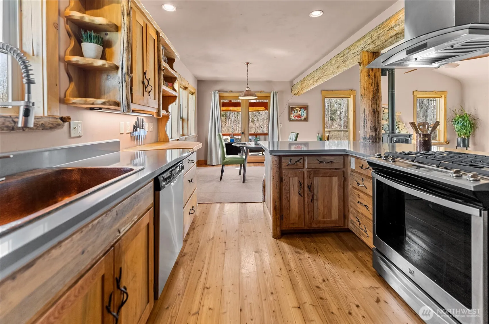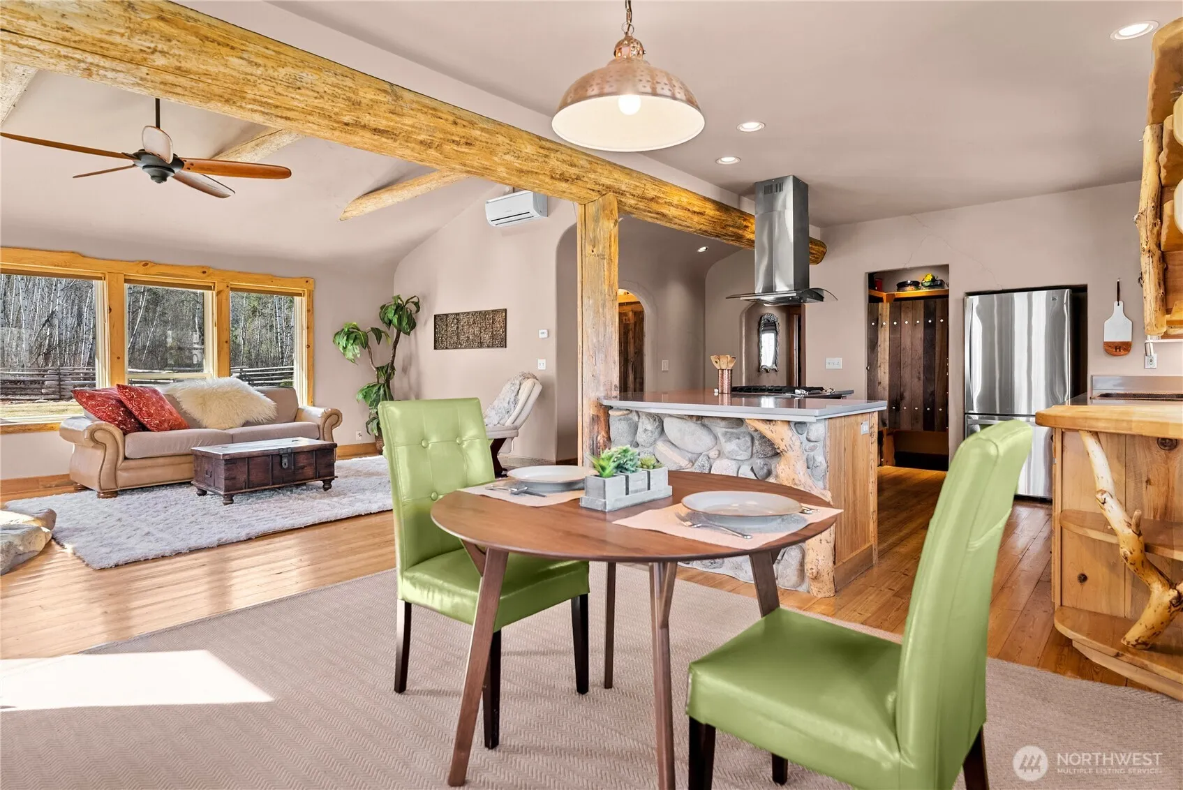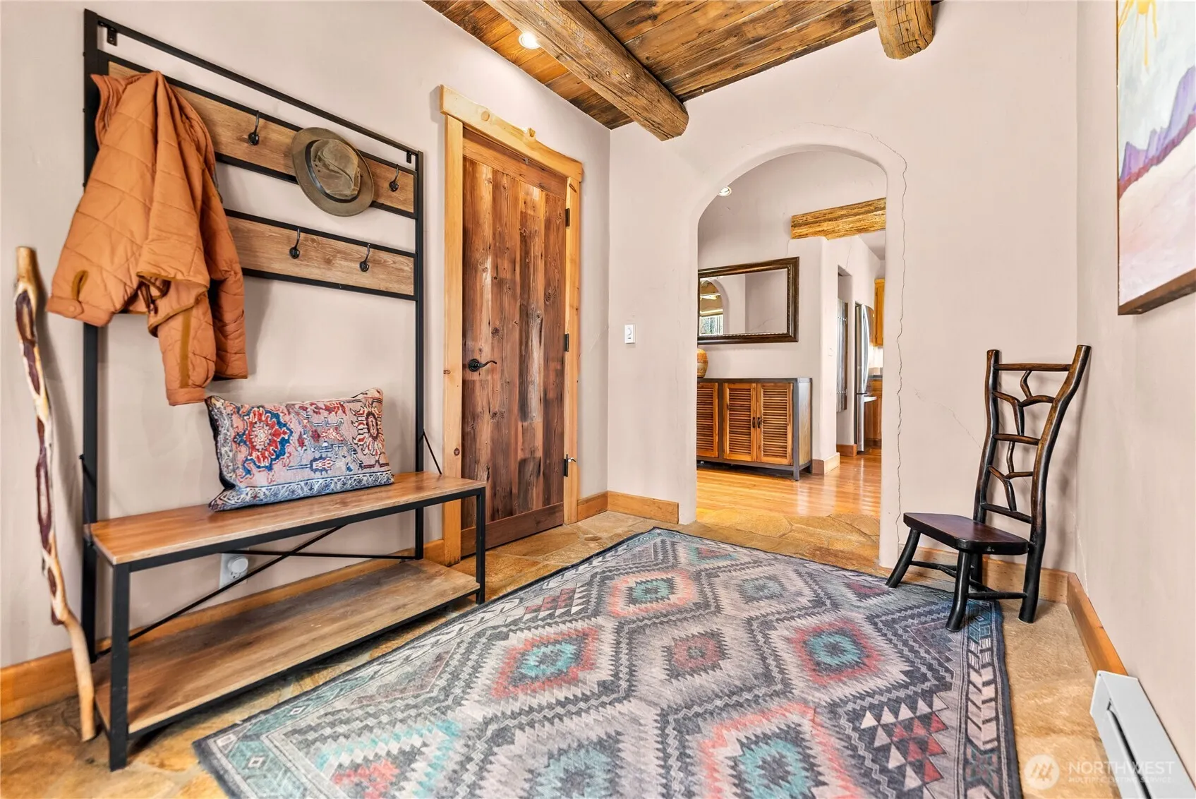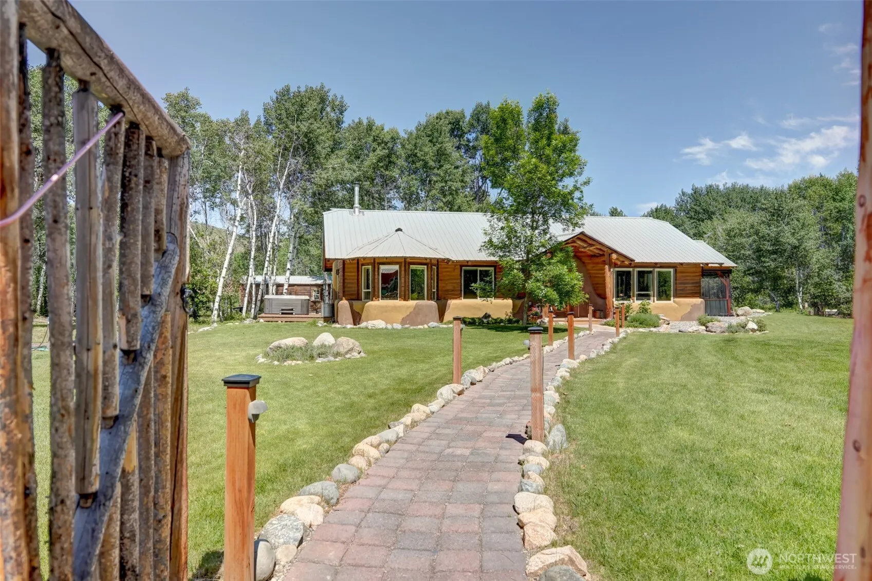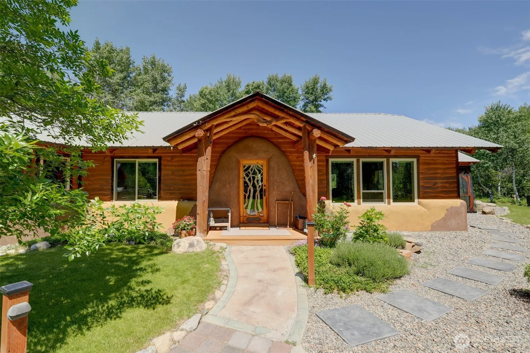 Discover a unique living experience in this handcrafted, energy-efficient 1 story home nestled among aspen trees. Situated on 7 private acres, this 2bed, 2bath home is conveniently located just minutes from downtown Winthrop. Inside, you’ll find exposed log beams, chef’s kitchen, & a fireplace in the primary bedroom, creating a perfect ambiance for relaxing evenings. The primary bathroom offers a spa-like retreat w/ river rock & mosaic inlays, enhanced by the comfort of radiant heating. Extend your living space to the outdoors w/ a covered gazebo, ideal for savoring the changing seasons. Enjoy the luxury of stepping directly from your bedroom onto the hot tub deck for ultimate relaxation. Also on property is a 110sf studio & 750sf garage
