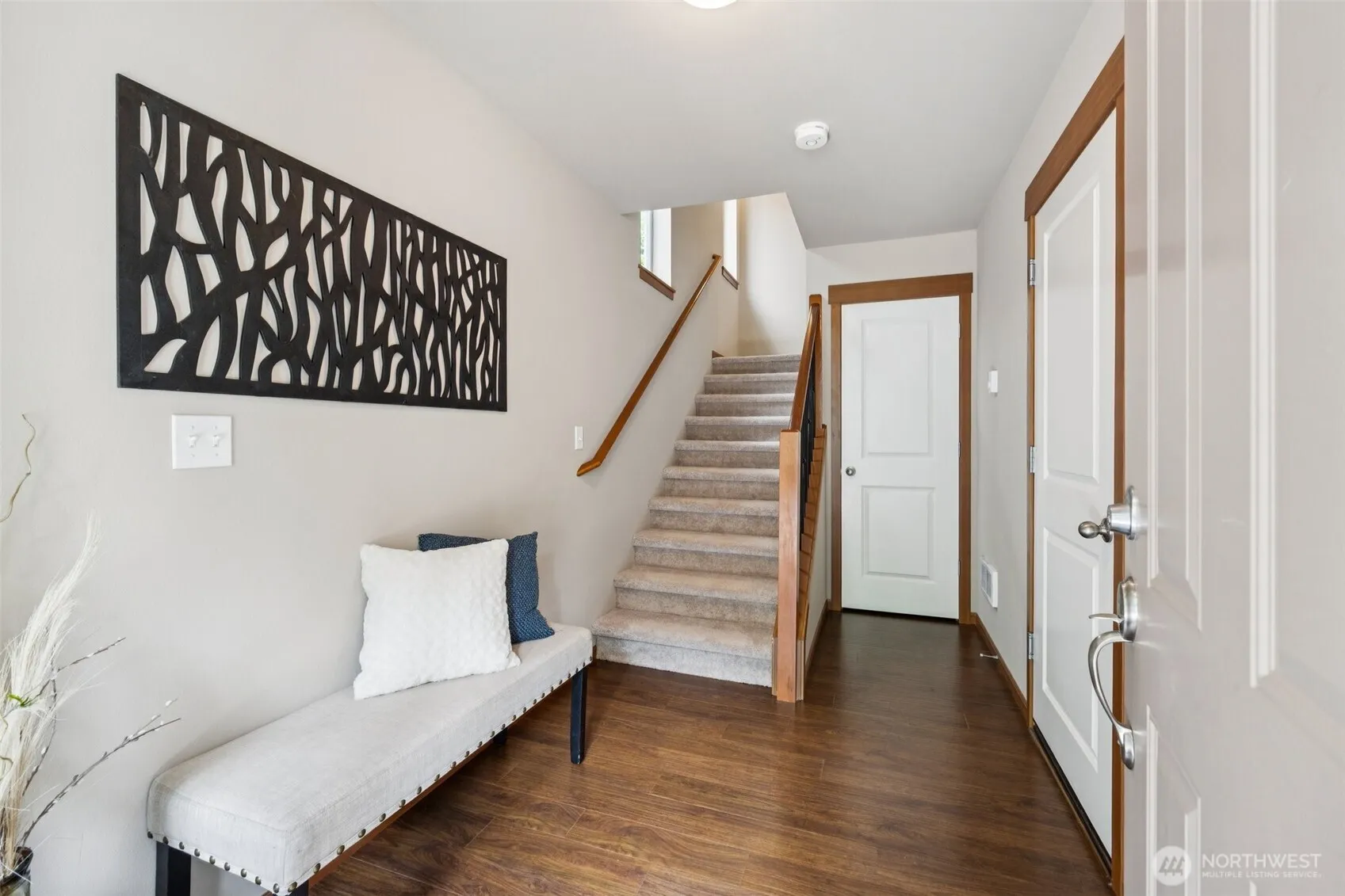 HIGHLIGHTS: A/C, EV Charger, seller is providing buyer closing cost credit as allowable, new carpet, & fresh interior paint. This like-new end-unit townhome is tucked away on a quiet private road & backs to a peaceful greenbelt surrounded by mature trees. The open-concept main floor has soaring ceilings, rich wood flooring, & a seamless flow between the kitchen, dining, & living areas. The kitchen has granite countertops, SS appliances, pantry. Upstairs are 3 generously sized bedrooms, 2 full baths, and ample closet space. The oversized 2-car garage offers extra storage and the driveway provides additional parking. Great location: 5 mins to light rail & I-5, close to shopping, restaurants, public transit.
