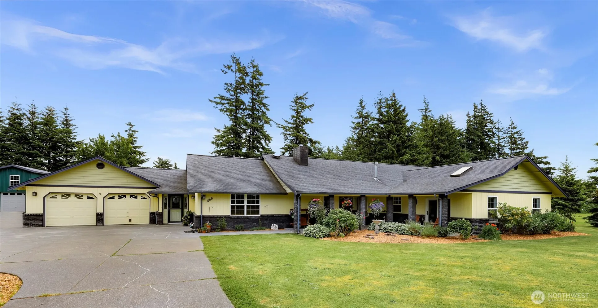 ASSUMABLE 2.25% interest VA Loan, $395K balance, you do not have to be VA to assume! Beautiful spacious 1-acre property just outside Lynden city in a peaceful neighborhood of large lots and farmland. Updated single-level w/ vaulted ceilings, skylights, & a chef’s kitchen featuring custom cabinets, huge island, double ovens, pot filler, beverage fridge. Two primary suites with en suite baths, one with sitting/office area & patio access. Detached barn-style shop with 2 bays, loft, covered carport, and paid-off solar panels. RV pad with 30-amp outlet & water line. Fruit trees, grapes, blueberries, kiwis, sheds, pergola. Natural gas, 2-car garage with bonus shop space. All the room and features you’ve been looking for—just minutes from town!