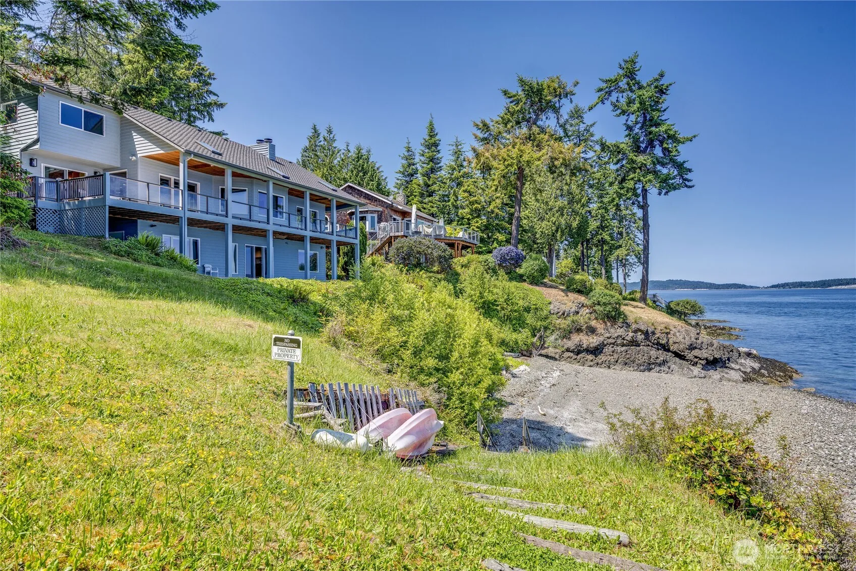 The pictures say it all! Waterfront living with sweeping views of Admiralty Inlet and the Cascade’s including majestic Mt Baker. Take easy stairs down to your own shared cove. This home was custom designed for the lot with each room facing the water view – most feature deck or patio access. Main-level living with spacious rooms including the living room and the primary suite, both of which feature a wood-burning fireplace. The wrap around deck, with skylights, is partially covered. A bonus room with outside access offers a great space for a studio or an office. 3 garage bays. Lush grounds with room for an RV and/or a shop. Lower-level family room with a woodburning fireplace & wet bar. Located on a quiet street. Possible seller-financing.