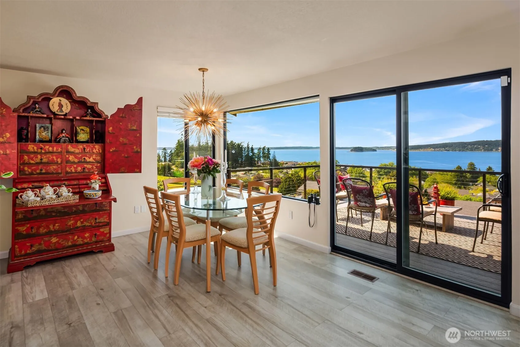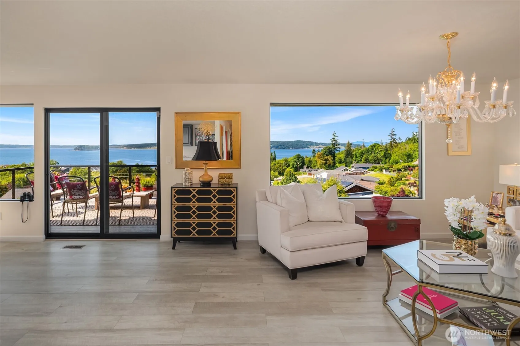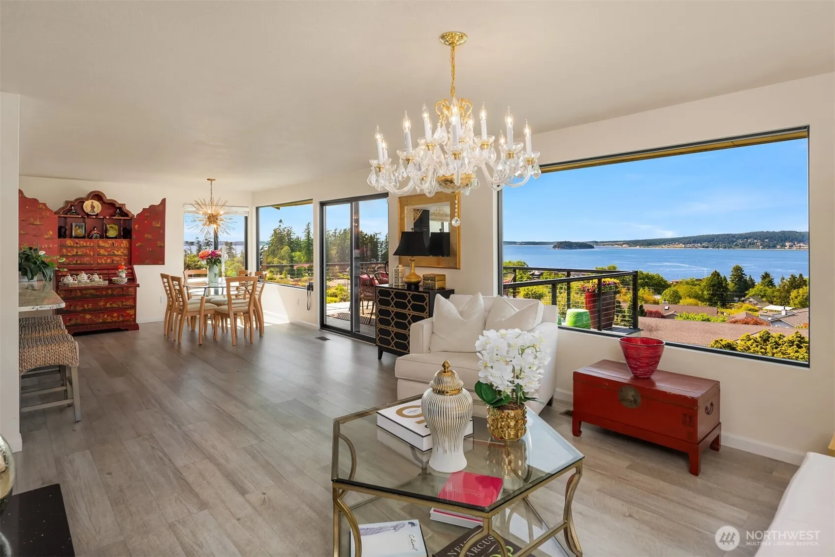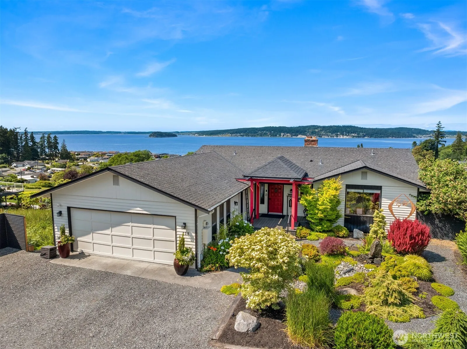 Expansive west-facing water views and just a short stroll to a private community beach—perfect for crabbing, kayaking, and soaking up the sun. This thoughtfully updated home features a view kitchen and open-concept living with a sleek linear modern fireplace in the great room and two main-level bedrooms. The lower level is designed for entertaining with a spacious family room, wood-burning fireplace, bar, and two additional bedrooms. At sunset, relax in the hot tub surrounded by lush gardens and a tranquil water feature. Double view decks are ideal for hosting and watching boats and whales pass by. Plenty of space for RV/boat parking, and the community boat launch is nearby. Prime North-end location with easy drive-on access to the island.