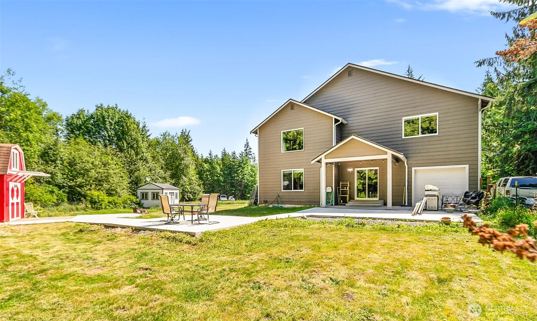 Over 7 acres, 3095 sq ft 4 bedrooms 2 1/2 baths built 2016 (Pilchuck East) gated community all at least 5 acres, huge 811 sq ft garage with doors in front and back. Pretty kitchen with formal and un-formal eating space. Private setting end of the road with easy access, gated community with openers. Approx. 3 miles outside of Granite Falls off Menzel Lake Rd. PUD water! Hard to find! Plenty of room for toys. Two separate outbuildings for gardening or hobbies. With poured concrete for walkway. Propane heat with monitored fill. This a great home for those that want elbow room and serenity. With recent price drop. shop and compare, most home for your dollar.