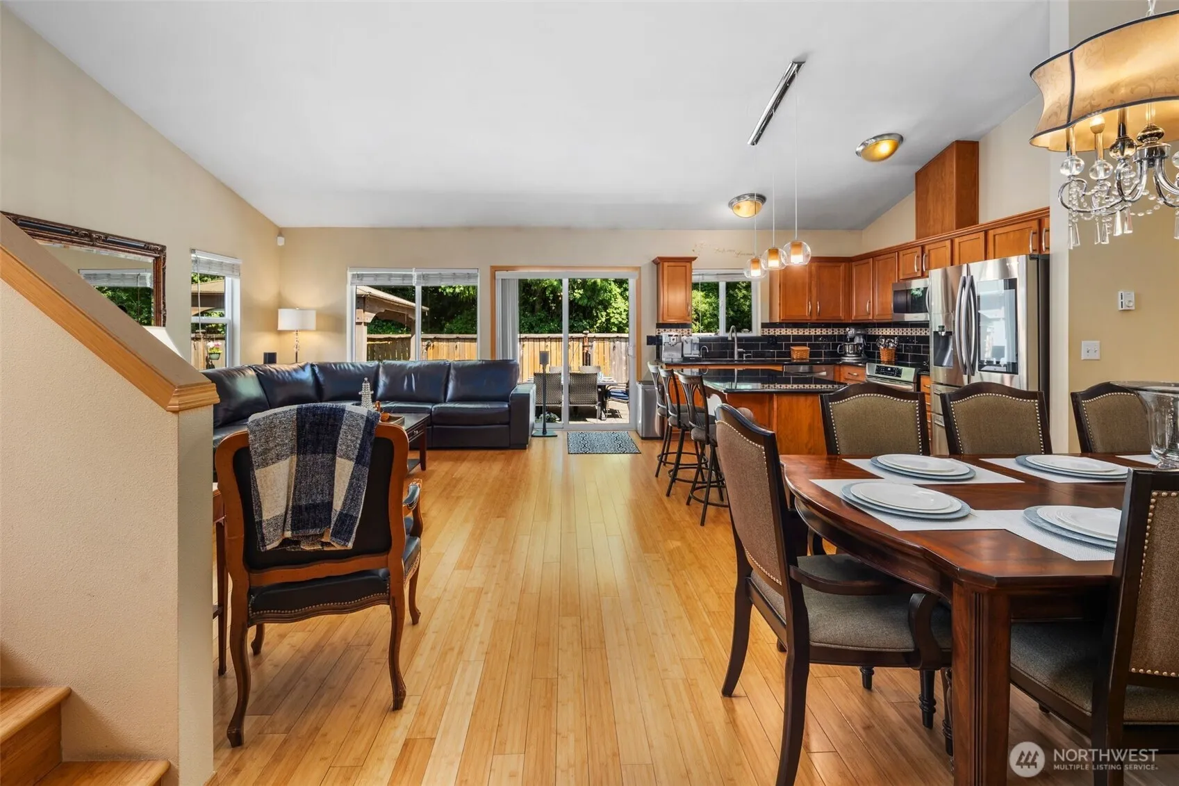 Welcome to Radiance! This light-filled home features 2 bedrooms, 1.75 baths, & an open-concept layout with vaulted ceilings & bamboo floors. The large living room flows perfectly into the kitchen & dining room for ideal living. The primary bedroom includes a walk-in closet & private bath. Up front, enjoy low-maintenance artificial turf, while the backyard offers a true retreat with a huge patio, gazebo, sound system, & no rear neighbors—backing directly to a peaceful greenbelt. Stay comfortable year-round with a mini split for heating & AC. Located in the vibrant Radiance community, with access to large parks, playgrounds, a skate park, basketball courts, & trails. A beautiful blend of comfort, privacy, & convenience. Welcome home!