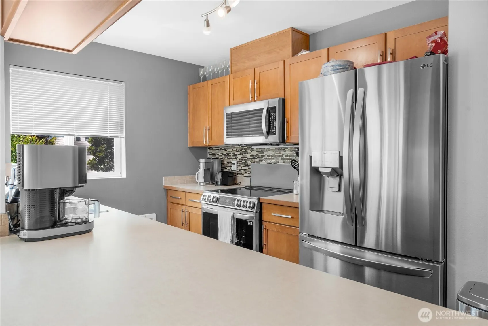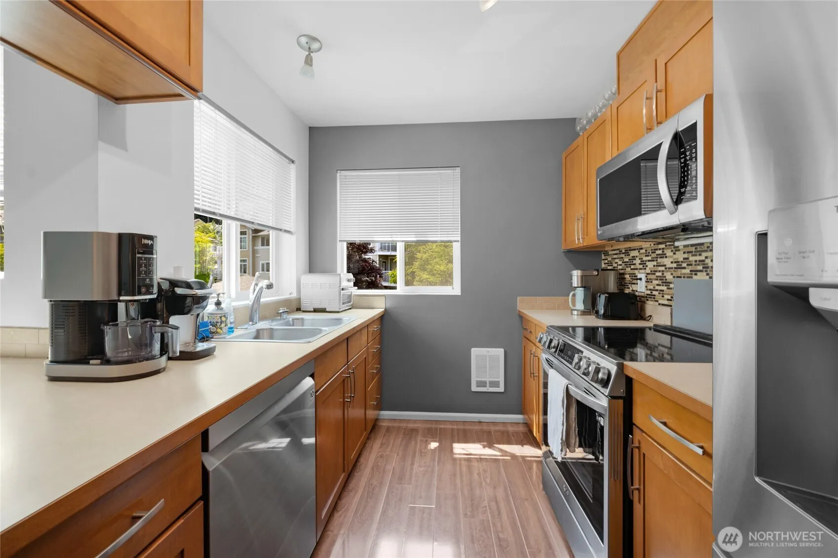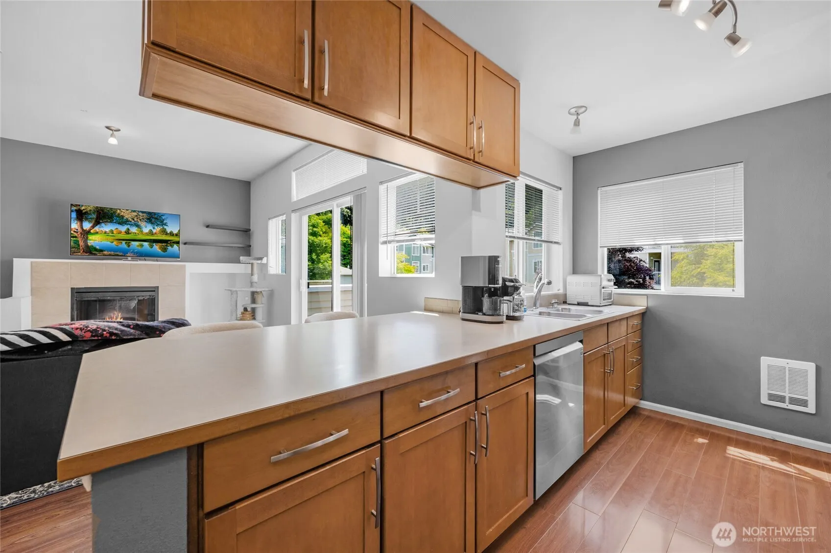 Welcome to this beautifully maintained 1-bedroom, 1-bathroom condo offering 802 sq ft of comfortable living space. Built in 2006, this two-story unit lives like a townhome, featuring wood floors, a cozy gas fireplace, and a private balcony with territorial views. The spacious kitchen is equipped with stainless steel appliances, a breakfast bar, and ample cabinet space. Additional highlights include in-unit laundry, an attached garage, and an extra parking space in front of the garage. Situated in a peaceful community, this home is conveniently located near golf courses, walking trails, parks, and offers easy access to I-5, SR-167, and the Angle Lake Light Rail Station. 4.25% FHA Assumable Mortgage!!!