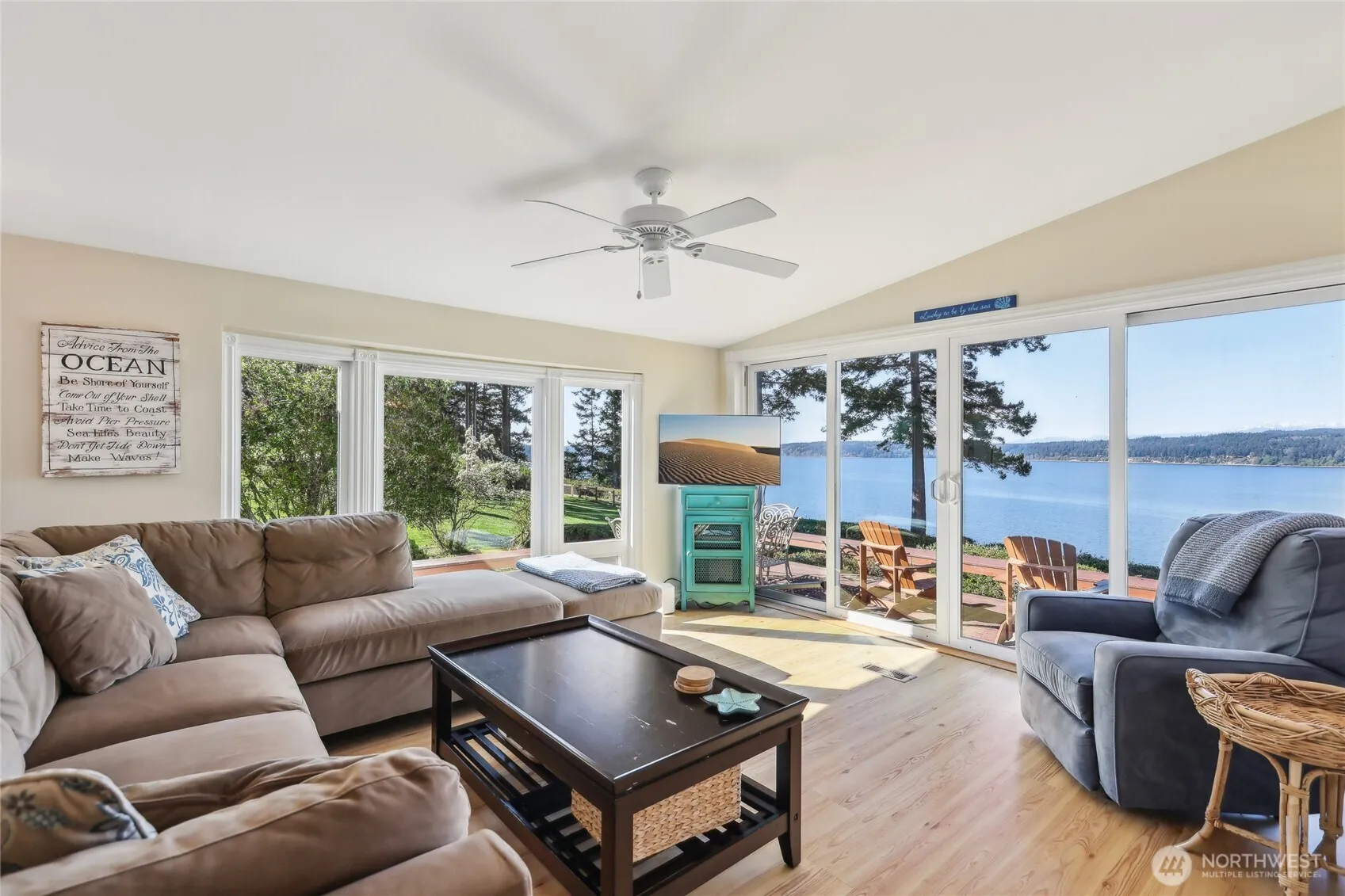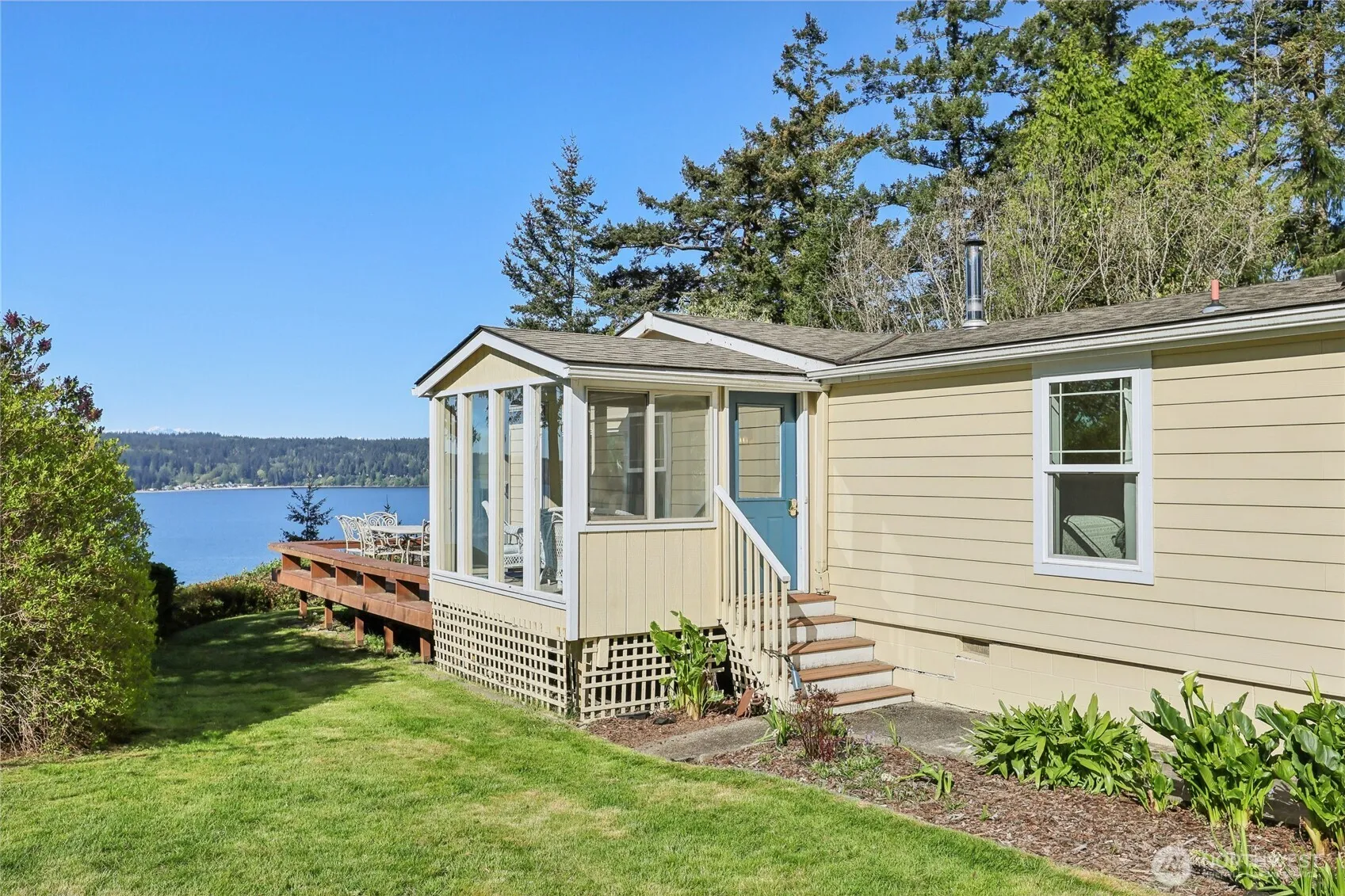 Soak in breathtaking west-facing water views w/approx 90+/- feet of high-bank frontage overlooking Holmes Harbor & Olympic Mountains. Enjoy unforgettable sunsets from the expansive deck, sunroom, or living room. Open-concept living room w/cozy stove seamlessly flows to the kitchen w/dedicated dining area. Generously sized primary plus 2 addl bedrooms, offer plenty of room & flexibility. A greenhouse on the property adds charm & functionality for year-round gardening. Newer composite roof, newer siding, & newer water heater. 2 car garage w/workshop. Strong vacation rental history. Community beach area features a boat ramp, bulkhead beach, picnic area, & opportunities for beachcombing & crabbing—ideal for those who love life by the water.