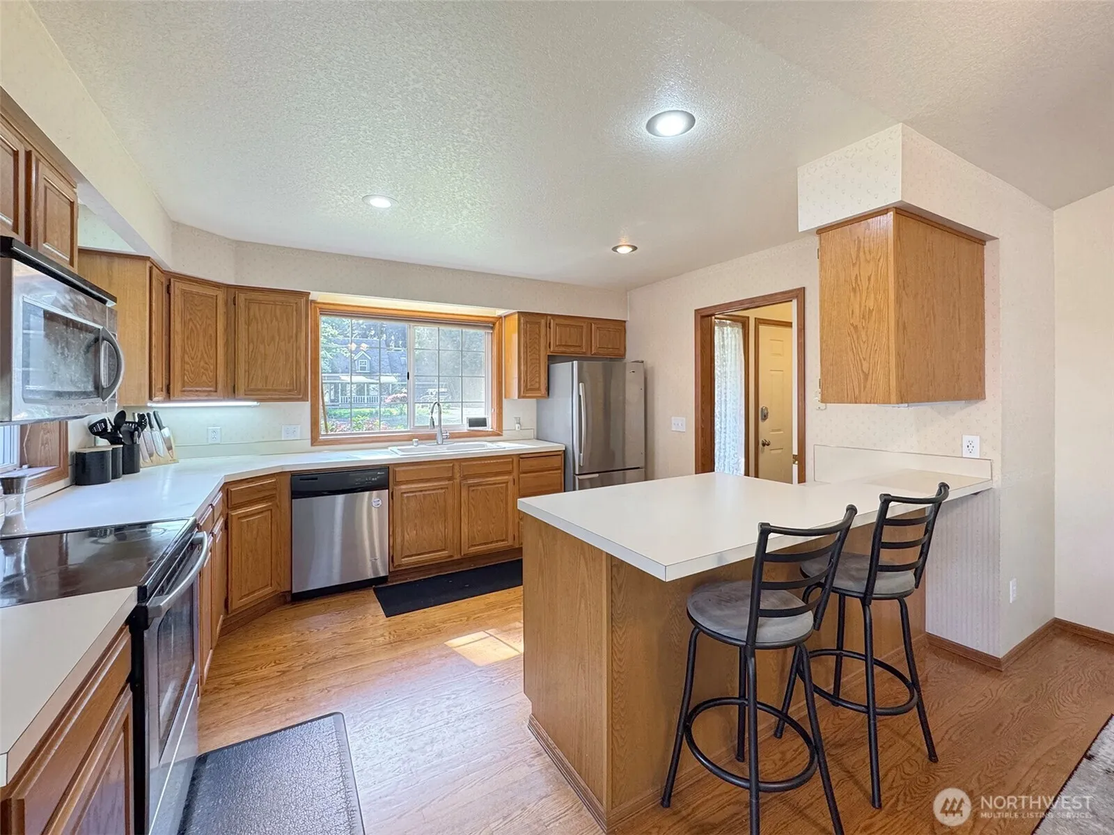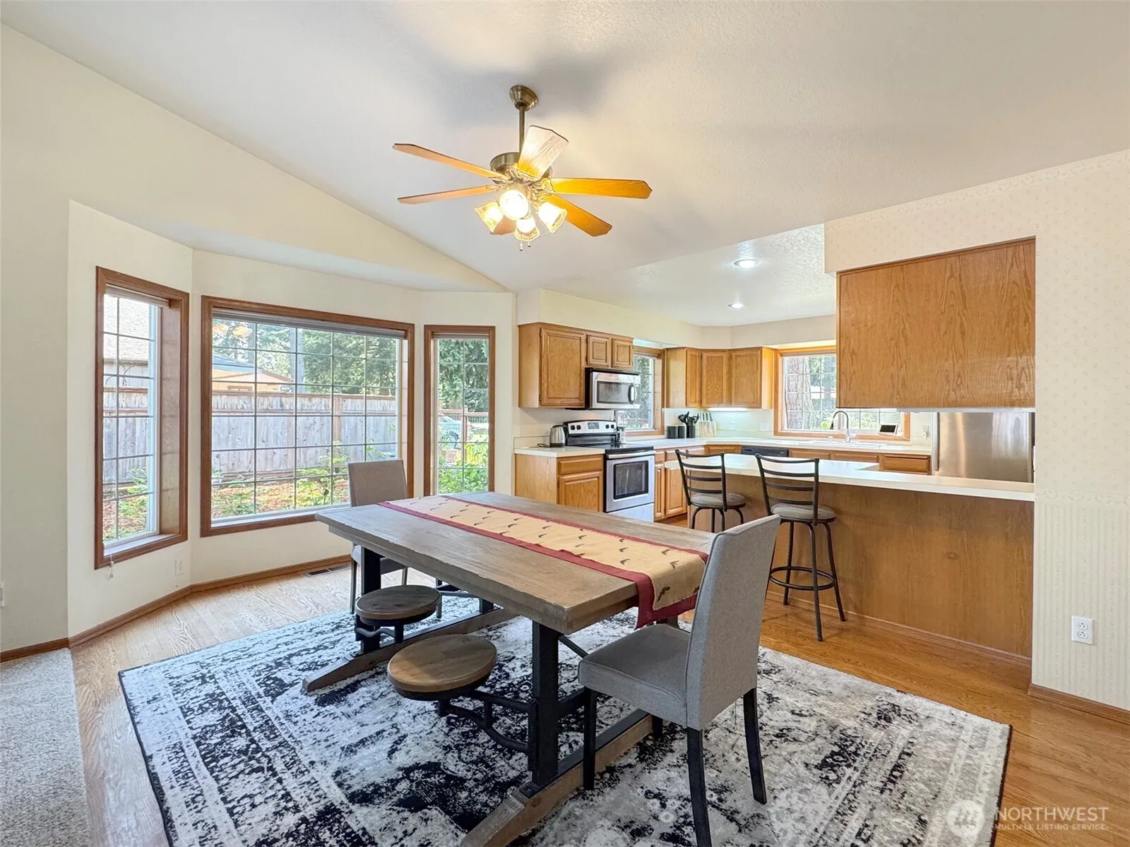 Charming single level home in the desirable Forest Ridge neighborhood! Enjoy vaulted ceilings and natural lighting in the main living area, paired with a cozy wood stove, skylights, and large bay windows. The kitchen and dining space offers a functional flow, with recessed lighting and real hardwood floors. New carpets throughout and updated guest bathroom! Substantial master suite with high ceilings, more skylights, and a walk-in closet. Spacious fenced in backyard offers a private deck as well as a secluded garden area that is full of potential! This house is sure to make you feel at home.