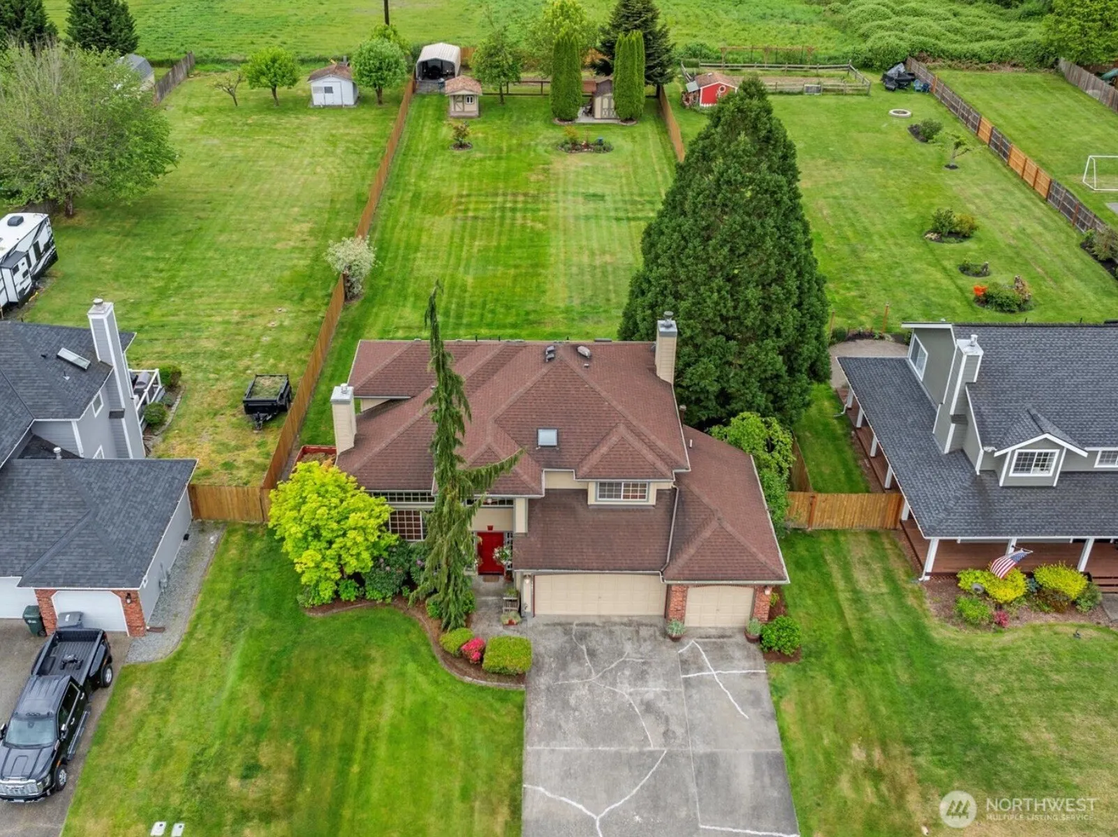 A PRISTINE, FULLY PRE-INSPECTED home on 1/2 ACRE w/ RV Parking & carport?? YES, PLEASE! This Riverbend Estates gem even comes w/ a home warranty! Walking distance to the area’s best golfing, fishing, & stunning trails, it’s also located in the coveted Sumner School district. Enter in to towering ceilings & a welcoming floorplan! Living & dining rooms flow into kitchen w/ granite counters & lush backyard views. Continue to family room w/ cozy fireplace. Upstairs features 3 beds & 2 renovated baths! Primary suite showcases a spa-like ensuite w/ heated floors & soaker tub. Huge yard w/ Trex deck, produce garden, & 2 powered outbuildings. Newer 50 yr roof, 2025 furnace, AC, hardi-plank siding, sprinklers, gentran switch, newer fence + paint!