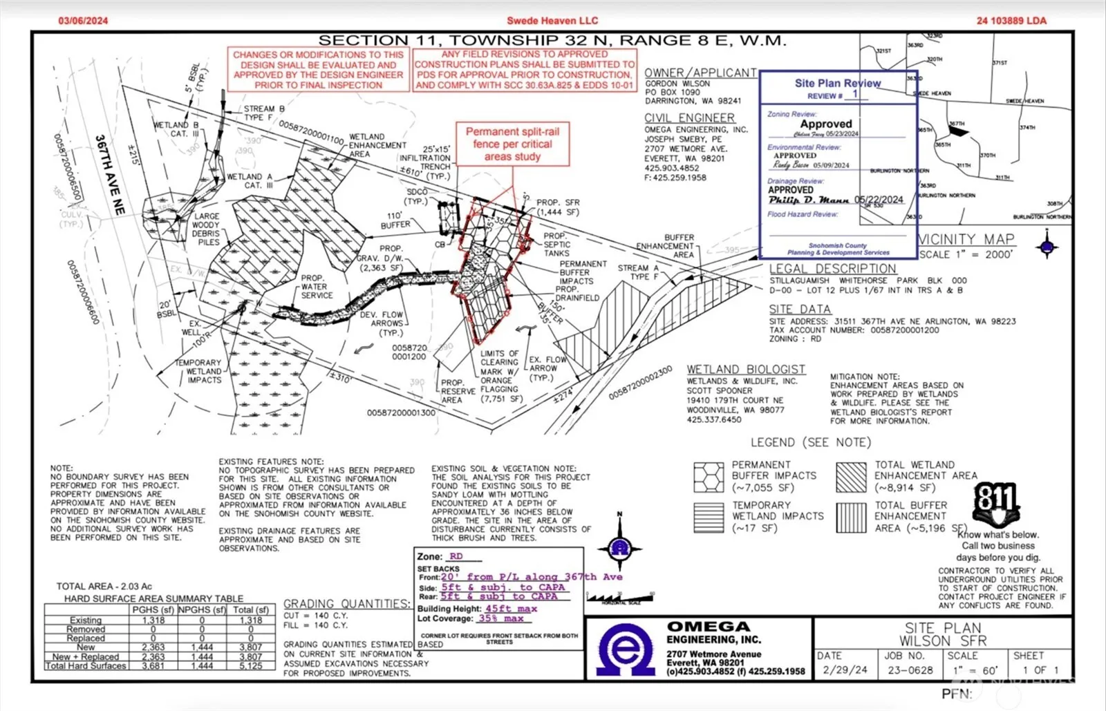 Skip the wait for permits and approvals when this one of a kind Swede Heaven Creek property. Suitable and ready for new construction or mobile/modular home up to 3,000 sqft with a 2 story layout. The property has a steel gate at property entrance. Swede Heaven Creek runs along back property line, and a walk to Stillaguamish River and Whitehorse Trail Access, this property is NOT in the river flood zone. Surveyed, flat/slight 2-5 foot elevation gain Critical Area Site Plan, drainage and land use plan approvals in place. 200 amp electrical service to property. Well in place Initially tested at 40+ gpm. 3 bedroom Septic design and approval complete. Construction access driveway and clearing permits approved and issued. No HOA or CCR’s