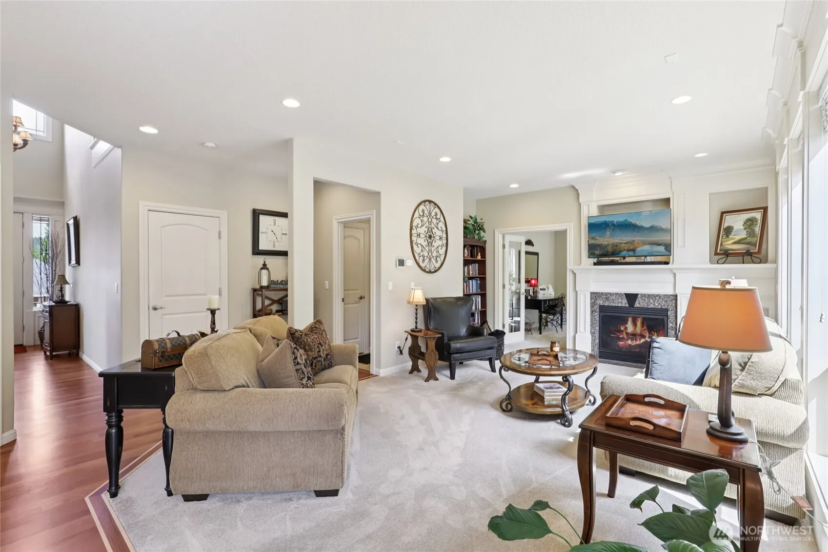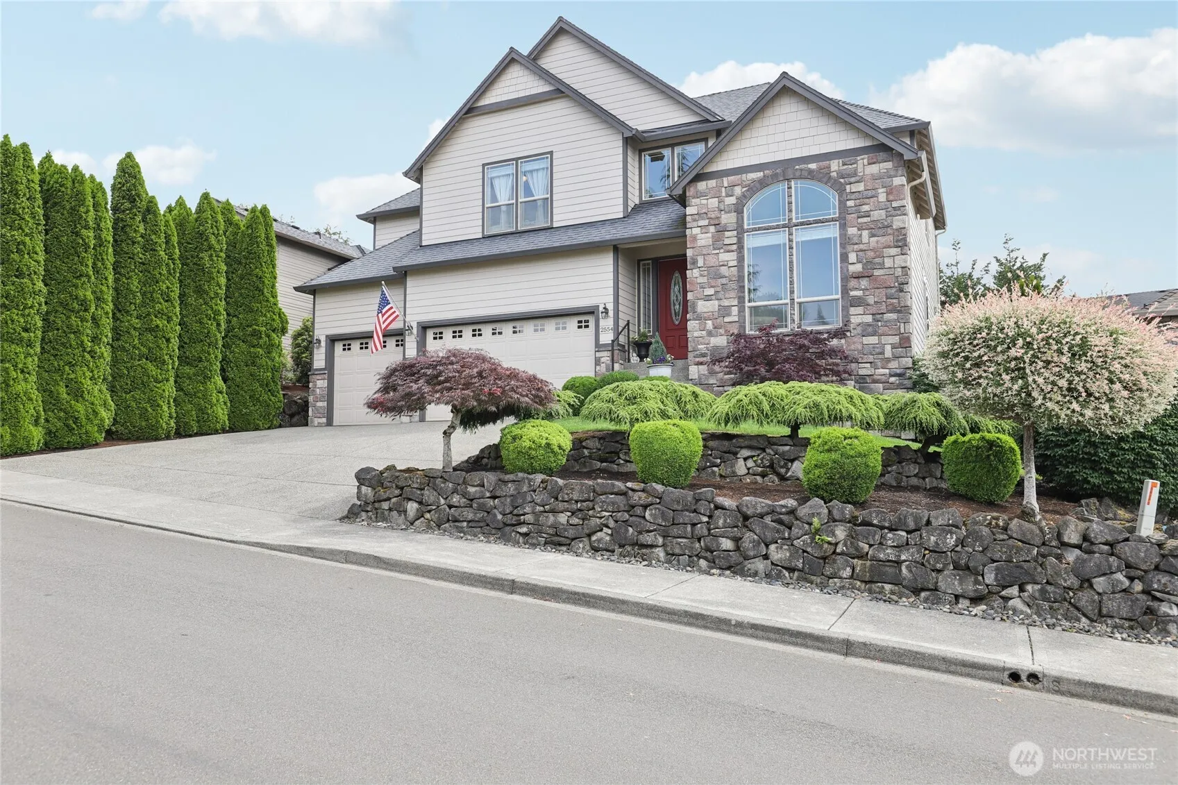 Custom Home! LR w/radius window wall flows into DR. GR FR w/gas FP, BIs, window wall view of backyard. Gourmet island/eat bar SS kitchen w/New Bosch appliances, granite counters, abundant cabinetry, WI pantry. Adjoining dining offers slider to back deck. Upstairs, primary en-suite w/French door entry, coffered ceiling, cozy sitting area, dual WI closets, jet tub, tiled shower, private WC. 2 addtl bdrms, full bath, bonus rm/potential 4th bdrm, laundry complete upper level. Main level also offers den/ofc w/French door entry, powder rm w/pedestal sink. Highlights: grand staircase, exquisite millwork, high ceilings, new refinished Brazilian cherry hardwood, plumbed for central vac. Exterior: deck, pergola, front sprinklers, 3-car garage.