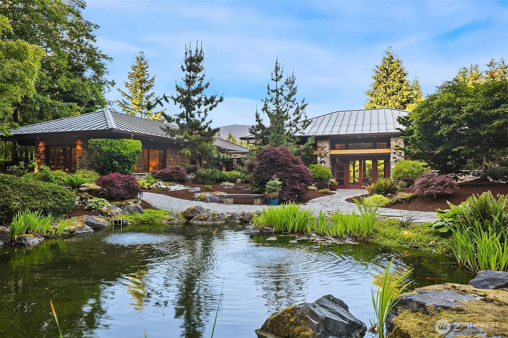 Award-winning 2002 MAME “Best Custom Home”, inspired by Frank Lloyd Wright’s iconic Falling Water, featuring PNW and Japanese influences. Stress melts with the sound of the waterfall. Enjoy feeding koi in a seasonal symphony of color landscaping. A temple awaits as you open the front doors with symmetrically balanced stone, wood, and glass. Awake with the sun and views of Mt Si, drift to sleep with the sounds of the water splashing. The primary spa awaits to nurture your tired body further. Take refuge in the cozy home theater with a 17’ wide screen and soundproof walls. Whether feeding 4 or 40, the U-shaped kitchen layout is perfect for orchestrating meals, including guests for conversation or prep, but keeping them out of your domain.
