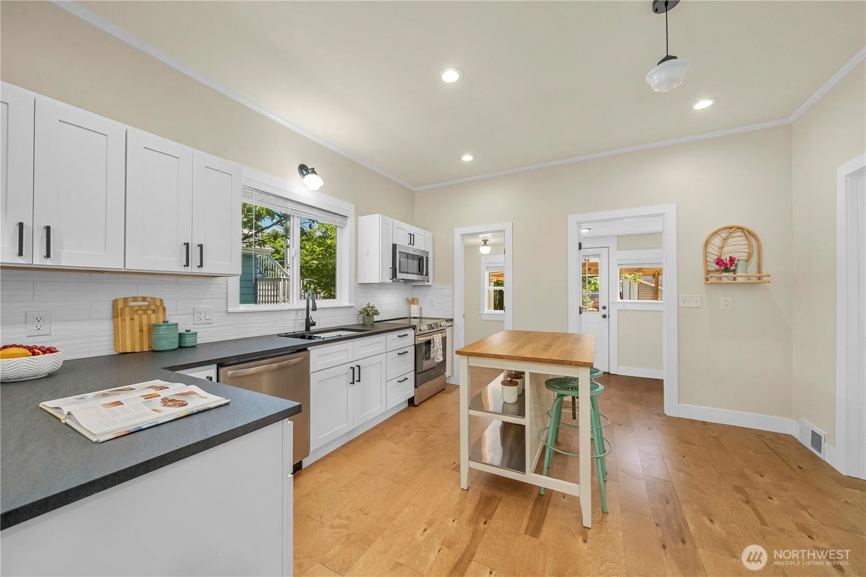 Welcome to Ruston! Enjoy a refreshing walk to Point Defiance, Dune Peninsula, and Point Ruston. Love the water? Boat launch and Vashon Ferry just steps away. This freshly remodeled gem features 2 bedrooms plus second floor space functioning as a third bedroom, primary bedroom with attached 3/4 bath , new: roof/wood flooring/paint/ cabinets throughout. Updated electrical and windows. Lots of closet/ built-in storage space. New stainless steel appliances, quartz countertops and walk-in pantry. Fully fenced backyard to create your outdoor area & garden space, cherry trees in front & kiwi in the back. Utilize the RV parking and a expansive garage with alley access. Enjoy the wonderful covered front porch while watching deer graze. Welcome home!