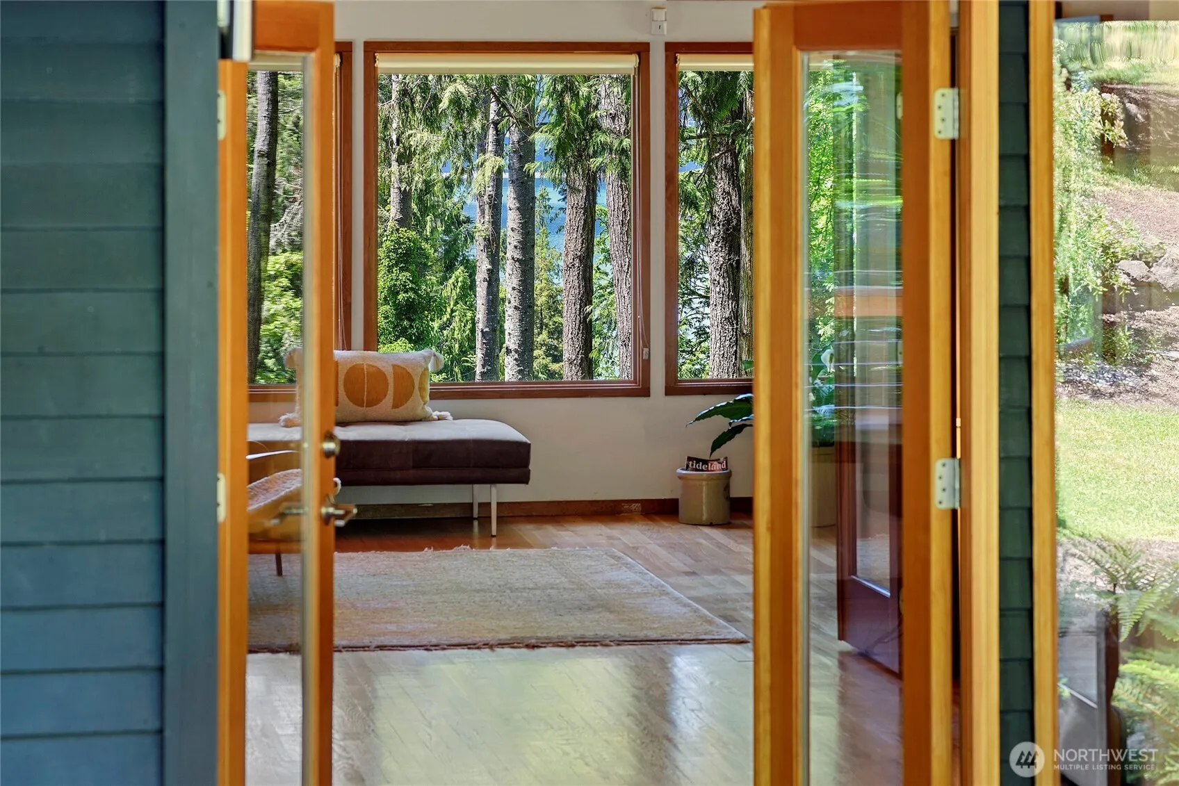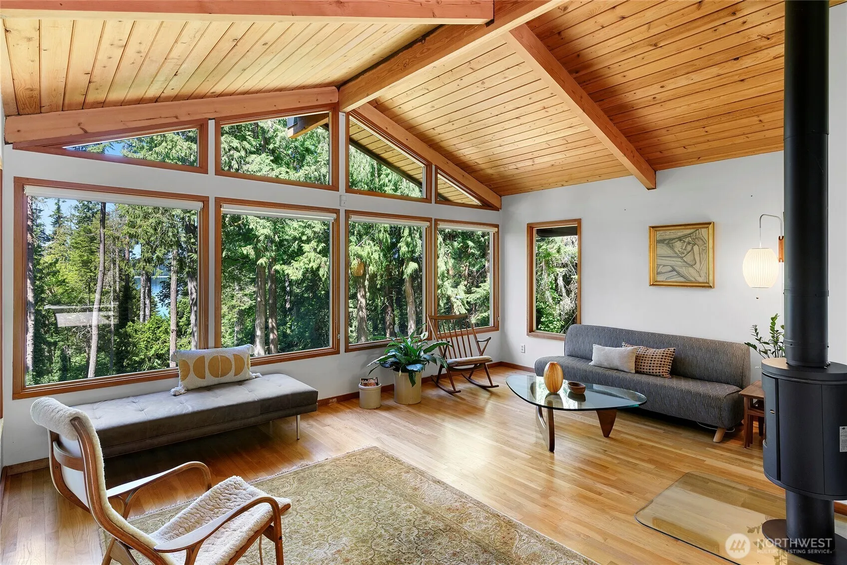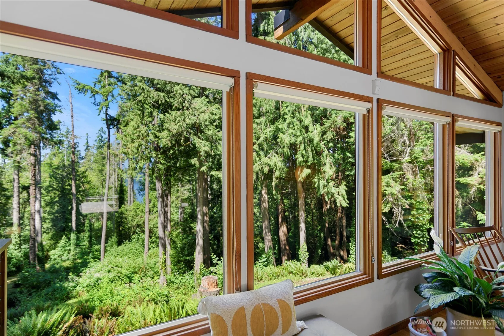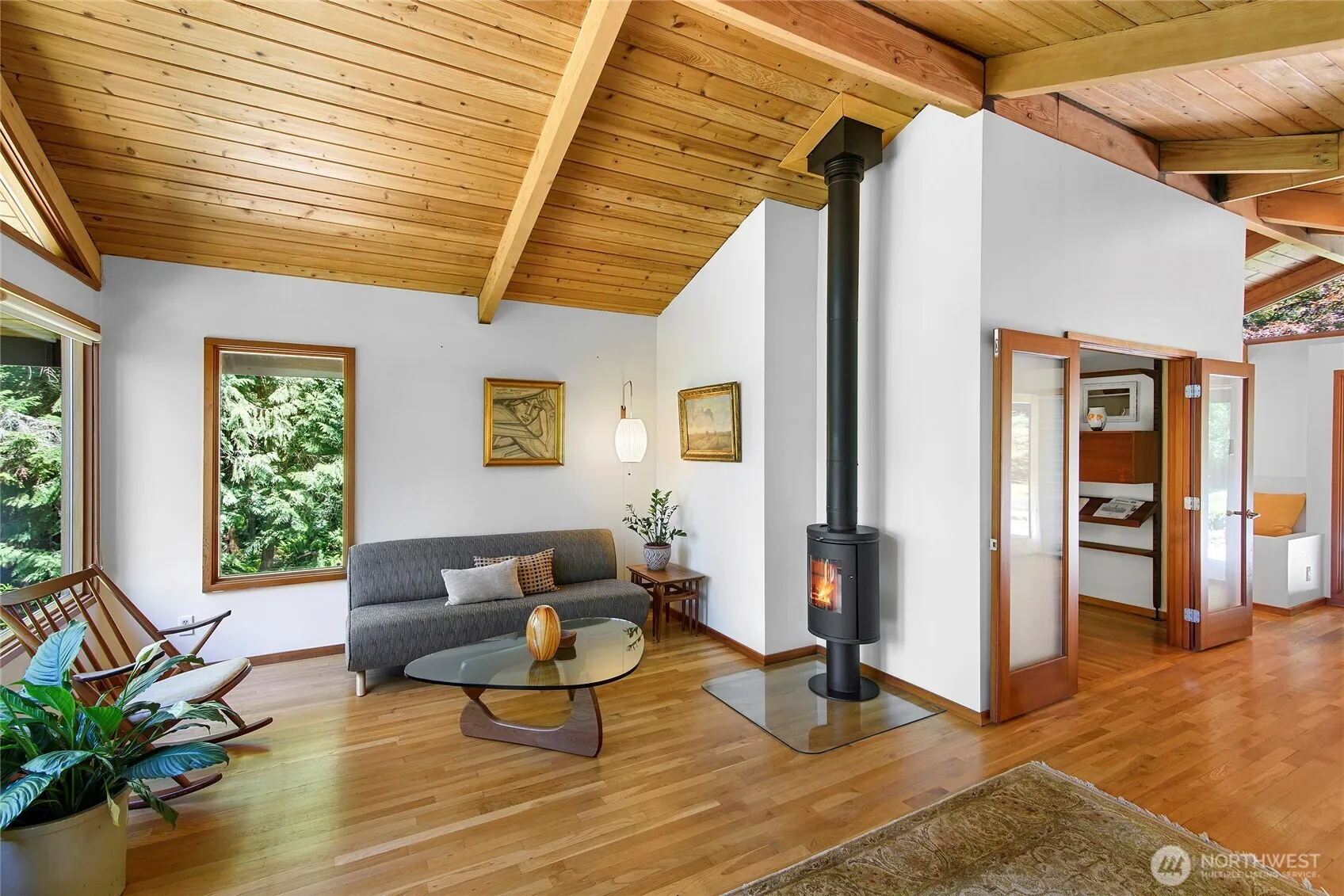 Experience the perfect balance of light and trees as you meander the private driveway amidst 200 year old grand firs and arrive at the inviting and stylish front entry of this Rustic Modernism home. With its delightful park-like setting on 1.5 acres, you’ll enjoy stunning sunsets, filtered water views and the brightest light from soaring walls of west facing windows. Enjoy the spacious open floor plan with hardwood floors and skylights on the main floor, including the primary bedroom. Additional bedrooms, bonus room, and separate entries on lower floor. Close proximity to beach and the wonderful 90 acre Battle Point Park and Grand Forest.