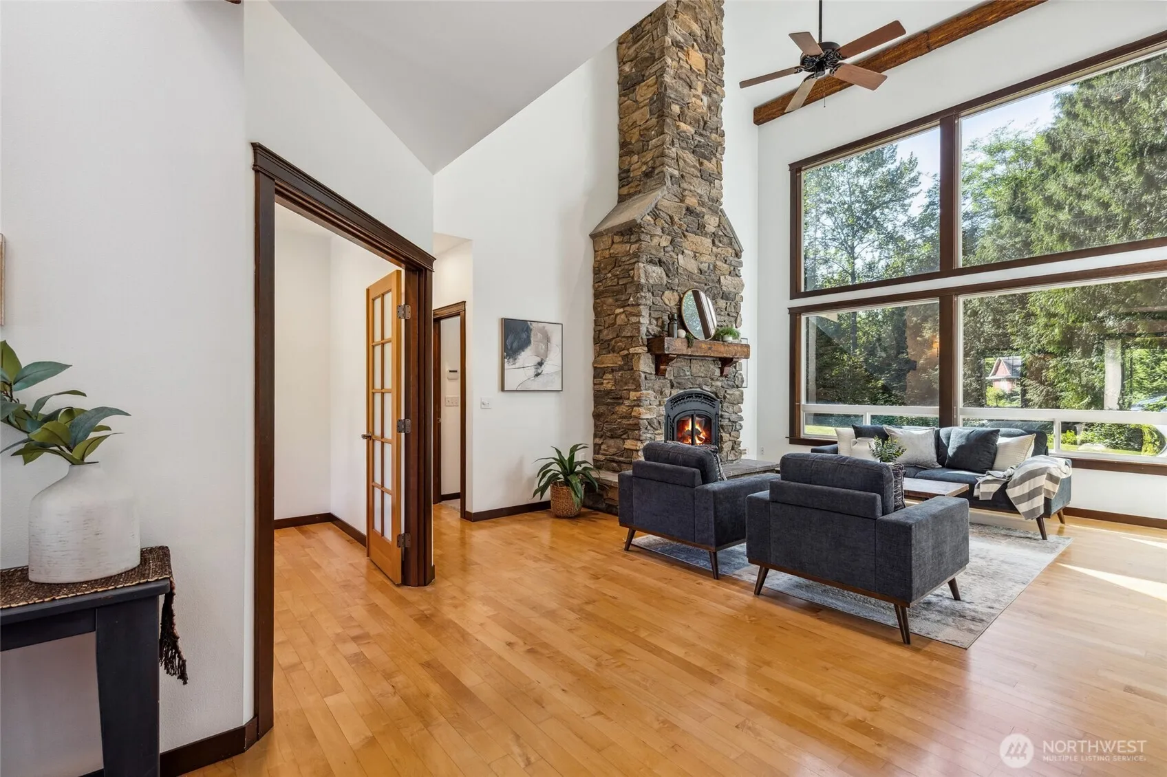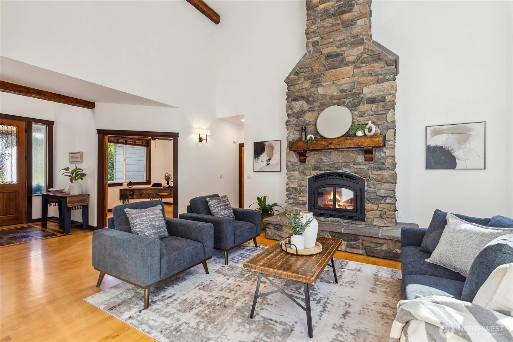 This impeccably maintained custom Craftsman sits on a beautifully landscaped acre, surrounded by 12 acres of protected land for lasting privacy. The park-like grounds offer multiple outdoor spaces, perfect for relaxing/entertaining. Inside, the living room stuns with 30-ft vaulted ceilings, wood beams, & a striking wood-burning stone fireplace. The main floor offers a primary suite with its own on-demand HWH, a dedicated office & a guest suite. Upstairs includes 3 additional bedrooms, large bonus room, & a den/flex space. Recent upgrades include new int. paint, carpet, blinds, appliances & a whole-house generator. A new zoned HVAC system allows for temp control on each floor, ensuring year-round comfort in this private and peaceful retreat.