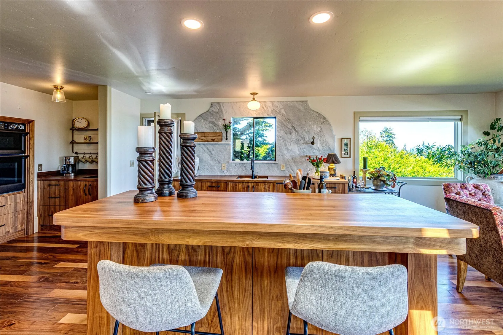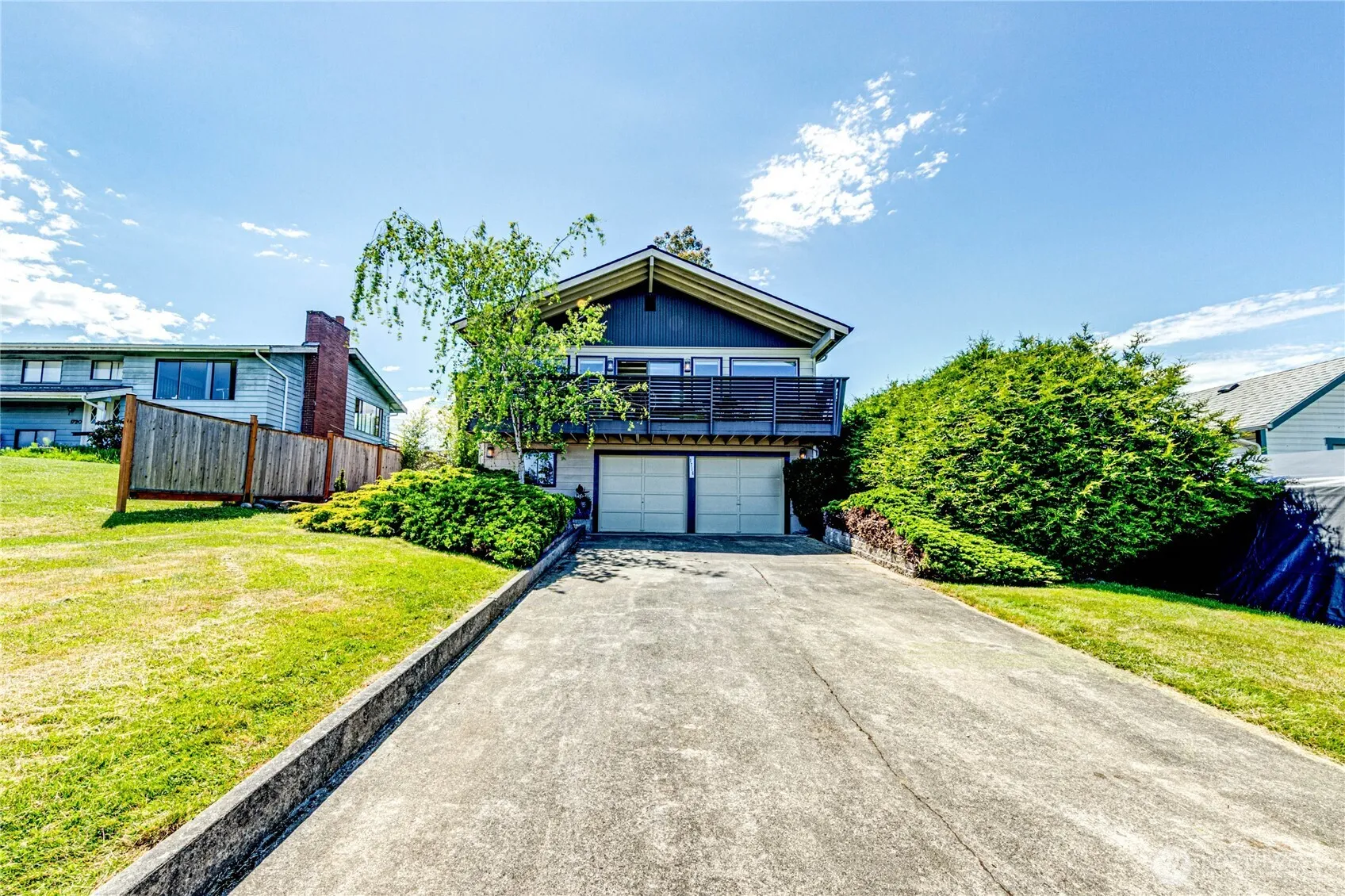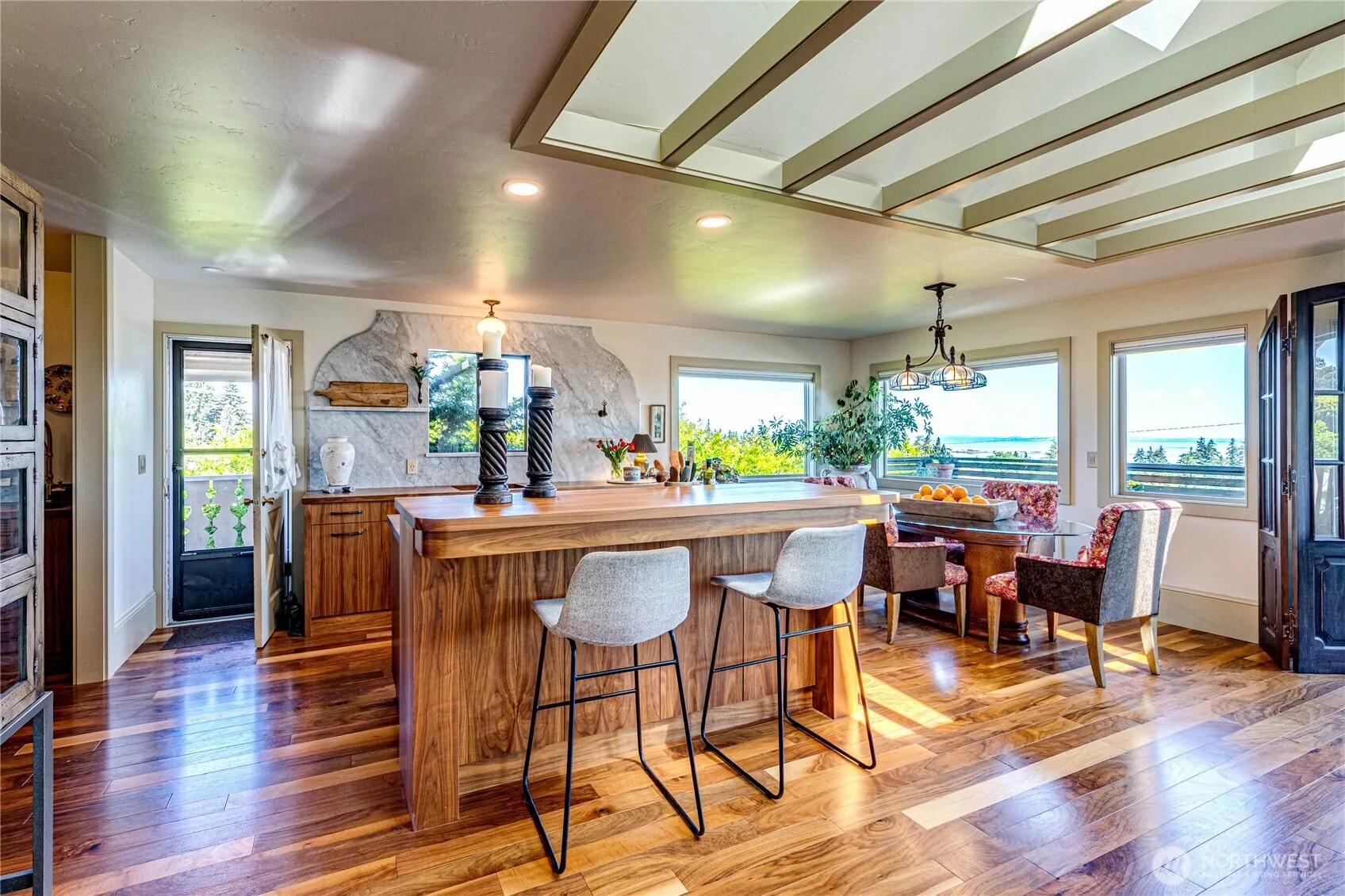 Experience elevated living in a beautifully updated home that fuses modern European design with the natural beauty of the Pacific Northwest. Capturing panoramic views of the Straits, Canada, and Mt. Baker, the property features a vaulted ceiling with exposed beams and skylights, filling the open living space with natural light. Elegant details include walnut cabinetry, a marble backsplash, and a clawfoot tub. The luxurious kitchen offers hidden appliances, a double dishwasher, and a butler’s pantry. The primary suite is a peaceful retreat, while the lower level provides flexible living space. The backyard, reminiscent of Italy, features two pizza ovens, a covered patio, a greenhouse, and lush mature plants, creating a magical oasis.