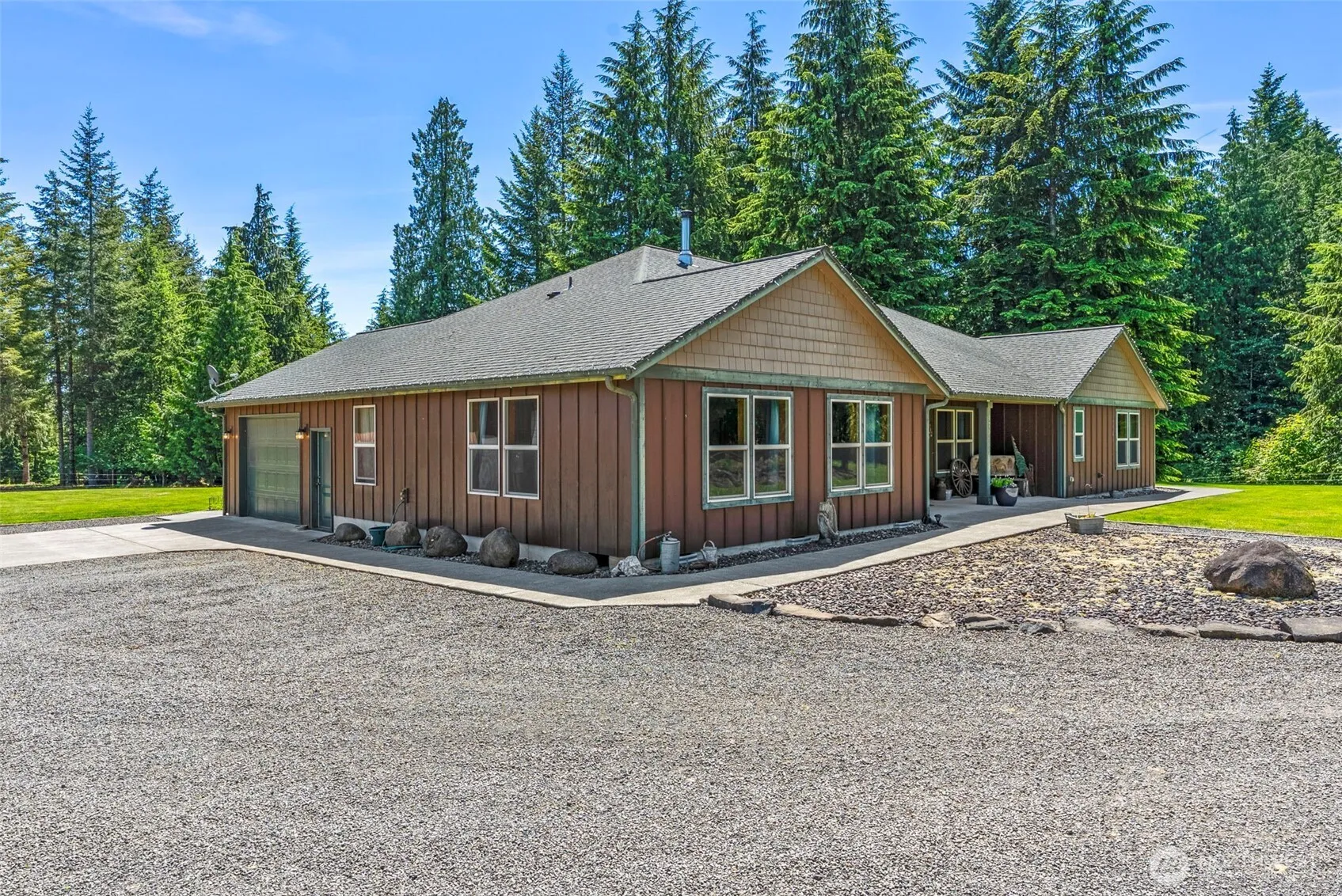 Charming home, gorgeous setting, 12 acres of land. The custom design offers one level living, open-concept floor plan, ideal for relaxed living & entertaining. 3+ bedroom, 2.5 bath, spacious kitchen, lots of cabinets, dining area, walk in pantry, island w/ seating, great room & formal living room. Covered back deck leads to a concrete patio w/hot tub & huge back yard to enjoy. Shop, barn with 4 stalls, tack room & feed storage, plus additional outbuilding for covered equipment/RV parking. Property has room to roam & set up for livestock. There is the option to divide with additional home sites offering long term value. Multi-use property & beautiful setting. Truly a pleasure to view.