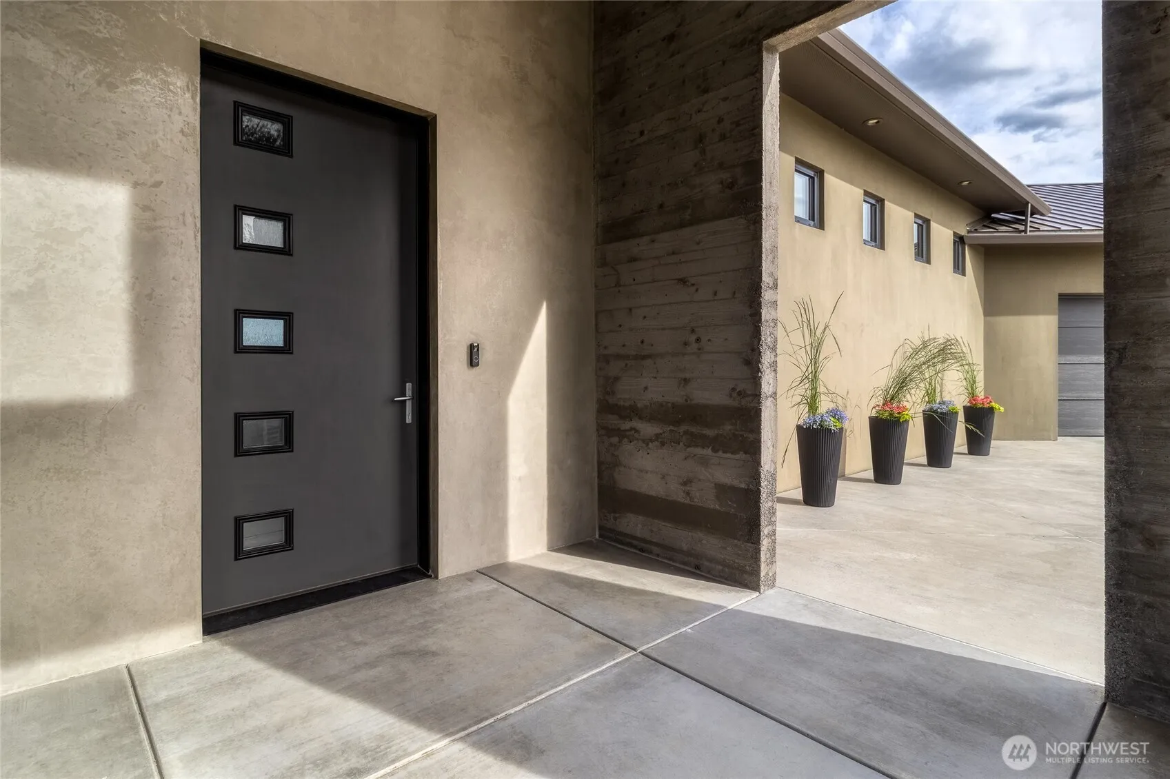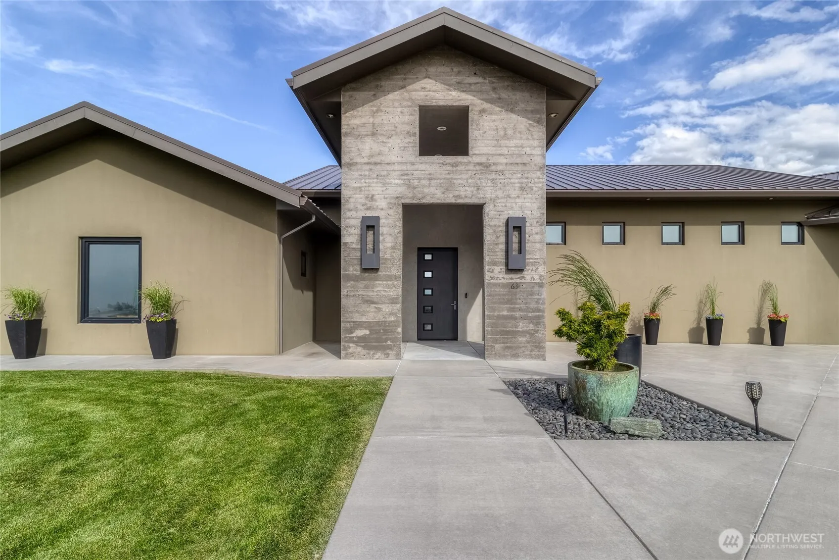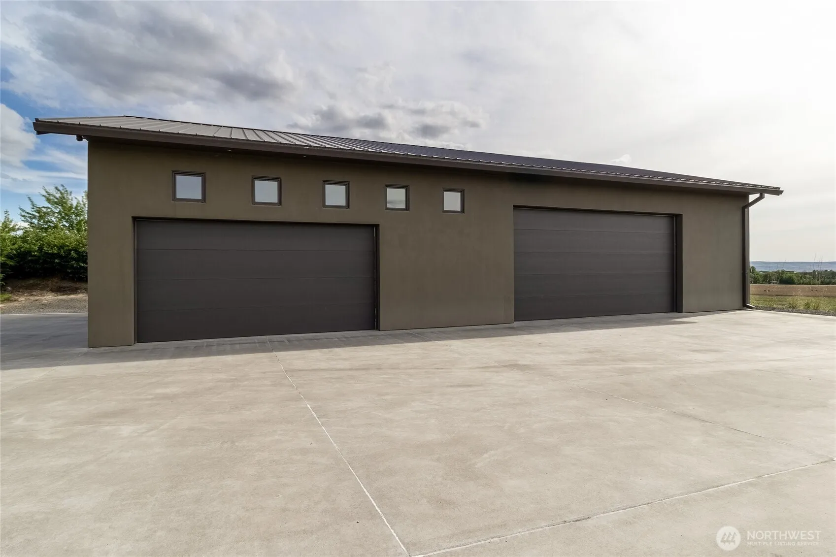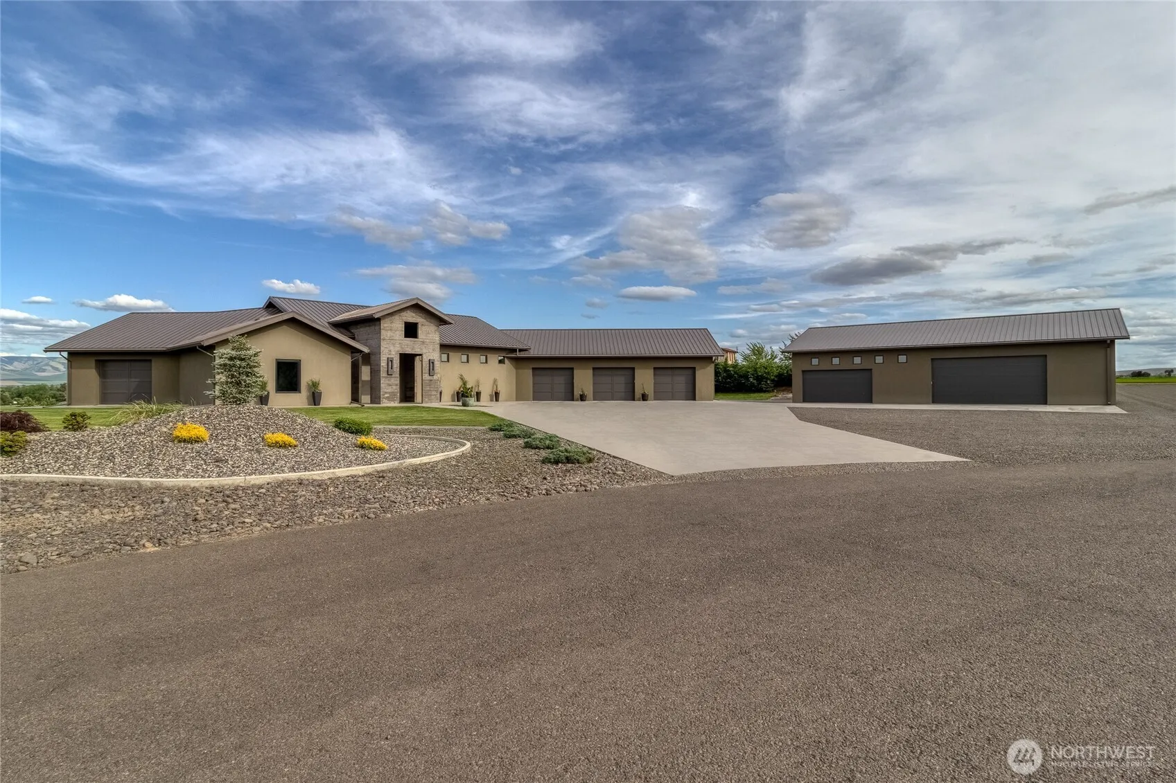You’ll appreciate the expansive view of the Blue Mountains from this elevated single-story home site. Concrete construction (ICF walls) improve soundproofing and temperature efficiency. Metal roofing ensures a roof that will last decades. There are 3 separate garages. 2 are attached to the main house and a detached 4-car garage/shop is next to the main home. The gradual sloping grassed yard to the rear is adjacent to an extensive concrete and wood (Fiburon) patio deck. A small, covered, pool/spa sits within the large patio space. The interior has 2 ensuite bedroom/baths & a large primary bathroom and walk-in closet. It also has a patio half bath. The home has engineered wood plank flooring as well as high ceilings with recessed lighting.