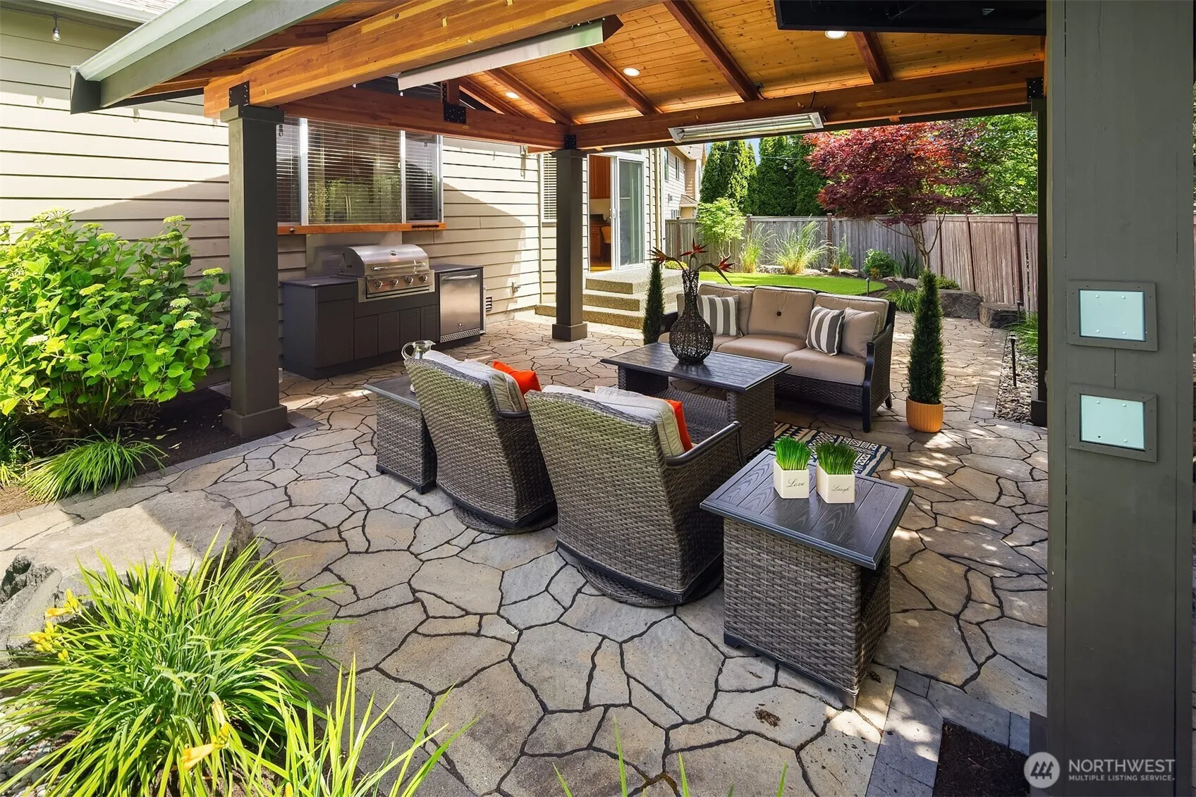 Luxury meets lifestyle in this stunning Murray Franklin resale, designed for both comfort and entertaining. Nearly 3,200 sq ft with 4 bedrooms, den and a bonus room – perfect for work and play. The open concept layout flows into a showstopping outdoor resort style retreat with a gas fire pit, dual ceiling heaters, mounted TV, BBQ island, and a beverage fridge. Synthetic turf and an extended patio create a low maintenance haven. Sports court for active fun. Wired for generator, 3 car garage, and set across from a charming toddler park. Fresh Interior paint & carpet! Walk to Timber Ridge Elementary, trails, shops & dining. Fresh interior paint and carpet! 7,236 sq ft lot – Welcome to Snoqualmie Ridge!