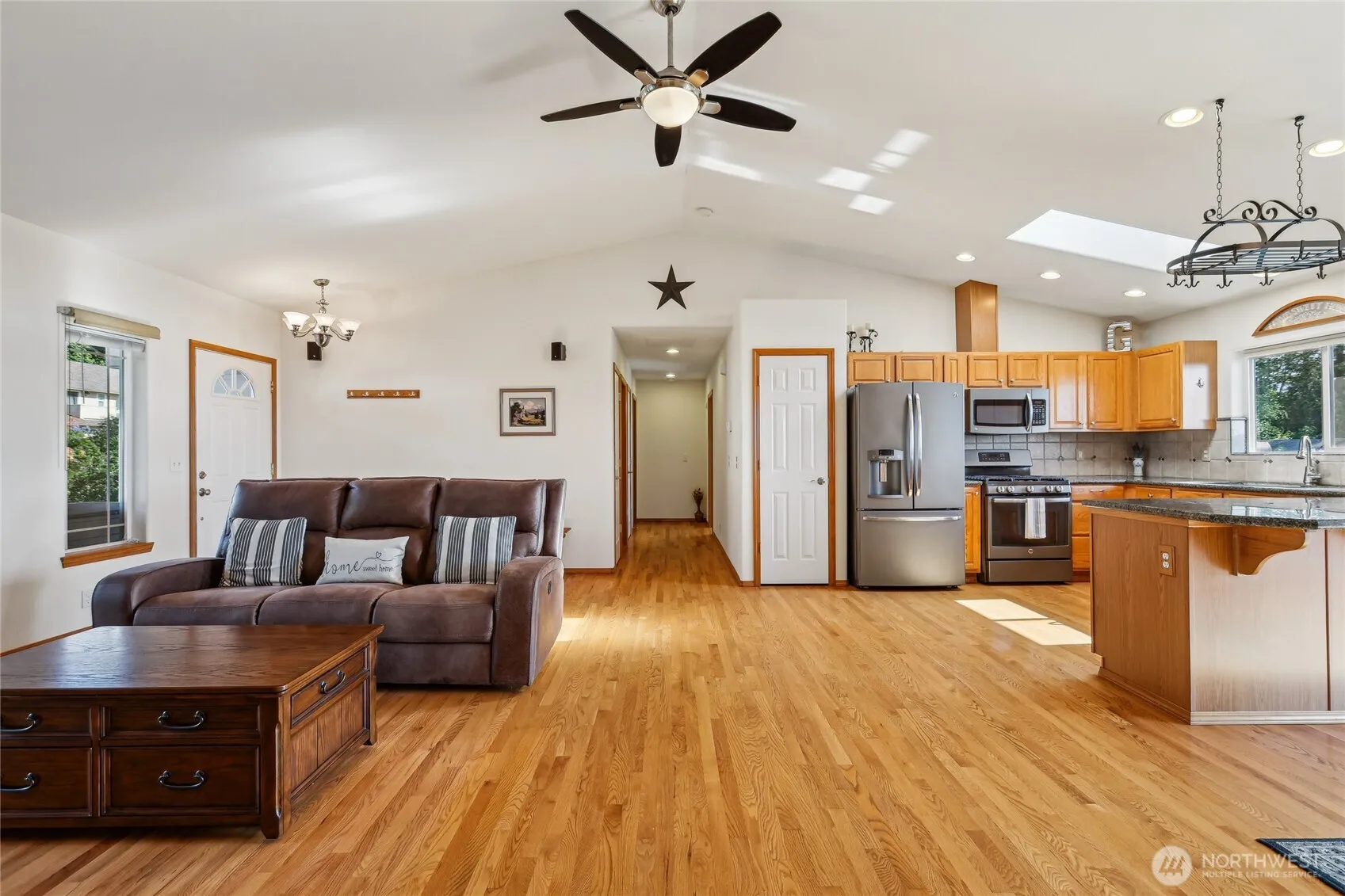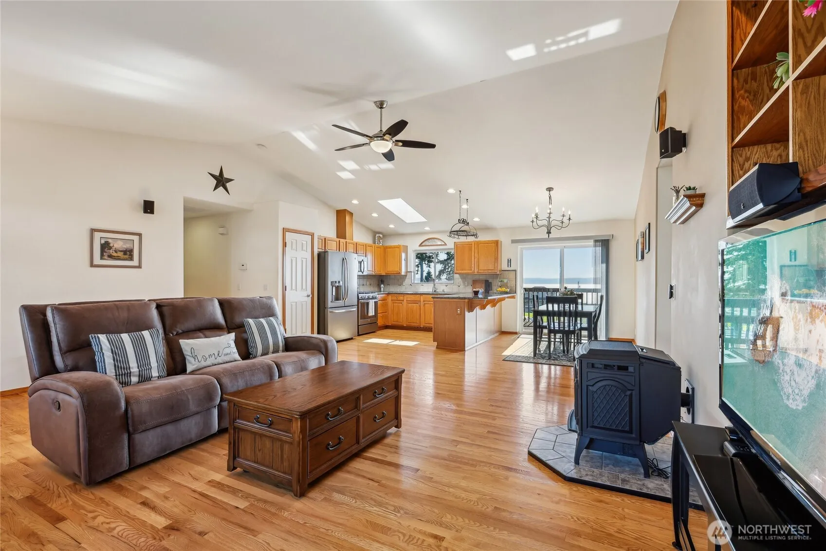 Welcome to your dream rambler with a daylight basement in Warm Beach, featuring breathtaking west-facing water views! This home offers convenient main-level living, complete with vaulted ceilings, a cozy pellet stove, and a spacious kitchen equipped with slate appliances. The primary suite includes a private deck, an updated en-suite bathroom, and a walk-in closet. The lower level boasts a large recreation room, a third bedroom, a ¾ bathroom, and a bonus room that can serve as an office or a fourth bedroom. Outside, you will find lush gardens, a view deck, a 2-car garage with an EV charger, and parking space for an RV or boat. Additionally, you can enjoy the community center, which features sports courts, picnic areas, and various events!