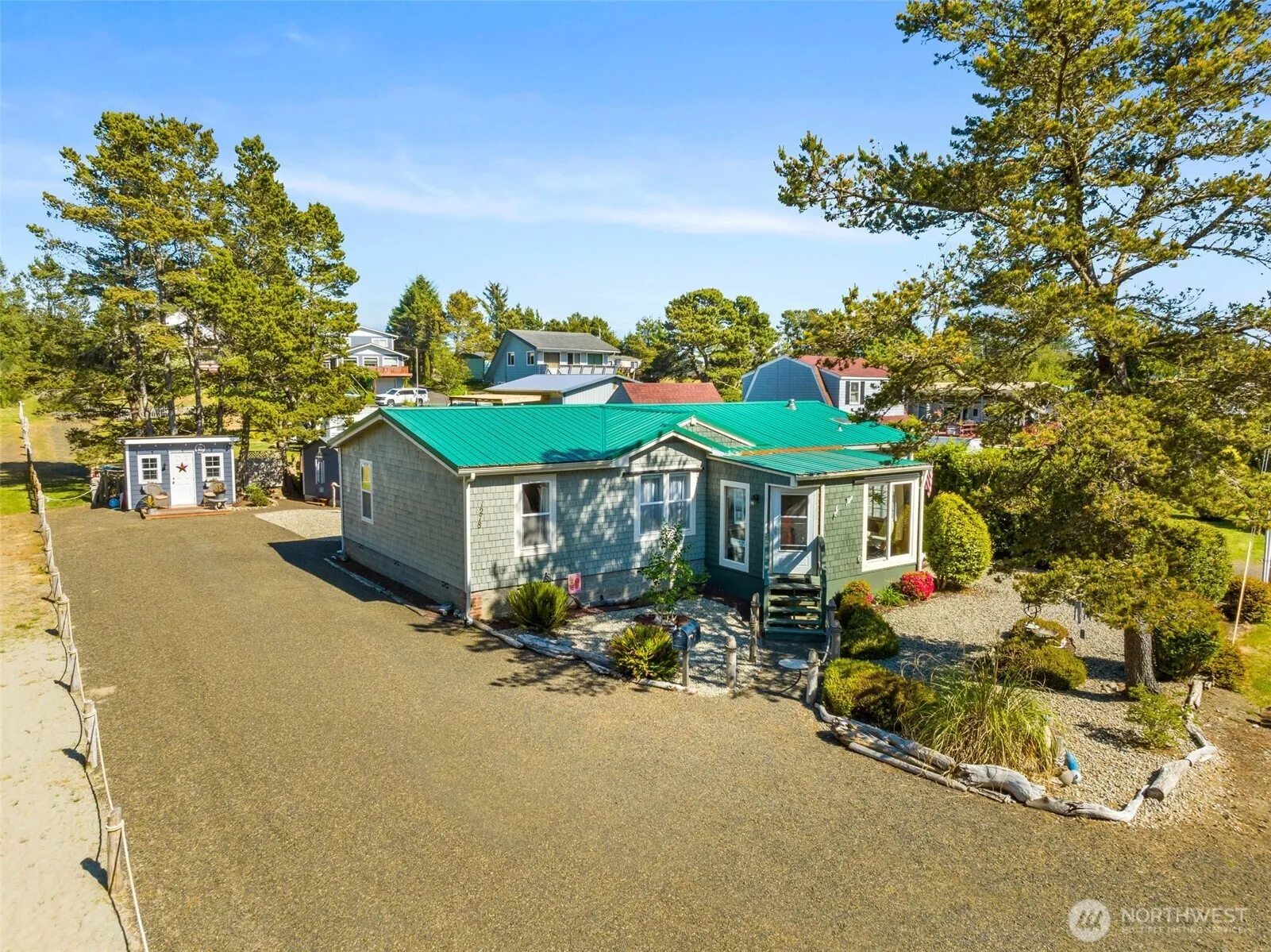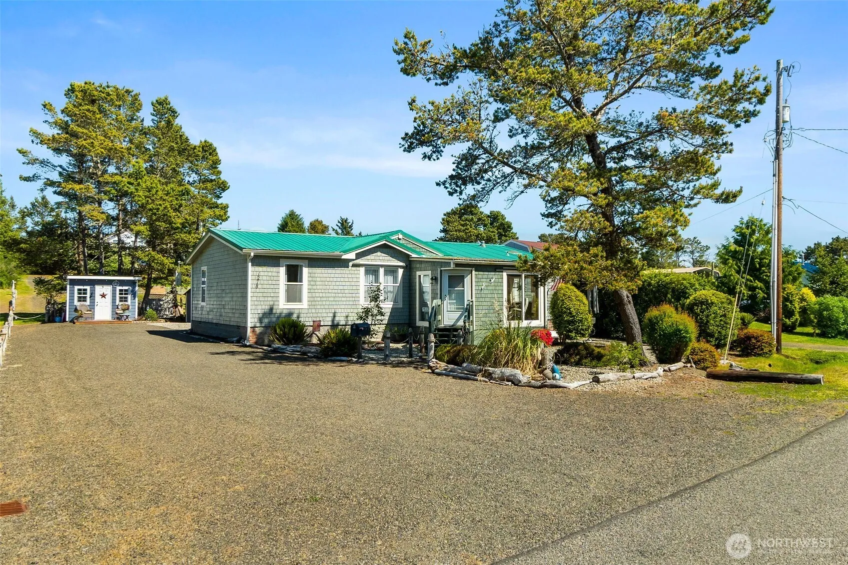 Perfect single story coastal home/retreat in quiet neighborhood! Beautifully updated 2-bedroom, 2-bath, features bonus room for guests or den. Charming sunroom entry with thoughtfully designed spacious open floor plan.Move-in ready home includes metal roof, vinyl windows, newer furnace and appliances, remodeled kitchen with stylish flooring & countertop.Property has a cozy Shed for office, solitude, yoga, hobbies; and a separate spacious Workshop.After walking to the beach on the private deeded trail, relax under the oversized covered deck ideal for quiet evenings or entertaining. This home offers the ultimate in convenience and seaside living. Rock landscaped yard makes it perfect for a full-time home or a vacation escape.