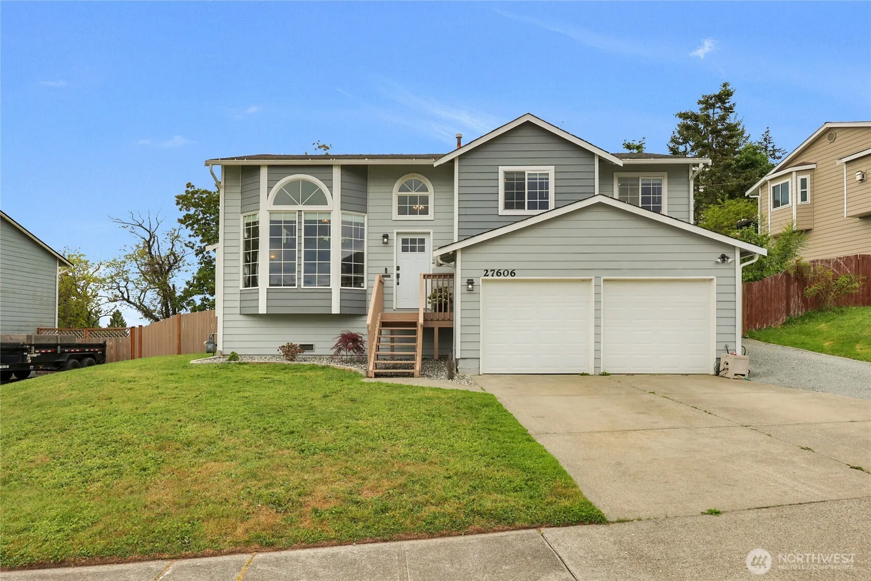 Welcome home! With 4 bedrooms and 2.5 bathrooms, this wonderfully designed California split welcomes you with its open light and bright floor plan including vaulted ceilings and sky lights. It has a huge bay window, and cozy fireplace in the living room. Upstairs is the kitchen with eating space, the dining room and a spectacular deck to view the Sound, Olympic Mountains and its massive fully fenced backyard with garden space and outbuildings for storage. The level ¼ acre lot allows room for an RV too, and the best part, no HOA to deal with. The home has a fantastic location as it is close to the Stanwood High School, Cedarcrest middle School, shopping, restaurants and I-5.