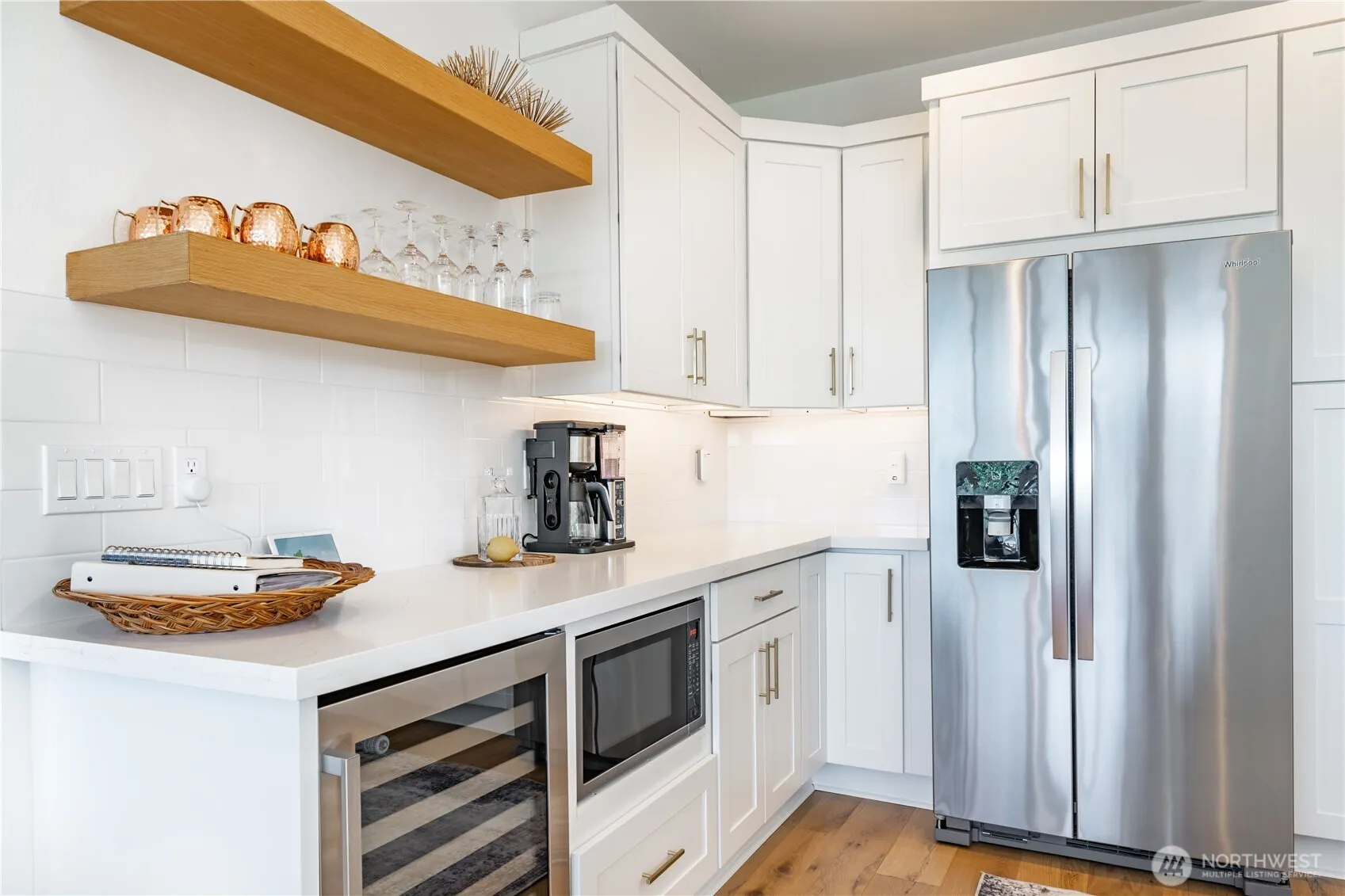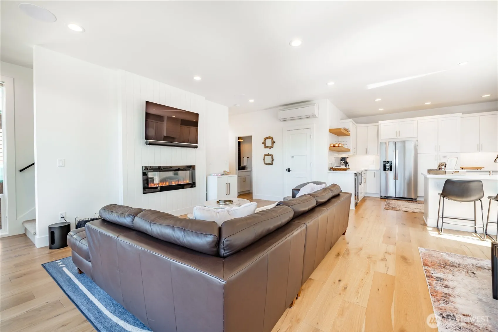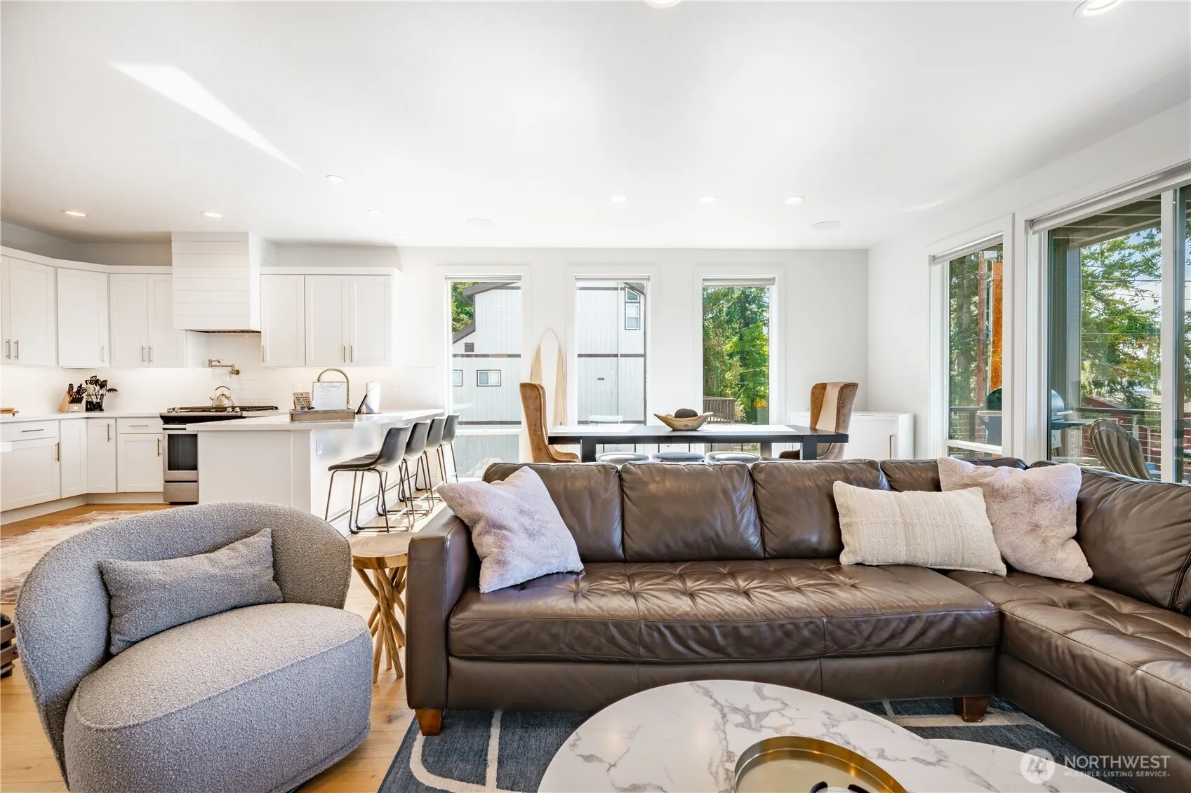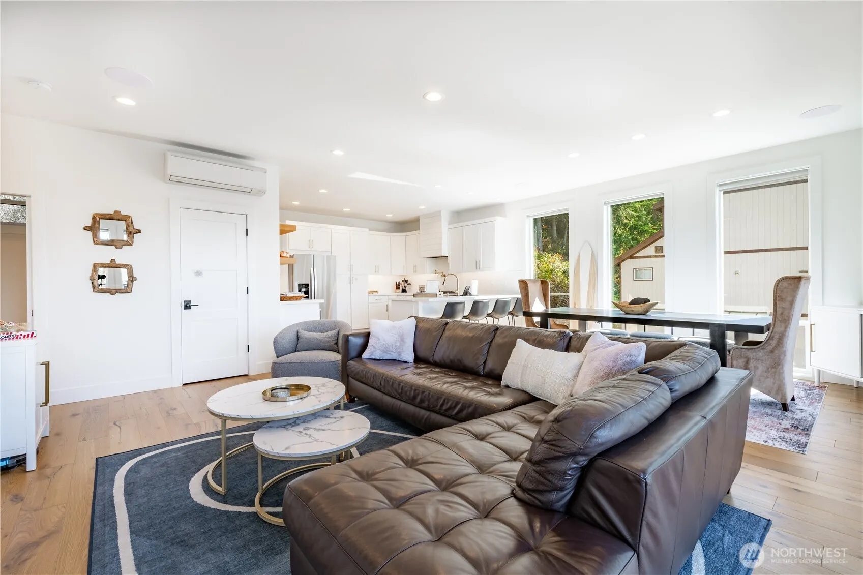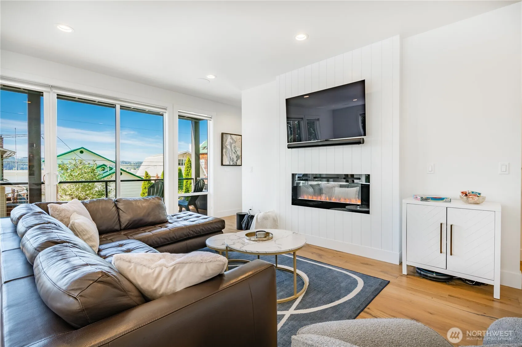 Experience the best of Sundin Beach in this impeccably designed coastal retreat. This modern home offers panoramic bay views and unforgettable sunsets. Step into the open-concept main level, a chef’s kitchen awaits with quartz countertops, stainless steel appliances, and a spacious living area. A wall of glass leads to a covered deck, creating the perfect indoor-outdoor setting for year-round entertaining. The primary suite features spa-inspired details: a walk-in shower, heated tile floors, and access to a second deck with sweeping views. Downstairs, a finished tandem garage with epoxy floors offers a heated flex space. Enjoy direct beach access across the street and rinse off in the outdoor shower after a day by the water.