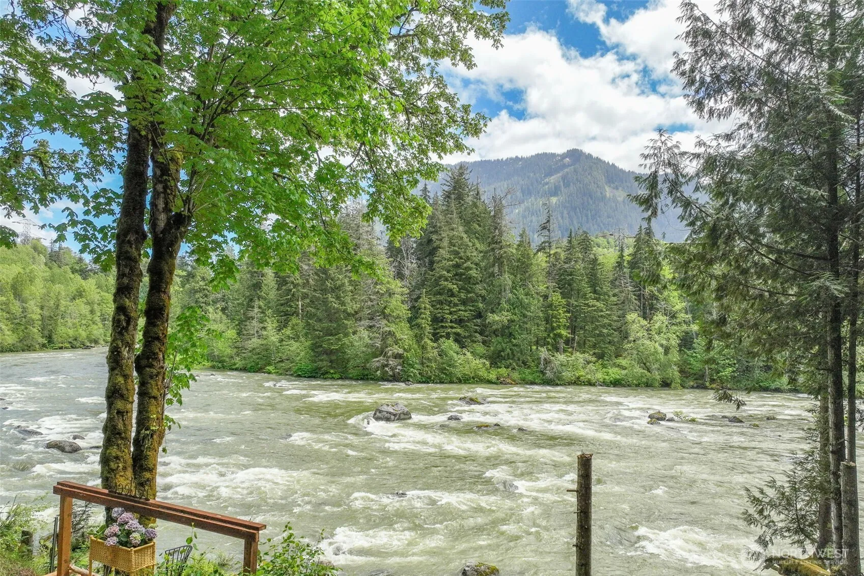 WATERFRONT MTN VIEW PROPERTY ~ 130 ft of prime riverfront on .73 acres. This private retreat includes two charming cabins, perfect for full-time living, vacationing, or short-term rentals. {Cottage} open concept, lg picture windows, kitchen, 1/2 bth, antique gas stove, wood stove, hot tub and spacious deck w/stunning views. {Bunkhouse} a versatile cabin w/full kitchen, 1/2 bth, 2 flex rooms, live edge bar, view deck(s) ideal for guests. Detached washhouse w/infrared heater, on demand, enclosed toilet & laundry. Upgraded roofs, permitted 4C 200-amp panel, Generac’s w/auto switch, remote heating/fans, led, LVP, windows, decks & more. Conex offers 20′ apt/20′ storage. {2} EV charging/RV/tent spaces/tons of prkg. Home to WORLD-CLASS recreation!