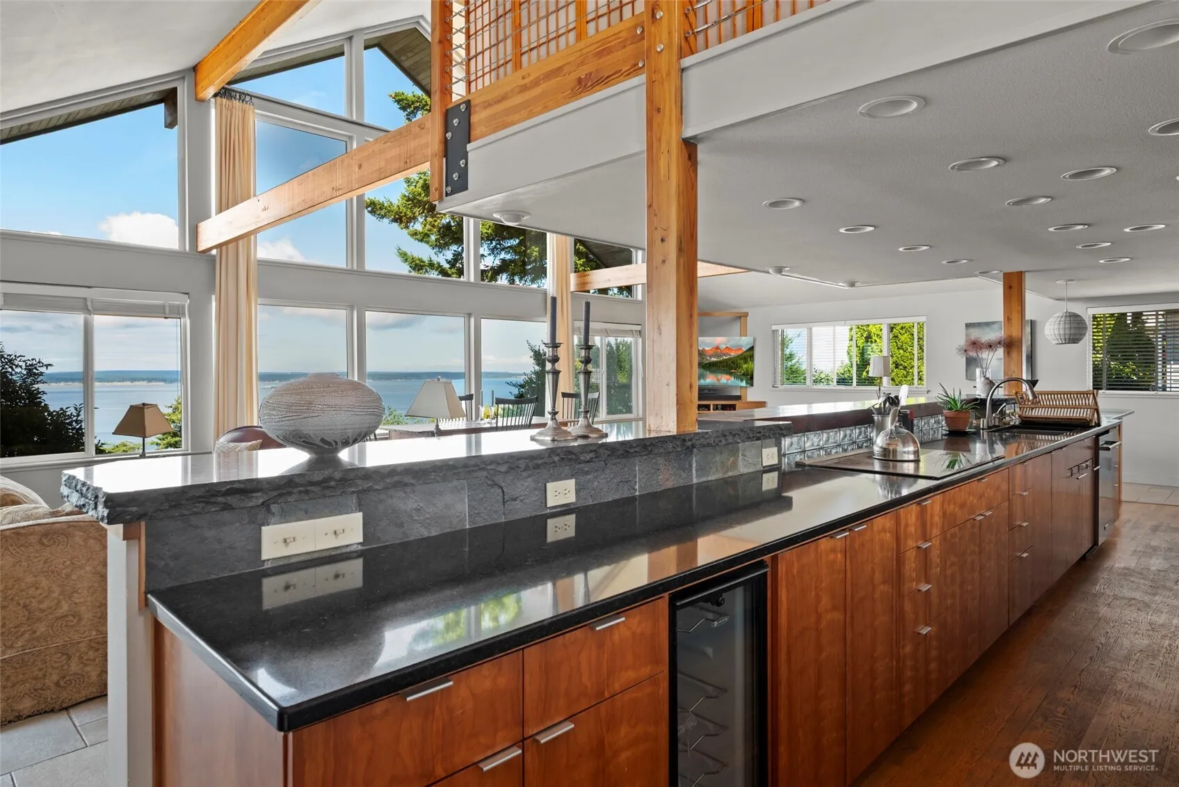 Breathtaking panoramic west side views of Puget Sound and the Olympic mountains greet you as you move through the foyer to the great room with cathedral ceilings and floor to ceiling windows. Open kitchen features granite counter tops and custom, local wood bar, new appliances, cherry cabinets and built-in shelves & pantry closet. New tile floors with radiant heat. Breathtaking views from upstairs loft and primary suite & den as well! Close to 3/4 of an acre of beautiful Rhodie gardens and lush landscaping to capture the natural beauty of northwest gardening. Circular driveway and oversized garage with a generous mud-room. Relax and enjoy the sunsets from the updated/newer gravel patio, deck and hot tub. Close to Freeland. Welcome Home!