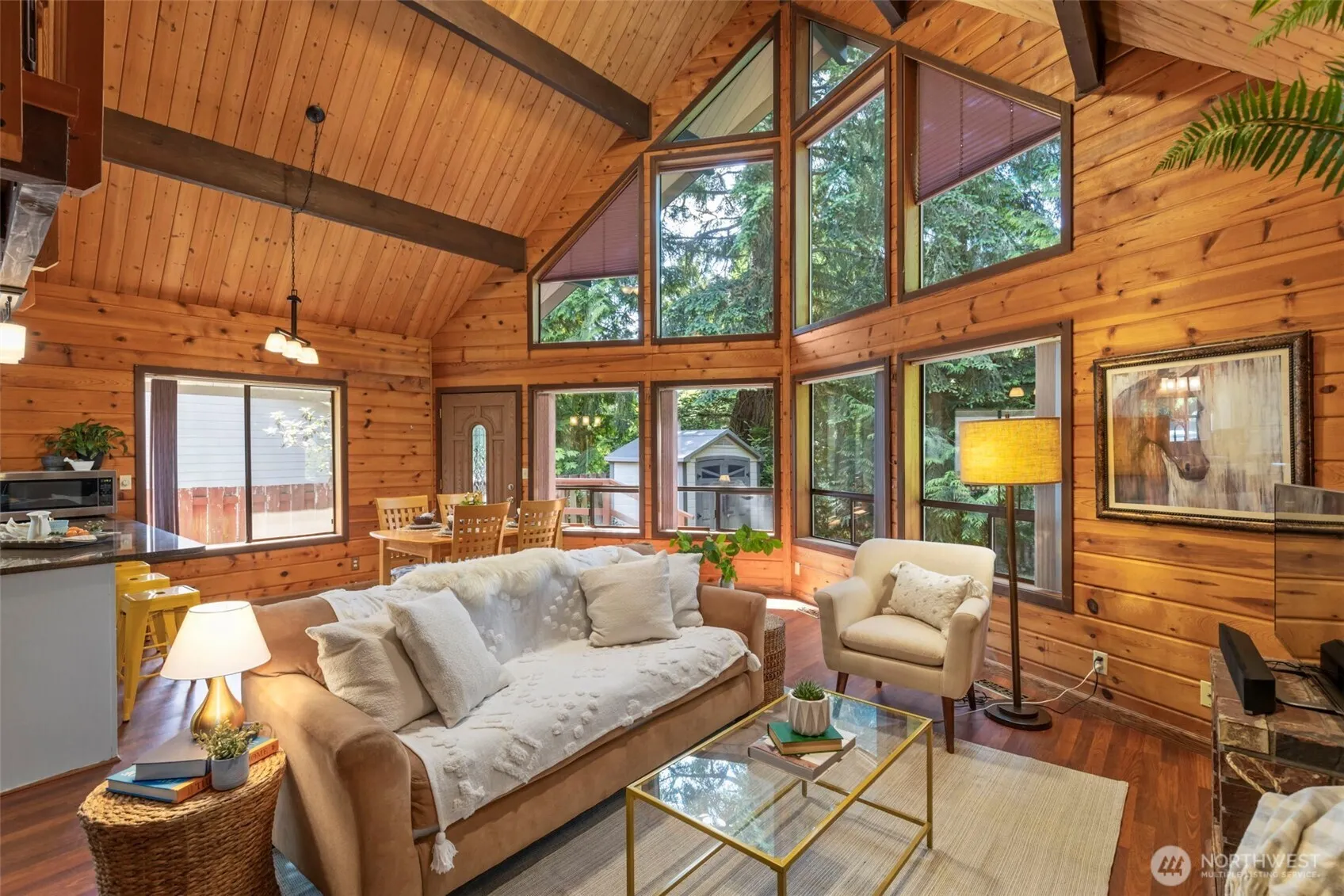 Welcome to your cozy and unique retreat that blends cabin charm with everyday convenience! This 3-bedroom, 2-bath home offers 1,440 sq ft of inviting living space featuring a great room with vaulted ceilings, floor-to-ceiling windows, a classic brick fireplace, pine shiplap walls and beamed wood ceilings that exude warmth and character. The loft provides a quiet workspace or flex space, while the spacious and private primary suite boasts a walk-in closet and a beautifully updated bath with a vessel tub. Relax on the covered front porch surrounded by nature. Enjoy the two-car garage w/ extra storage. Located just minutes from North Kitsap amenities, this desirable neighborhood also features a community pool, sport court, and beach access.