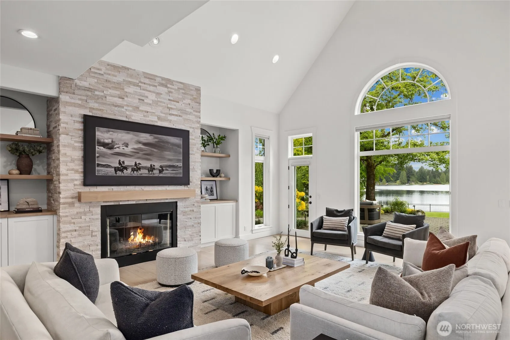 Your trophy parcel calls from the edge of serene Lake Joy. Here, pure magic awaits, cocooned by a lush, shy acre boasting 106′ of low bank lakefront with expansive dock and private pontoon to sail away those dreamy summer evenings. Step inside and be won over by soaring ceilings and walls of windows capturing soul-calming views. Sumptuous white oak grounds the greatroom, appointed with luxe finishes, new designer lighting, re-imagined Epicurean Center & butler’s bay, grand-scaled dining and custom built-ins flanking a stunning stacked-stone fireplace. The Owner’s suite is a study in indulgence with 5-pc bath and changing room. Tech-forward, A/C, rec/flex rooms, parking for a small fleet, storage at every turn & so much more. This. Is. Home.