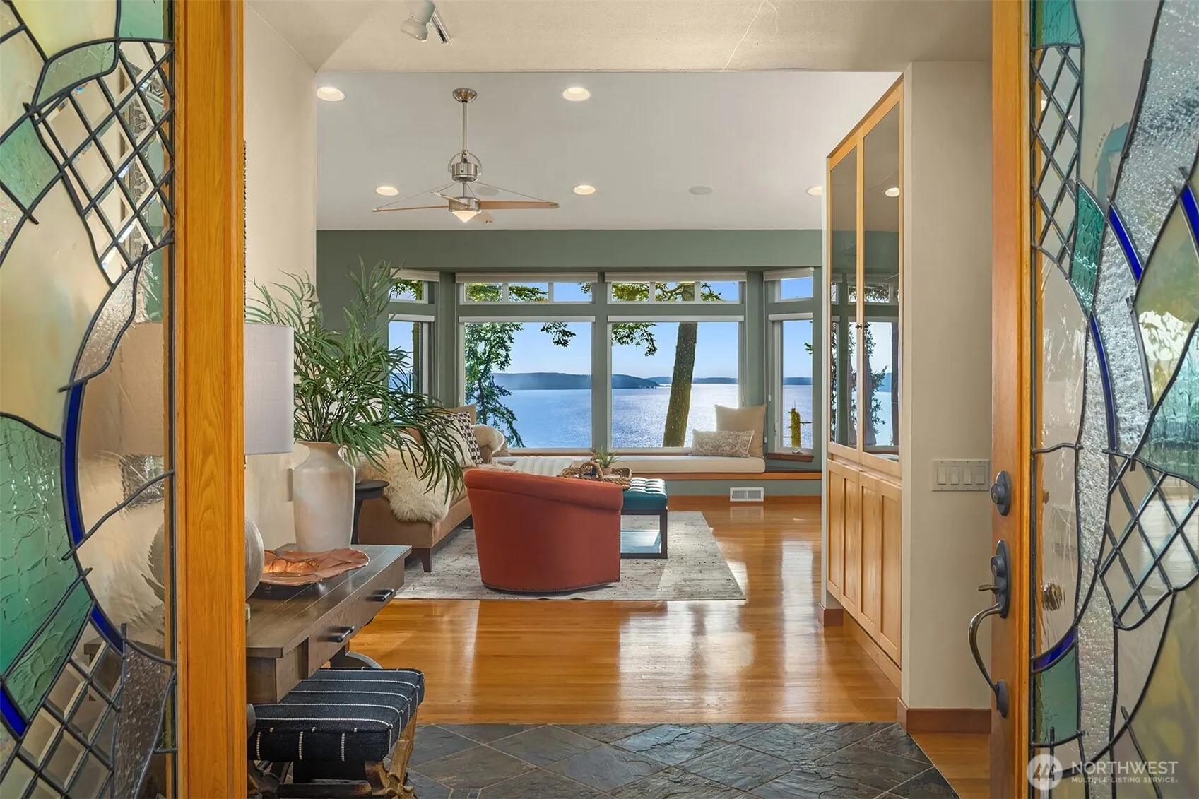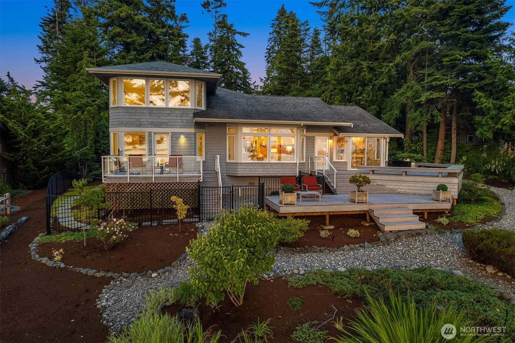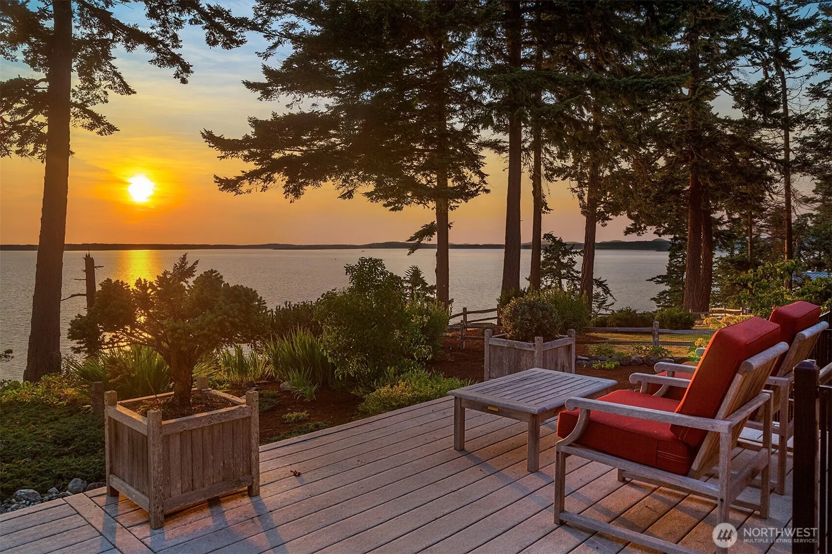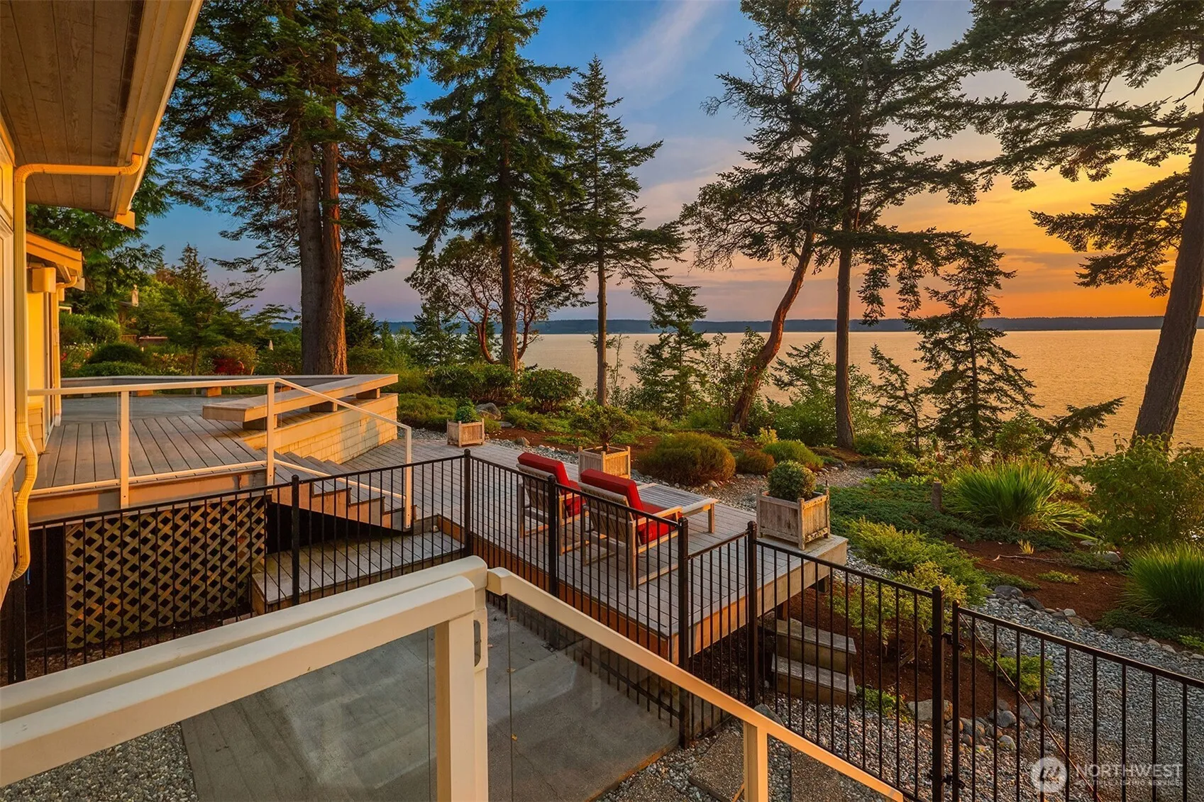 This west-facing waterfront estate in the coveted Madrona Beach area is set on 2.5 acres with 125′ of frontage w/tidelands. Designed for seamless indoor-outdoor living that captures sweeping views of Saratoga Pass, the Olympics, boat traffic, and stunning sunsets. Timeless PNW architecture frames the beauty of water and forest. Ideal for multi-generational living, it offers an impressive upper-level primary and a main-floor suite with ensuite bath and adjacent bedroom/study. A spacious office overlooks lush gardens. The large detached garage/workshop/cottage holds exciting potential—think future guest house, woodworking studio, or creative space. Just down the street, enjoy easy beach access. Properties like this rarely come to market!