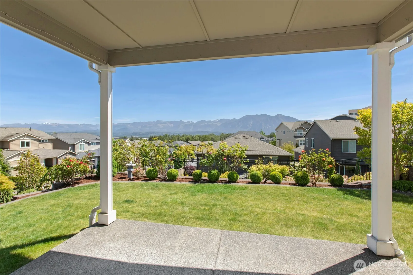Ahmazing Mt Si and Cascade Mtn VIEW home! Welcome to Eagle Pointe at Snoqualmie Ridge. Like-new, this sought-after Hamilton plan on a corner lot has too many upgrades to list. A covered porch, leaded glass front door to vaulted entry welcomes striking mountain views from all key oriented living spaces. A main floor en-suite, expansive gourmet kitchen w/ walk-in pantry, open office and great-room design is perfect for entertaining. Upstairs finds the primary view suite w/ two walk-in closets, plus open bonus and other rooms. Relax at the covered back patio surrounded by mesmerizing views and gardener’s oasis wrapped in a wrought iron fully fenced backyard perched above the street below. Did I mention the views? 2-car garage, ample storage.