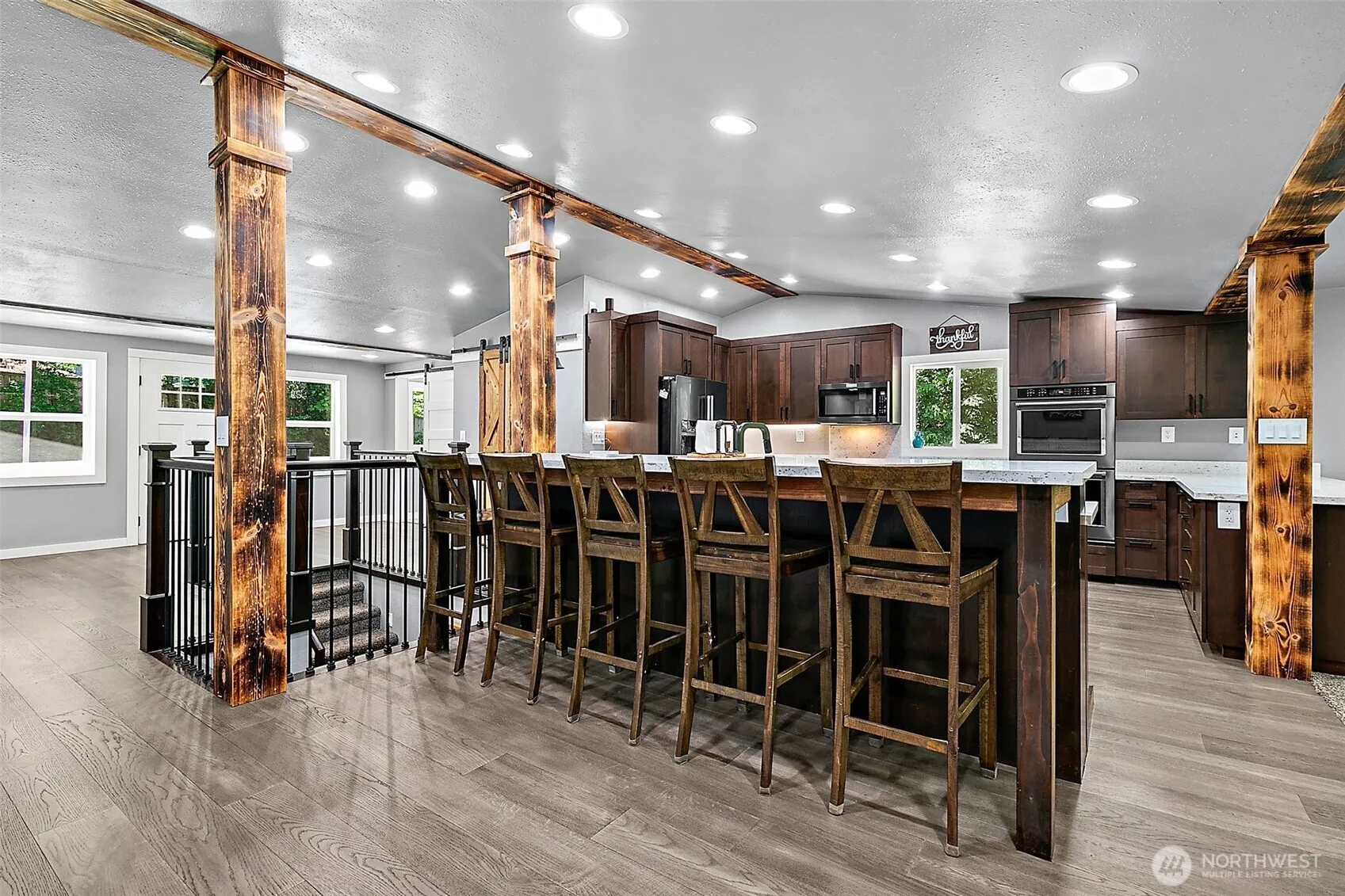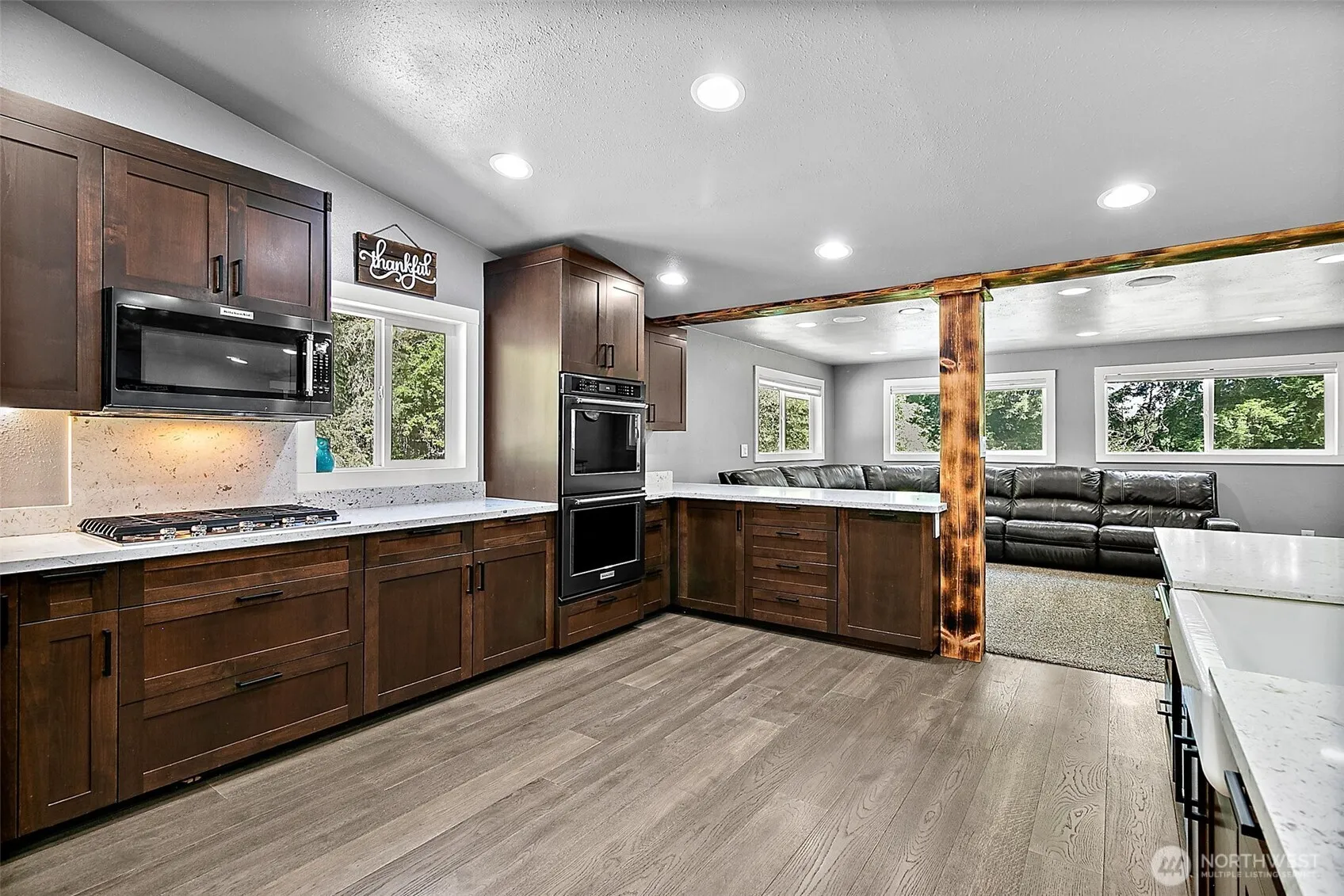 Welcome to your private woodland retreat! Nestled on an acre by Lake Francis, this beautifully remodeled home offers modern elegance and rustic charm. Inside, discover an open-concept layout with hardwood flooring, custom wood columns, and a gourmet kitchen featuring stainless appliances, quartz counters, and rich cabinetry. The spa-like primary bath boasts a soaking tub, dual vanity, and rainfall shower. Outdoor living shines with a large firepit area, expansive lawn, storage buildings, a fully-insulated office shed and wooded privacy. Solar panels and updated systems offer efficiency. A true Pacific Northwest gem—perfect for relaxation or entertaining.