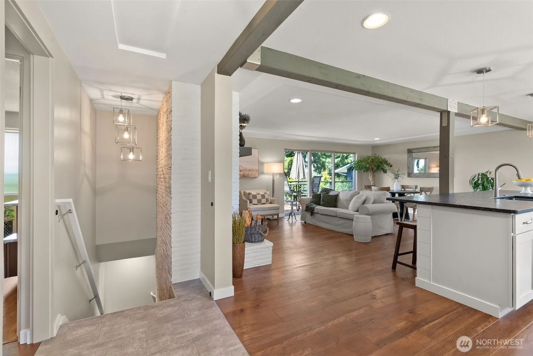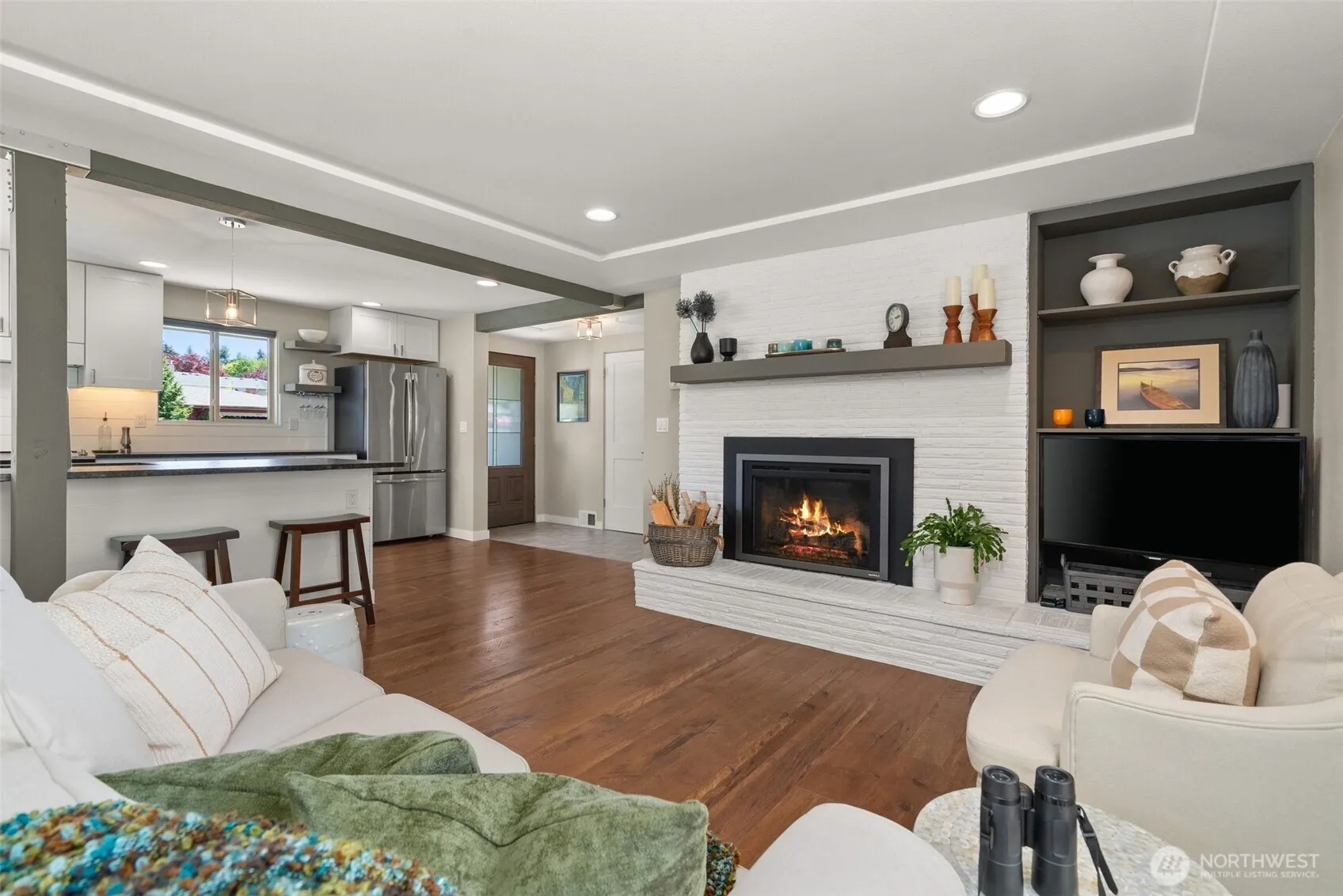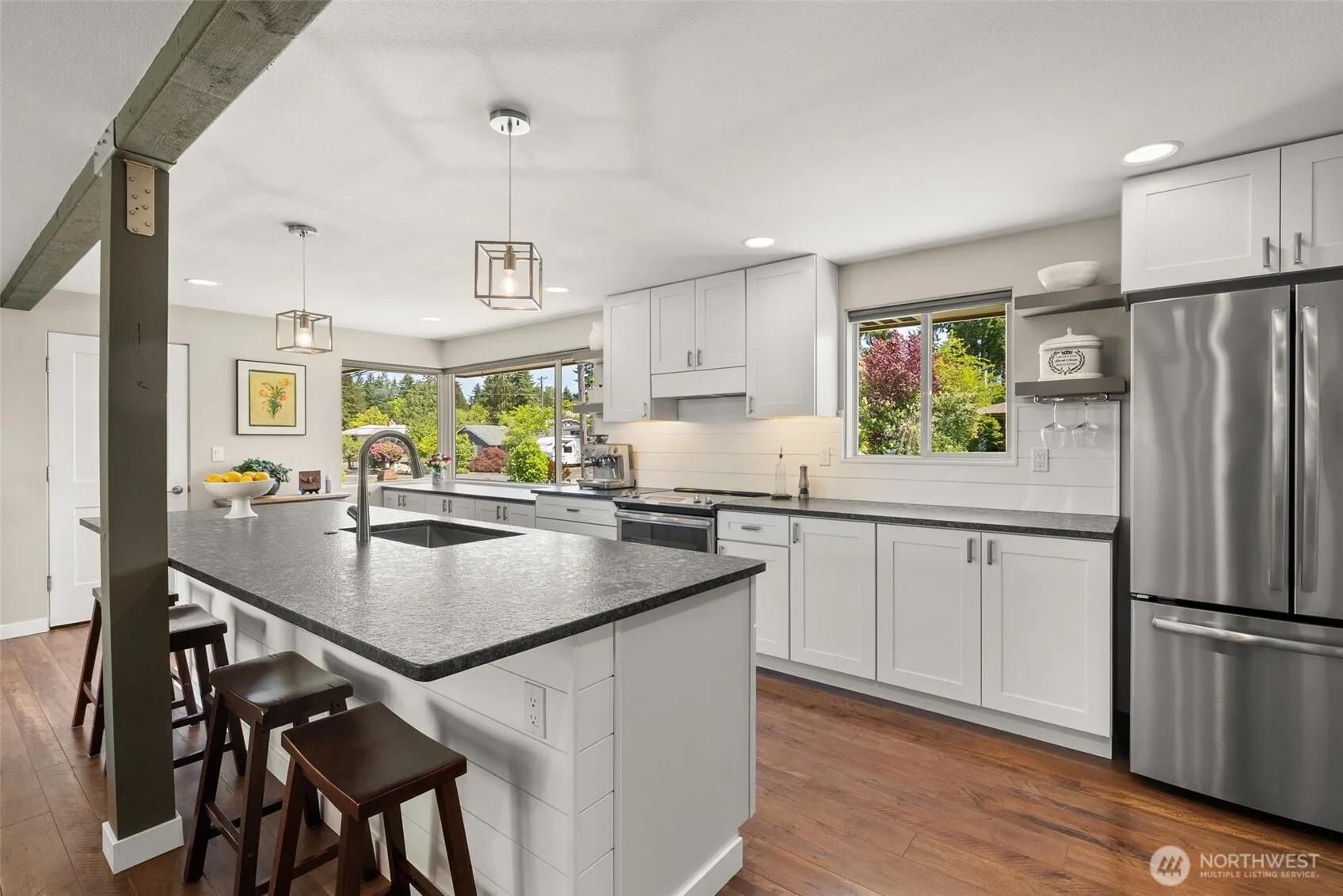 This house exudes modern elegance and still leaves room for a little nostalgia. The wide streets, manicured lawns, slight elevation and mature landscaping sets the tone as you arrive to find an exceptionally well-maintained home inviting you in. With a complete restoration in 2019 creating an open concept living plan, granite counters, slide out hood vent, extra large kitchen sink, cabinet pull outs, LVP flooring, heat pump, walk in shower, gas fireplaces, possible downstairs ADU with private entry, sprinkler system, adorable garden shed with power. The mountain and sound views are just the cherry on top of this property. Come see for yourself all the other features this home has to offer.