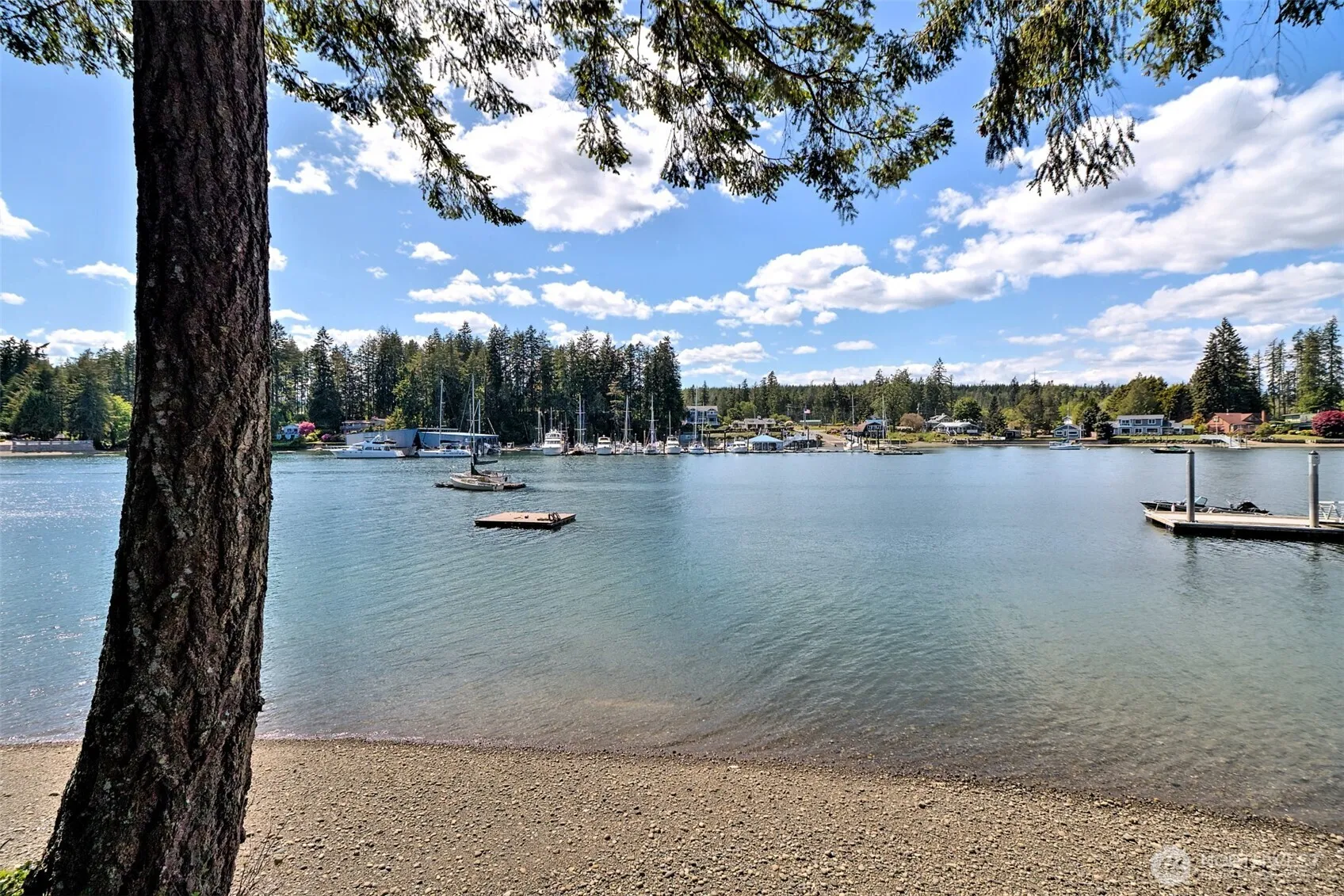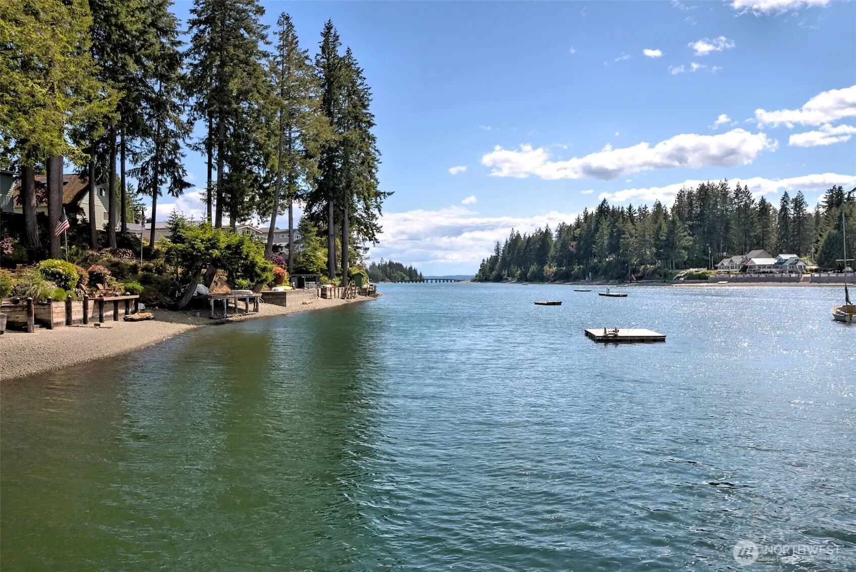 RARE TREASURE ISLAND WATERFRONT FOR SALE! What a great beach house layout with the living room, dining area and kitchen looking out to the water. Primary bedroom and bath on the main level, with two bedrooms and bath on the second. Vaulted ceiling plus lots of windows. Large wood deck to enjoy the view. Tons of room for storage of beach toys or equipment. Ideal beach for swimming, paddle boarding, boating, kayaks. Located next to the private community TI dock. West facing, across the bay from Fair Harbor Marina & Port of Grapeviewpublic boat launch. Town of Allyn and LakeLand Village Golf just a few minutes away.