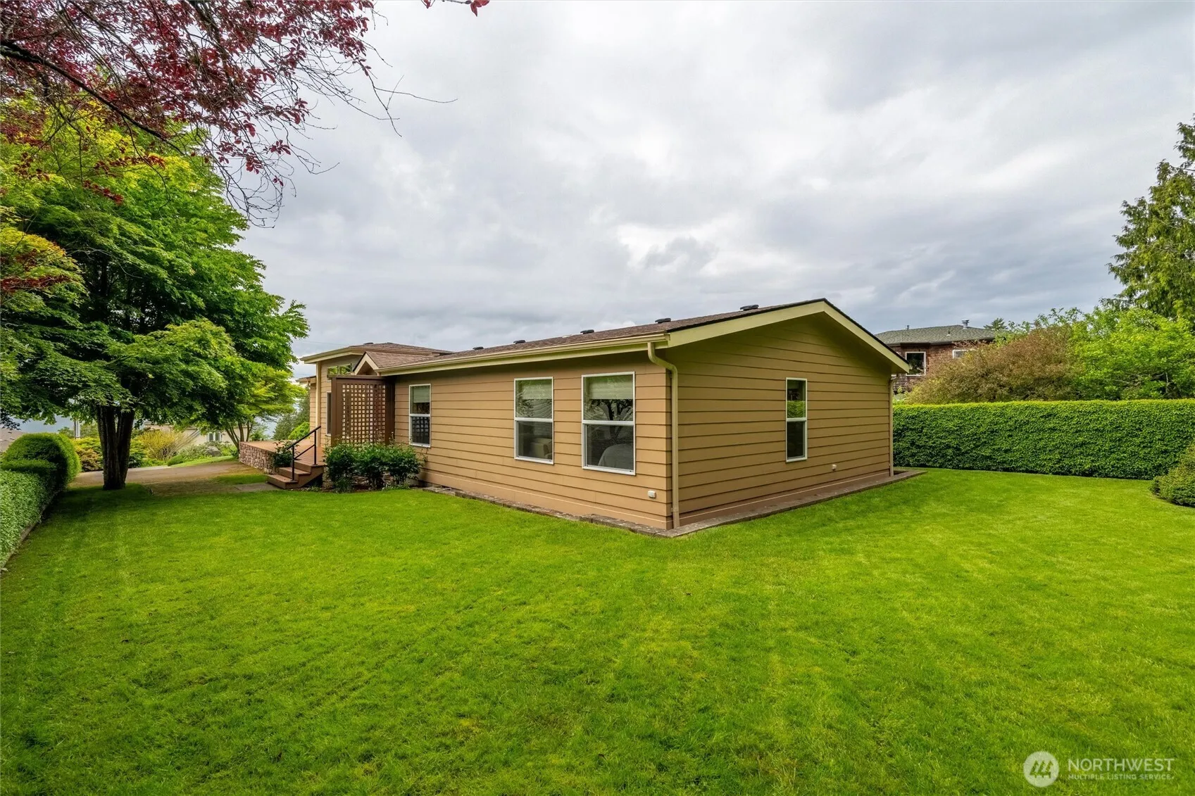 Discover your dream home in the serene Isle Aire community! This impressive manufactured home with spalted maple hardwood floors features two spacious bedrooms plus a versatile office/den, ideal for work-from-home flexibility. Enjoy the convenience of two full bathrooms, including an en-suite in the primary bedroom for added privacy. The open kitchen is perfect for culinary enthusiasts, while the standout outdoor kitchen provides stunning westerly views of the Strait of Georgia–an ideal setting for entertaining or relaxing. Nestled in a quiet neighborhood, this property is just a short walk from a private community beach, offering peaceful access to the shoreline. Plus, the expansive yard is a gardener’s dream, with endless potential.